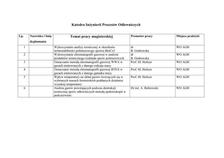 Katedra Inżynierii Procesów Odlewniczych Nazwisko i Imię Lp. Temat pracy magisterskiej Promotor pracy Miejsce praktyki dr B. Grabowska dr B. Grabowska Prof. M. Holtzer WO AGH Prof. M. Holtzer WO AGH Prof. M. Holtzer WO AGH Dr inż. A. Bobrowski WO AGH dyplomanta 1 2 3 4 5 6 Wykorzystanie analizy termicznej w określeniu termostabilności polimerowego spoiwa BioCo3 Wykorzystanie chromatografii gazowej w analizie produktów termicznego rozkładu spoiw polimerowych Oznaczanie metodą chromatografii gazowej WWA w gazach emitowanych z danego rodzaju masy Oznaczanie metodą chromatografii gazowej BTEX w gazach emitowanych z danego gatunku masy Wpływ temperatury na skład gazów tworzących się w wybranych masach formierskich poddanych działaniu wysokiej temperatury Analiza gazów powstających podczas destrukcji termicznej spoiw odlewniczych metodą spektroskopii w podczerwieni WO AGH WO AGH Nazwisko i Imię Lp. Temat pracy magisterskiej Promotor pracy Miejsce praktyki Dr inż. M. Łucarz Hala Maszyn Odlewniczych WO AGH Dr inż. M. Łucarz Hala Maszyn Odlewniczych WO AGH Dr inż. R. Dańko Hala Maszyn Odlewniczych WO AGH dyplomanta 1. 2. 3. lp 1 2 2 4 5 6 7 1 osoba 1 osoba 1-2 osoby Badanie wpływu wybranych parametrów pracy doświadczalnego regeneratora termicznego o zmiennej pozycji działania, w celu określenia optymalnych warunków realizacji regeneracji termicznej. Badania porównawcze procesu regeneracji termicznej w urządzeniu doświadczalnym dla poziomego i pionowego ułożenia komory regeneratora Badania porównawcze regeneracji zużytej masy formierskiej i rdzeniowej Temat pracy magisterskich Zastosowanie symulacji komputerowej do optymalizacji wybranej technologii odlewniczej Modelowanie przepływów hetero fazowych z wykorzystaniem programu Flow3D Modelowanie przepływów hetero fazowych z wykorzystaniem programu MagmaSoft promotor Prof. zw. dr hab. inż. Józef Suchy Optymalizacja technologii wykonania wybranego odlewu żeliwnego Zastosowanie systemu SimulationDB do gromadzenia i walidacji wyników symulacji wybranej grupy odlewów. Optymalizacja technologii wykonania wybranego odlewu z wykorzystaniem programu MagmaSoft. Zastosowanie programu MagmaSoft do optymalizacji układu wlewowego podczas odlewania ciśnieniowego wybranego odlewu. Dr inż. Paweł Malinowski Prof. zw. dr hab. inż. Józef Suchy Prof. zw. dr hab. inż. Józef Suchy Dr inż. Paweł Malinowski Dr inż. Janusz Lelito Dr inż. Janusz Lelito dyplomant 8 Wyznaczenie funkcji gęstości ziaren wybranego stopu w oparciu o model Oldfielda i Frasia Dr inż. Janusz Lelito 9 10 Lp. 1 2 3 4 Nazwisko i Imię dyplomanta Temat pracy Promotor pracy Weryfikacja modelu ruchu ślizgowego i tocznego ziaren śrutu wzdłuż łopatek roboczych oczyszczarki wirnikowej Dr inż. P. Zyzak Dr inż. P. Zyzak Badania modelowe procesu obróbki strumieniowo-ściernej Opracowanie klasycznych modelu systemowego wykonywania form w technologii mas Kryteria optymalizacji projektowania struktury przestrzennej w odlewniach Dr inż. M. Brzeziński Prof. zw. dr hab. inż. R Wrona 5 Modelowanie i symulacja w środowisku MATLAB/Simulink pracy żeliwiaka zwykłego Dr hab. inż. Eugeniusz pracującego na zimnym dmuchu Ziółkowski, prof. nadzw. AGH 6 Opracowanie koncepcji modernizacji prototypowego aparatu do pomiaru adhezji i kohezji spoiw formierskich Dr inż. Krzysztof Smyksy Miejsce praktyki