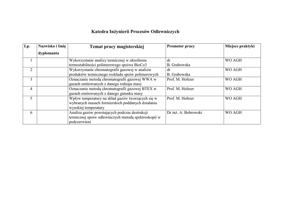 Katedra Inżynierii Procesów Odlewniczych Temat pracy magisterskiej