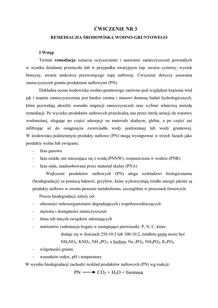 ĆWICZENIE NR 3 REMEDIACJIA ŚRODOWISKA WODNO-GRUNTOWEGO I Wstęp Termin remediacja oznacza oczyszczanie i usuwanie zanieczyszczeń powstałych w wyniku działania przemysłu lub w przypadku awaryjnym (np. awaria cysterny, wyciek benzyny, awaria tankowca przewożącego ropę naftową). Ćwiczenie dotyczy usuwania zanieczyszczeń gruntu produktami naftowymi (PN). Dokładna ocena środowiska wodno-gruntowego zarówno pod względem krążenia wód jak i stopnia zanieczyszczenia jest bardzo istotna i stanowi domenę badań hydrologicznych, które pozwalają określić warunki migracji zanieczyszczeń oraz wybrać właściwą metodę remediacji. Po wycieku produktów naftowych przechodzą one przez strefę aeracji do warstwy wodonośnej, ulegając po części adsorpcji na materiale skalnym, glebie, a po części zaś infiltrując aż do osiągnięcia zwierciadła wody podziemnej lub wody gruntowej. W środowisku podziemnym produkty naftowe (PN) mogą występować w trzech fazach jako produkty wolne lub związane: - faza gazowa - faza ciekła: nie mieszająca się z wodą (PNNW), rozpuszczona w wodzie (PNR) - faza stała, zaadsorbowana przez materiał skalny (PNA) Większość produktów naftowych (PN) ulega rozkładowi biologicznemu (biodegradacji) za pomocą bakterii, grzybów, które wykorzystują źródło energii jakimi są produkty naftowe w swoim procesie metabolizmu, szczególnie w procesach tlenowych. Proces biodegradacji zależy od: - obecności mikroorganizmów degradujących i współzawodniczących - stężenia i dostępności zanieczyszczeń - tlenu lub innych związków utleniających - nutrientów (substancje bogate w następujące pierwiastki: P, N, C, które dodaje się w ilościach 250:10:3 lub 100:10:2, źródłem azotu może być NH4NO3, KNO3, NH 4PO3, a fosforu: Na 3PO4, NH4PO4, K3PO4 - wilgotności gruntu - warunków redox, pH i temperatury W wyniku biodegradacji zachodzi rozkład produktów naftowych (PN) wg reakcji: PN CO2 + H2O + biomasa Metody oczyszczania środowiska wodno-gruntowego polegają na unieruchomieniu zanieczyszczeń poprzez zastosowanie izolacji lub likwidacji zanieczyszczeń (różne formy remediacji). Usuwanie zanieczyszczeń może odbywać się w miejscu, gdzie ono powstało - dekontaminacja In-Situ (IS) lub innym miejscu poprzez wybieranie gruntu lub odpompowywanie skażonej wody - dekontaminacja Ex-Situ (ES). Metody remediacji: 1. Fizykochemiczne: termiczna (RT), ekstrakcyjna (RE), elektroreklamacja (ER) 2. Biologiczne Ad.1. Remediacja termiczna polega na cieplnej obróbce wybranego gruntu: - spalenie PN w temp. powyżej 1300 K - podgrzewanie, piroliza do temperatury 900 K, a następnie spalanie gazu pirolitycznego Remediacja ekstrakcyjna polega na płukaniu gruntu czyli na przeniesieniu zanieczyszczeń PN do medium płuczącego (woda lub woda z dodatkiem substancji chemicznych). Elektroreklamacja a. elektroosmoza – polega na ruchu zanieczyszczonej wody porowej między elektrodami b. elektroforeza – ruch cząstek pod działaniem pola elektrycznego c. elektroliza – ruch jonów lub kompleksów między elektrodami Ad.2. Landfarming LF polega na umieszczeniu skażonego gruntu PN w warstwach o grubości O,5-1,5 m na nieprzepuszczalnym podłożu wyposażonym w system drenażowy. Następuje biodegradacja aerobowa PN wspomagana dodatkiem tlenu, nutrientów i wody. Czas trwania LF od 1-3 lat. Bioreaktory, w reaktorach specjalnej konstrukcji, zachodzą procesy biodegradacji wspomagane mikroorganizmami i podwyższoną temperaturą. Czas reakcji jest dużo krótszy, 3 doby do miesiąca w zależności od temperatury. II. Wykonanie ćwiczenia Uśrednioną próbkę gruntu poddajemy remediacji ekstrakcyjnej. W tym celu odważamy na wadze technicznej 50 g skażonego PN gruntu, wsypujemy do zlewki 400 ml i dodajemy porcjami po 50 cm3 gorącą destylowaną wodę, mieszamy bagietką i dekantujemy roztwór z nad osadu. Proces powtarzamy 3-krotnie. Wodę z rozpuszczonymi produktami naftowymi oziębiamy i przenosimy do rozdzielacza. Po rozdzieleniu się warstw, warstwę wodną odrzucamy, natomiast w warstwie olejowej oznaczamy zawartość PN. Drugim roztworem ekstrakcyjnym jest gorąca woda z dodatkiem detergentu. Sposób postępowania jak wyżej. Trzecim roztworem ekstrakcyjnym jest gorąca woda z dodatkiem 10% roztworu wodorotlenku potasu. W przypadku stosowania detergentu lub zasady do ostatniej ekstrakcji należy użyć tylko gorącej wody destylowanej. Sprawdzić odczyn roztworu na koniec przemywania. Wyniki oznaczeń przedstawić w postaci tabelki: Masa lub objętość PN Rodzaj próby Ilość Ziemia + PN Rodzaj roztworu ekstrakcyjnego gorąca woda (1) woda z dodatkiem detergentu woda z dodatkiem KOH Obliczyć zawartość PN w gruncie w % mas. przyjmując masę właściwą produktu naftowego PN = 790 kg/m3.