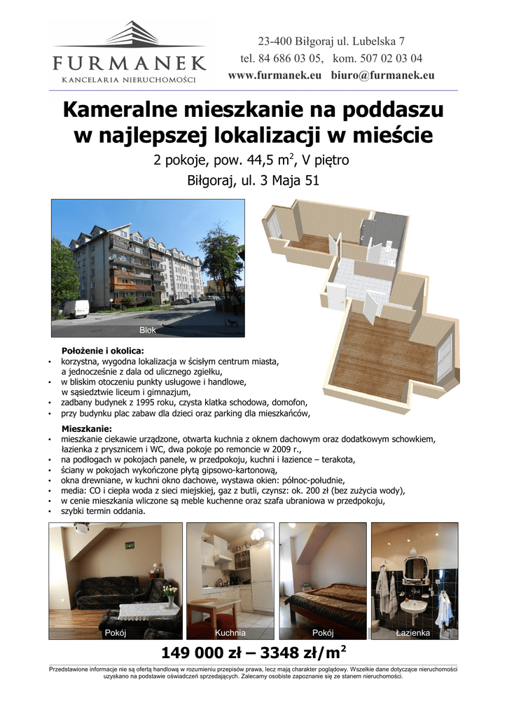 23-400 Biłgoraj ul. Lubelska 7 tel. 84 686 03 05, kom. 507 02 03 04 www.furmanek.eu [email protected] ________________________________________________________________________________________________________________________ Kameralne mieszkanie na poddaszu w najlepszej lokalizacji w mieście 2 pokoje, pow. 44,5 m2, V piętro Biłgoraj, ul. 3 Maja 51 Blok • • • • • • • • • • • Położenie i okolica: korzystna, wygodna lokalizacja w ścisłym centrum miasta, a jednocześnie z dala od ulicznego zgiełku, w bliskim otoczeniu punkty usługowe i handlowe, w sąsiedztwie liceum i gimnazjum, zadbany budynek z 1995 roku, czysta klatka schodowa, domofon, przy budynku plac zabaw dla dzieci oraz parking dla mieszkańców, Mieszkanie: mieszkanie ciekawie urządzone, otwarta kuchnia z oknem dachowym oraz dodatkowym schowkiem, łazienka z prysznicem i WC, dwa pokoje po remoncie w 2009 r., na podłogach w pokojach panele, w przedpokoju, kuchni i łazience – terakota, ściany w pokojach wykończone płytą gipsowo-kartonową, okna drewniane, w kuchni okno dachowe, wystawa okien: północ-południe, media: CO i ciepła woda z sieci miejskiej, gaz z butli, czynsz: ok. 200 zł (bez zużycia wody), w cenie mieszkania wliczone są meble kuchenne oraz szafa ubraniowa w przedpokoju, szybki termin oddania. Pokój Kuchnia Pokój Łazienka 149 000 zł – 3348 zł/m2 ____________________________________________________________________________________________________________________________________________________________________________________________________________________________ Przedstawione informacje nie są ofertą handlową w rozumieniu przepisów prawa, lecz mają charakter poglądowy. Wszelkie dane dotyczące nieruchomości uzyskano na podstawie oświadczeń sprzedających. Zalecamy osobiste zapoznanie się ze stanem nieruchomości.