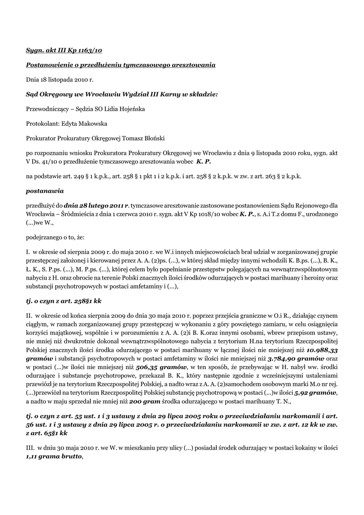 Sygn. akt III Kp 1163/10 Postanowienie o przedłużeniu tymczasowego aresztowania Dnia 18 listopada 2010 r. Sąd Okręgowy we Wrocławiu Wydział III Karny w składzie: Przewodniczący – Sędzia SO Lidia Hojeńska Protokolant: Edyta Makowska Prokurator Prokuratury Okręgowej Tomasz Błoński po rozpoznaniu wniosku Prokuratora Prokuratury Okręgowej we Wrocławiu z dnia 9 listopada 2010 roku, sygn. akt V Ds. 41/10 o przedłużenie tymczasowego aresztowania wobec K. P. na podstawie art. 249 § 1 k.p.k., art. 258 § 1 pkt 1 i 2 k.p.k. i art. 258 § 2 k.p.k. w zw. z art. 263 § 2 k.p.k. postanawia przedłużyć do dnia 28 lutego 2011 r. tymczasowe aresztowanie zastosowane postanowieniem Sądu Rejonowego dla Wrocławia – Śródmieścia z dnia 1 czerwca 2010 r. sygn. akt V Kp 1018/10 wobec K. P., s. A.i T.z domu F., urodzonego (...)we W., podejrzanego o to, że: I. w okresie od sierpnia 2009 r. do maja 2010 r. we W.i innych miejscowościach brał udział w zorganizowanej grupie przestępczej założonej i kierowanej przez A. A. (2)ps. (...), w której skład między innymi wchodzili K. B.ps. (...), B. K., Ł. K., S. P.ps. (...), M. P.ps. (...), której celem było popełnianie przestępstw polegających na wewnątrzwspólnotowym nabyciu z H. oraz obrocie na terenie Polski znacznych ilości środków odurzających w postaci marihuany i heroiny oraz substancji psychotropowych w postaci amfetaminy i (...), tj. o czyn z art. 258§1 kk II. w okresie od końca sierpnia 2009 do dnia 30 maja 2010 r. poprzez przejścia graniczne w O.i R., działając czynem ciągłym, w ramach zorganizowanej grupy przestępczej w wykonaniu z góry powziętego zamiaru, w celu osiągnięcia korzyści majątkowej, wspólnie i w porozumieniu z A. A. (2)i B. K.oraz innymi osobami, wbrew przepisom ustawy, nie mniej niż dwukrotnie dokonał wewnątrzwspólnotowego nabycia z terytorium H.na terytorium Rzeczpospolitej Polskiej znacznych ilości środka odurzającego w postaci marihuany w łącznej ilości nie mniejszej niż 10.988,33 gramów i substancji psychotropowych w postaci amfetaminy w ilości nie mniejszej niż 3.784,90 gramów oraz w postaci (...)w ilości nie mniejszej niż 506,35 gramów, w ten sposób, że przebywając w H. nabył ww. środki odurzające i substancje psychotropowe, przekazał B. K., który następnie zgodnie z wcześniejszymi ustaleniami przewiózł je na terytorium Rzeczpospolitej Polskiej, a nadto wraz z A. A. (2)samochodem osobowym marki M.o nr rej. (...)przewiózł na terytorium Rzeczpospolitej Polskiej substancję psychotropową w postaci (...)w ilości 5,92 gramów, a nadto w maju sprzedał nie mniej niż 200 gram środka odurzającego w postaci marihuany T. N., tj. o czyn z art. 55 ust. 1 i 3 ustawy z dnia 29 lipca 2005 roku o przeciwdziałaniu narkomanii i art. 56 ust. 1 i 3 ustawy z dnia 29 lipca 2005 r. o przeciwdziałaniu narkomanii w zw. z art. 12 kk w zw. z art. 65§1 kk III. w dniu 30 maja 2010 r. we W. w mieszkaniu przy ulicy (...) posiadał środek odurzający w postaci kokainy w ilości 1,11 grama brutto, tj. o czyn z art. 62 ust. 1 ustawy z dnia 29 lipca 2005 roku o przeciwdziałaniu narkomanii, UZASADNIENIE Postanowieniem z dnia 1 czerwca 2010 roku Sąd Rejonowy dla Wrocławia - Śródmieścia V Wydział Karny zastosował wobec K. P. środek zapobiegawczy w postaci tymczasowego aresztowania uznając, iż popełnienie przez podejrzanego zarzucanych mu przestępstw zostało z dużym prawdopodobieństwem potwierdzone zgromadzonym w sprawie materiałem dowodowym. Z uwagi na wielość czynności procesowych, które należy w sprawie wykonać, w terminie zakreślonym okresem tymczasowego aresztowania, tj. do dnia 29 listopada 2010 r. nie uda się zakończyć postępowania przygotowawczego. Śledztwo obejmuje swoim zakresem działanie zorganizowanej grupy przestępczej zajmującej się obrotem znacznych ilości środków odurzających i z uwagi na wieloosobowy, wielowątkowy i skomplikowany charakter wymaga przeprowadzenia kolejnych czynności procesowych. Czynności te, to m.in. zatrzymanie i ogłoszenie zarzutów kolejnym osobom współdziałającym w przestępczym procederze, uzyskanie zleconych opinii biegłych, w tym opinii biegłych lekarzy psychiatrów dotyczących podejrzanego, uzyskanie analizy kryminalnej bilingów połączeń telefonicznych, przeprowadzenie konfrontacji. Zebrany w sprawie materiał dowodowy uzasadnia, w ocenie Sądu Okręgowego, przekonanie, iż w dalszym ciągu istnieją przesłanki określone w art. 249 § 1 k.p.k. i 258 § 1 i § 2 k.p.k. uzasadniające potrzebę stosowania środka zapobiegawczego w postaci tymczasowego aresztowania. Zgromadzony w sprawie materiał dowodowy, m. in. w postaci wyników przeszukań, zabezpieczonych podczas nich dowodów rzeczowych, wyjaśnień współpodejrzanych m.in. M. P., B. K., Ł. K., K. B., R. P., zgromadzonych w sprawie opinii biegłych, w tym opinii z zakresu fizykochemii wskazuje, iż zachodzi duże prawdopodobieństwo popełnienia przez podejrzanego zarzucanych mu czynów. Charakter stawianych podejrzanemu zarzutów, w tym działanie w ramach zorganizowanej grupy przestępczej, oraz grożąca mu surowa kara pozbawienia wolności (podejrzanemu zarzuca się m.in. popełnienie zbrodni) uzasadniają przekonanie, iż podejrzany na wolności może utrudniać prowadzone przeciwko niemu postępowanie karne, w szczególności może ukrywać się przed wymiarem sprawiedliwości. Nie bez znaczenia dla rozstrzygnięcia w niniejszym postępowaniu pozostaje również wcześniejsza karalność podejrzanego, jak również i to, iż popełnienia zarzucanych mu czynów miał on dopuścić się w okresie próby. W ocenie Sądu jedynie przedłużenie wobec K. P. izolacyjnego środka zapobiegawczego, jakim jest tymczasowe aresztowanie, pozwoli zabezpieczyć prawidłowy tok prowadzonego postępowania karnego. Mając zatem powyższe na względzie a także nie dopatrując się przesłanek negatywnych określonych w art. 259 k.p.k., pos