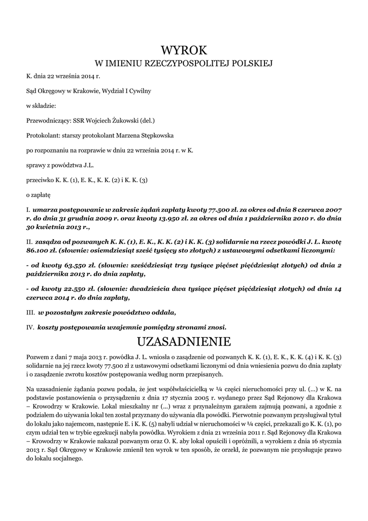 WYROK W IMIENIU RZECZYPOSPOLITEJ POLSKIEJ K. dnia 22 września 2014 r. Sąd Okręgowy w Krakowie, Wydział I Cywilny w składzie: Przewodniczący: SSR Wojciech Żukowski (del.) Protokolant: starszy protokolant Marzena Stępkowska po rozpoznaniu na rozprawie w dniu 22 września 2014 r. w K. sprawy z powództwa J.L. przeciwko K. K. (1), E. K., K. K. (2) i K. K. (3) o zapłatę I. umarza postępowanie w zakresie żądań zapłaty kwoty 77.500 zł. za okres od dnia 8 czerwca 2007 r. do dnia 31 grudnia 2009 r. oraz kwoty 13.950 zł. za okres od dnia 1 października 2010 r. do dnia 30 kwietnia 2013 r., II. zasądza od pozwanych K. K. (1), E. K., K. K. (2) i K. K. (3) solidarnie na rzecz powódki J. L. kwotę 86.100 zł. (słownie: osiemdziesiąt sześć tysięcy sto złotych) z ustawowymi odsetkami liczonymi: - od kwoty 63.550 zł. (słownie: sześćdziesiąt trzy tysiące pięćset pięćdziesiąt złotych) od dnia 2 października 2013 r. do dnia zapłaty, - od kwoty 22.550 zł. (słownie: dwadzieścia dwa tysiące pięćset pięćdziesiąt złotych) od dnia 14 czerwca 2014 r. do dnia zapłaty, III. w pozostałym zakresie powództwo oddala, IV. koszty postępowania wzajemnie pomiędzy stronami znosi. UZASADNIENIE Pozwem z dani 7 maja 2013 r. powódka J. L. wniosła o zasądzenie od pozwanych K. K. (1), E. K., K. K. (4) i K. K. (3) solidarnie na jej rzecz kwoty 77.500 zł z ustawowymi odsetkami liczonymi od dnia wniesienia pozwu do dnia zapłaty i o zasądzenie zwrotu kosztów postępowania według norm przepisanych. Na uzasadnienie żądania pozwu podała, że jest współwłaścicielką w ¼ części nieruchomości przy ul. (...) w K. na podstawie postanowienia o przysądzeniu z dnia 17 stycznia 2005 r. wydanego przez Sąd Rejonowy dla Krakowa – Krowodrzy w Krakowie. Lokal mieszkalny nr (...) wraz z przynależnym garażem zajmują pozwani, a zgodnie z podziałem do używania lokal ten został przyznany do używania dla powódki. Pierwotnie pozwanym przysługiwał tytuł do lokalu jako najemcom, następnie E. i K. K. (5) nabyli udział w nieruchomości w ¼ części, przekazali go K. K. (1), po czym udział ten w trybie egzekucji nabyła powódka. Wyrokiem z dnia 21 września 2011 r. Sąd Rejonowy dla Krakowa – Krowodrzy w Krakowie nakazał pozwanym oraz O. K. aby lokal opuścili i opróżnili, a wyrokiem z dnia 16 stycznia 2013 r. Sąd Okręgowy w Krakowie zmienił ten wyrok w ten sposób, że orzekł, że pozwanym nie przysługuje prawo do lokalu socjalnego. Powódka domaga się odszkodowania za zajmowanie lokalu za okres od 8 czerwca 2007 r. (data przysądzenia własności) do dnia 31 grudnia 2009 r. na podstawie art. 18 ust. 1 i 2 ustawy o ochronie praw lokatorów, w wysokości 2.500 zł. miesięcznie. W sprzeciwach od nakazu zapłaty (k. 26, k. 34, k. 40) pozwani wnieśli o oddalenie powództwa i o zasądzenie zwrotu kosztów postępowania od powódki. Zarzucili, że dochodzone roszczenie uległo przedawnieniu z uwagi na znajdujący w sprawie zastosowanie termin trzyletni przedawnienia. Zarzucili nadto, że nigdy powódka nie wezwała pozwanych do zapłaty odszkodowania za zajmowanie lokalu i dopiero pismem z dnia 8 czerwca 2009 r. wezwała pozwaną do opuszczenia lokalu co oznacza, że per facta concludentia wyrażała zgodę na zajmowanie lokalu przez pozwanych. Zarzucili nadto, że pozwana posiadła tytuł prawny do lokalu, który był lokalem kwaterunkowym a dochodzona przez powódkę kwota jest zawyżona. Pismem z dnia 30 września 2013 r. powódka zmieniła żądanie pozwu w ten sposób, że wniosła o zasądzenie dochodzonej pozwem kwoty tytułem odszkodowania za okres od 1 października 2010 r. do dnia 30 kwietnia 2013 r. Zaprzeczyła aby kiedykolwiek wyraziła zgodę na zajmowanie lokalu przez pozwanych. W piśmie z dnia 23 października 2013 r. pozwani wnieśli o oddalenie zmienionego powództwa. Zarzucili, że zmiana powództwa jest niedopuszczalna. Zarzucili, że powódka nigdy nie wzywała pozwanych do zapłaty za okres czasu, którego dotyczy roszczenie. Zarzucili nadto, że w księdze wieczystej nadal wpisane jest uprawnienie pozwanych E. K. i K. K. (4) do użytkowania dożywotniego, a nadto zarzucili, że powódka jest jedynie współwłaścicielem nieruchomości, a sporny lokal nie jest jej wyłączną własnością. W piśmie z dnia 23 kwietnia 2014 r. powódka rozszerzyła żądanie pozwu w ten sposób, że wniosła o zasądzenie za okres od dnia 1 maja 2013 r. do dnia 31 marca 2014 r. odszkodowania w kwocie 22.500 zł. z ustawowymi odsetkami od dnia wniesienia pisma do dnia zapłaty i oświadczając, że za okres od dnia 1 października 2010 r. do dnia 30 kwietnia 2013 r. domaga się kwoty 63.550 zł. Na rozprawie w dniu 8 września 2014 r. powódka cofnęła pozew w zakresie żądań zapłaty kwoty 77.500 zł za okres od dnia 8 czerwca 2007 r. do dnia 31 grudnia 2009 r. oraz kwoty 13.950 zł za okres od dnia 1 października 2010 r. do dnia 30 kwietnia 2013 r. Pozwani wyrazili zgodę na cofnięcie pozwu w w/w zakresie. Bezsporne w sprawie było, iż: Decyzją Prezydenta Miasta K. z dnia 15 października 1992 r. lokal mieszkalny nr (...) w nieruchomości położonej przy ul. (...) w K. został przyznany pozwanym E. i K. K. (4). Do zamieszkiwania w przedmiotowym lokalu uprawnieni byli także K. K. (1) i K. K. (3). Aktem notarialnym z dnia 7 lutego pozwani E. i K. K. (5) nabyli od K. S. własność udziału w ¼ we własności nieruchomości położonej w K. przy ul. (...) – kupujący oświadczyli wówczas, że są we współposiadaniu przedmiotowej nieruchomości. Następnie aktem notarialnym z dnia 27 września 1999 r. pozwani E. i K. K. (5) darowali przysługujący im udział w przedmiotowej nieruchomo mości córce K. K. (1) – w akcie tym pozwani oświadczyli, że „w ramach przysługującego im udziału zajmują lokal mieszkalny nr (...) uprzednio przydzielony im na mocy decyzji Prezydenta Miasta K.” o jakiej mowa wyżej; jednocześnie w akcie tym K. K. (