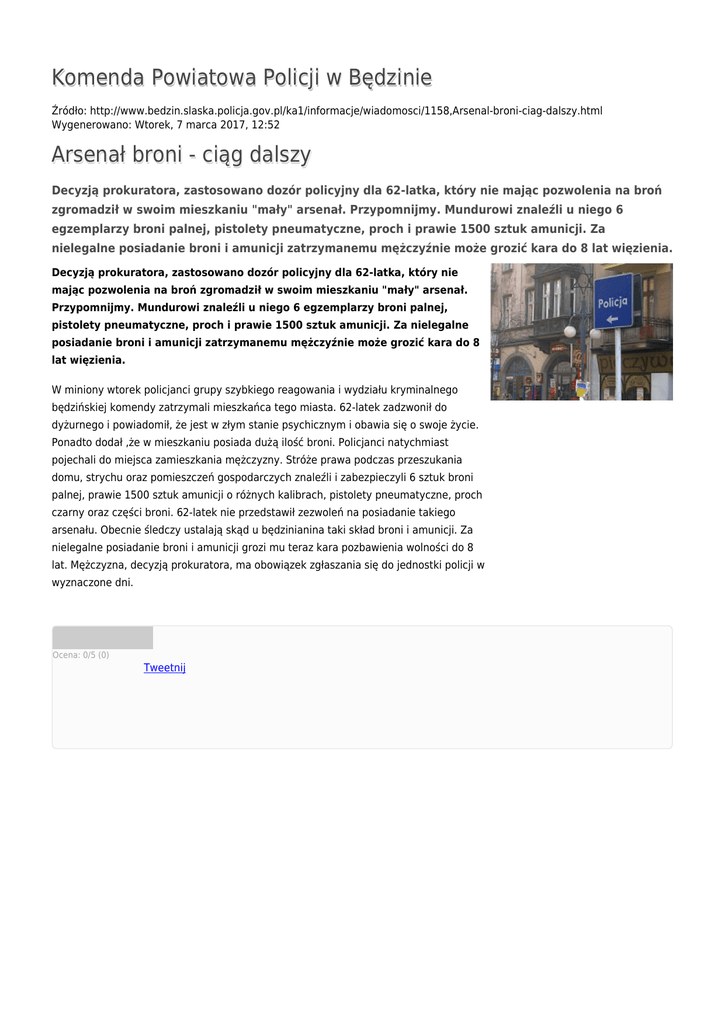 Komenda Powiatowa Policji w Będzinie Źródło: http://www.bedzin.slaska.policja.gov.pl/ka1/informacje/wiadomosci/1158,Arsenal-broni-ciag-dalszy.html Wygenerowano: Wtorek, 7 marca 2017, 12:52 Arsenał broni - ciąg dalszy Decyzją prokuratora, zastosowano dozór policyjny dla 62-latka, który nie mając pozwolenia na broń zgromadził w swoim mieszkaniu "mały" arsenał. Przypomnijmy. Mundurowi znaleźli u niego 6 egzemplarzy broni palnej, pistolety pneumatyczne, proch i prawie 1500 sztuk amunicji. Za nielegalne posiadanie broni i amunicji zatrzymanemu mężczyźnie może grozić kara do 8 lat więzienia. Decyzją prokuratora, zastosowano dozór policyjny dla 62-latka, który nie mając pozwolenia na broń zgromadził w swoim mieszkaniu "mały" arsenał. Przypomnijmy. Mundurowi znaleźli u niego 6 egzemplarzy broni palnej, pistolety pneumatyczne, proch i prawie 1500 sztuk amunicji. Za nielegalne posiadanie broni i amunicji zatrzymanemu mężczyźnie może grozić kara do 8 lat więzienia. W miniony wtorek policjanci grupy szybkiego reagowania i wydziału kryminalnego będzińskiej komendy zatrzymali mieszkańca tego miasta. 62-latek zadzwonił do dyżurnego i powiadomił, że jest w złym stanie psychicznym i obawia się o swoje życie. Ponadto dodał ,że w mieszkaniu posiada dużą ilość broni. Policjanci natychmiast pojechali do miejsca zamieszkania mężczyzny. Stróże prawa podczas przeszukania domu, strychu oraz pomieszczeń gospodarczych znaleźli i zabezpieczyli 6 sztuk broni palnej, prawie 1500 sztuk amunicji o różnych kalibrach, pistolety pneumatyczne, proch czarny oraz części broni. 62-latek nie przedstawił zezwoleń na posiadanie takiego arsenału. Obecnie śledczy ustalają skąd u będzinianina taki skład broni i amunicji. Za nielegalne posiadanie broni i amunicji grozi mu teraz kara pozbawienia wolności do 8 lat. Mężczyzna, decyzją prokuratora, ma obowiązek zgłaszania się do jednostki policji w wyznaczone dni. Ocena: 0/5 (0) Tweetnij