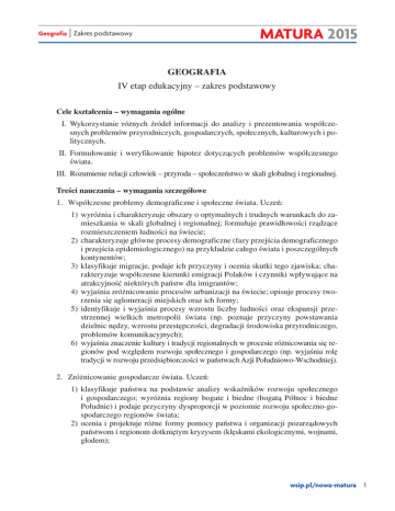 MATURA 2015 Geografia | Zakres podstawowy GEOGRAFIA IV etap edukacyjny – zakres podstawowy Cele kształcenia – wymagania ogólne I.Wykorzystanie różnych źródeł informacji do analizy i prezentowania współczesnych problemów przyrodniczych, gospodarczych, społecznych, kulturowych i politycznych. II.Formułowanie i weryfikowanie hipotez dotyczących problemów współczesnego świata. III.Rozumienie relacji człowiek – przyroda – społeczeństwo w skali globalnej i regionalnej. Treści nauczania – wymagania szczegółowe 1. Współczesne problemy demograficzne i społeczne świata. Uczeń: 1) wyróżnia i charakteryzuje obszary o optymalnych i trudnych warunkach do zamieszkania w skali globalnej i regionalnej; formułuje prawidłowości rządzące rozmieszczeniem ludności na świecie; 2) charakteryzuje główne procesy demograficzne (fazy przejścia demograficznego i przejścia epidemiologicznego) na przykładzie całego świata i poszczególnych kontynentów; 3) klasyfikuje migracje, podaje ich przyczyny i ocenia skutki tego zjawiska; charakteryzuje współczesne kierunki emigracji Polaków i czynniki wpływające na atrakcyjność niektórych państw dla imigrantów; 4) wyjaśnia zróżnicowanie procesów urbanizacji na świecie; opisuje procesy tworzenia się aglomeracji miejskich oraz ich formy; 5) identyfikuje i wyjaśnia procesy wzrostu liczby ludności oraz ekspansji przestrzennej wielkich metropolii świata (np. poznaje przyczyny powstawania dzielnic nędzy, wzrostu przestępczości, degradacji środowiska przyrodniczego, problemów komunikacyjnych); 6) wyjaśnia znaczenie kultury i tradycji regionalnych w procesie różnicowania się regionów pod względem rozwoju społecznego i gospodarczego (np. wyjaśnia rolę tradycji w rozwoju przedsiębiorczości w państwach Azji Południowo-Wschodniej). 2. Zróżnicowanie gospodarcze świata. Uczeń: 1) klasyfikuje państwa na podstawie analizy wskaźników rozwoju społecznego i gospodarczego; wyróżnia regiony bogate i biedne (bogatą Północ i biedne Południe) i podaje przyczyny dysproporcji w poziomie rozwoju społeczno-gospodarczego regionów świata; 2) ocenia i projektuje różne formy pomocy państwa i organizacji pozarządowych państwom i regionom dotkniętym kryzysem (klęskami ekologicznymi, wojnami, głodem); wsip.pl/nowa-matura 1 Geografia | Zakres podstawowy MATURA 2015 3) opisuje główne obszary upraw i chowu zwierząt na świecie, wyjaśnia ich zróżnicowanie przestrzenne; 4) wyjaśnia, z czego wynikają różnice w wielkości i strukturze spożycia żywności na świecie (uwarunkowania przyrodnicze, kulturowe, społeczne i polityczne, mechanizmy wpływające na nierównomierny rozdział żywności w skali globalnej); 5) opisuje zmiany w funkcji obszarów wiejskich na wybranych przykładach (np. w Unii Europejskiej, w regionach turystycznych w państwach rozwijających się); potrafi wyjaśnić szanse i zagrożenia dla środowiska przyrodniczego i mieszkańców poszczególnych regionów, wynikające z procesów przemian zachodzących na terenach wiejskich; 6) charakteryzuje kierunki zmian w powierzchni lasów na świecie (w wyniku procesów wylesiania i zalesiania) i podaje przykłady gospodarowania zasobami leśnymi (pozytywne i negatywne); 7) charakteryzuje cechy gospodarki morskiej i podaje przykłady wykorzystania oceanu światowego oraz zagrożeń wynikających ze zbyt intensywnej eksploatacji zasobów morskich; 8) charakteryzuje i ocenia zróżnicowanie i zmiany struktury wykorzystania surowców energetycznych na świecie; dokonuje oceny zjawiska uzależnienia produkcji energii na świecie od źródeł zaopatrzenia surowców nieodnawialnych, potrafi wyjaśnić twierdzenie „ropa rządzi światem”; 9) wyjaśnia, na czym polegają zmiany zachodzące na rynku pracy w skali globalnej i regionalnej, wynikające z rozwoju nowoczesnych technologii informacyjno-komunikacyjnych; 10)przedstawia cechy przemysłu wysokiej technologii i podaje przykłady jego lokalizacji na świecie; poznaje nowe funkcje ośrodków przemysłowych i nowe formy przestrzenne – technopolie, klastry i dystrykty przemysłowe; 11)charakteryzuje wybrane obszary intensywnie zagospodarowywane turystycznie na świecie; wyjaśnia, dlaczego zmieniają się kierunki wyjazdów turystycznych Polaków; identyfikuje skutki rozwoju turystyki dla środowiska przyrodniczego; 12)ocenia rolę nowoczesnych usług komunikacyjnych w funkcjonowaniu gospodarki i w życiu codziennym; 13)wyjaśnia zmiany zachodzące w kierunkach i natężeniu ruchu osób i towarów; wskazuje przykłady lokalizacji nowoczesnych terminali i ich rolę w rozwoju regionów; 14)podaje przykłady procesów globalizacji i ich wpływu na rozwój regionalny i lokalny; 15)wyjaśnia współczesne zmiany na mapie politycznej świata; 16)wyjaśnia na wybranych przykładach (w skali lokalnej, regionalnej i globalnej) przyczyny procesów integracyjnych i ich skutki gospodarcze, społeczne i polityczne. 3. Relacja człowiek–środowisko przyrodnicze a zrównoważony rozwój. Uczeń: 1) formułuje problemy wynikające z eksploatowania zasobów odnawialnych i nieodnawialnych; potrafi przewidzieć przyrodnicze i pozaprzyrodnicze przyczyny i skutki zakłóceń równowagi ekologicznej; wsip.pl/nowa-matura 2 Geografia | Zakres podstawowy MATURA 2015 2) charakteryzuje obszary niedoboru i nadmiaru wody na świecie i określa przyczyny tego zróżnicowania (w tym zanieczyszczenia wód); przedstawia projekty rozwiązań stosowanych w sytuacjach braku lub niedoborów wody w różnych strefach klimatycznych; 3) rozróżnia przyczyny zachodzących współcześnie globalnych zmian klimatu (ocieplenia globalnego) i ocenia rozwiązania podejmowane w skali globalnej i regionalnej zapobiegające temu zjawisku; 4) wykazuje na przykładach, że zbyt intensywne wykorzystanie rolnicze gleb oraz nieumiejętne zabiegi agrotechniczne powodują w wielu częściach świata degradację gleb, co w konsekwenc