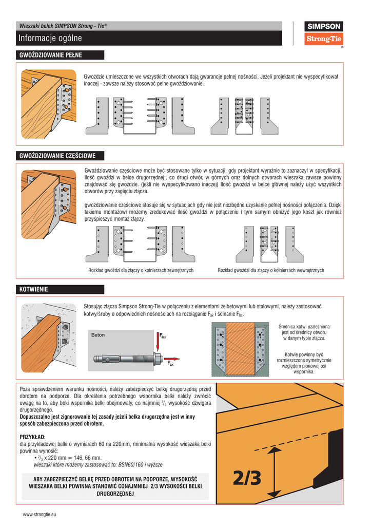 Wieszaki belek SIMPSON Strong - Tie® Informacje ogólne GWOŹDZIOWANIE PEŁNE Gwoździe umieszczone we wszystkich otworach dają gwarancje pełnej nośności. Jeżeli projektant nie wyspecyfikował inaczej - zawsze należy stosować pełne gwoździowanie. GWOŹDZIOWANIE CZĘŚCIOWE Gwoździowanie częściowe może być stosowane tylko w sytuacji, gdy projektant wyraźnie to zaznaczył w specyfikacji. Ilość gwoździ w belce drugorzędnej:, co drugi otwór, w górnych oraz dolnych otworach wieszaka zawsze powinny znajdować się gwoździe. (jeśli nie wyspecyfikowano inaczej) Ilość gwoździ w belce głównej należy użyć wszystkich otworów przy zagięciu złącza. gwoździowanie częściowe stosuje się w sytuacjach gdy nie jest niezbędne uzyskanie pełnej nośności połączenia. Dzięki takiemu montażowi możemy zredukować ilość gwoździ w połączeniu i tym samym obniżyć jego koszt jak również przyśpieszyć montaż złączy. Rozkład gwoździ dla złączy o kołnierzach zewnętrznych Rozkład gwoździ dla złączy o kołnierzach wewnętrznych KOTWIENIE Stosując złącza Simpson Strong-Tie w połączeniu z elementami żelbetowymi lub stalowymi, należy zastosować kotwy/śruby o odpowiednich nośnościach na rozciąganie Fax i ścinanie Flat. Średnica kotwi uzależniona jest od średnicy otworu w danym typie złącza. Kotwie powinny być rozmieszczone symetrycznie względem pionowej osi wspornika. Poza sprawdzeniem warunku nośności, należy zabezpieczyć belkę drugorzędną przed obrotem na podporze. Dla określenia potrzebnego wspornika belki należy zwrócić uwagę na to, aby boki wspornika belki obejmowały, co najmniej 2/3 wysokość dźwigara drugorzędnego. Dopuszczalne jest zignorowanie tej zasady jeżeli belka drugorzędna jest w inny sposób zabezpieczona przed obrotem. PRZYKŁAD: dla przykładowej belki o wymiarach 60 na 220mm, minimalna wysokość wieszaka belki powinna wynosić: • 2/3 x 220 mm = 146, 66 mm. wieszaki które możemy zastosować to: BSN60/160 i wyższe ABY ZABEZPIECZYĆ BELKĘ PRZED OBROTEM NA PODPORZE, WYSOKOŚĆ WIESZAKA BELKI POWINNA STANOWIĆ CONAJMNIEJ 2/3 WYSOKOŚCI BELKI DRUGORZĘDNEJ www.strongtie.eu