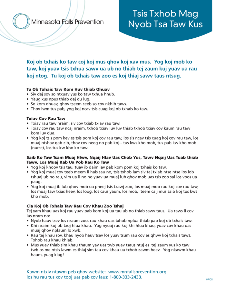 Tsis Txhob Mag Nyob Tsa Taw Kus Koj ob txhais ko taw coj koj mus qhov koj xav mus. Yog koj mob ko taw, koj yuav tsis txhua sawv ua ub no thiab tej zaum kuj yuav ua rau koj ntog. Tu koj ob txhais taw zoo es koj thiaj sawv taus ntsug. Tu Ob Txhais Taw Kom Huv thiab Qhuav • Siv dej sov so ntxuav yus ko taw txhua hnub. • Yaug xus npus thiab dej du lug. • So kom qhuav, qhov tseem ceeb so cov nkhib taws. • Thov lwm tus pab, yog koj ncav tsis cuag koj ob txhais ko taw. Txiav Cov Rau Taw • Txiav rau taw nraim, siv cov txiab txiav rau taw. • T xiav cov rau taw ncaj nraim, txhob txiav luv luv thiab txhob txiav cov kaum rau taw kom luv dua. • Y og koj tsis pom kev es tsis pom koj cov rau taw, los sis ncav tsis cuag koj cov rau taw, los muaj ntshav qab zib, thov cov neeg no pab koj-- tus kws kho mob, tus pab kw kho mob (nurse), los tus kw kho ko taw. Saib Ko Taw Tsam Muaj Hlwv, Nqaij Hlav Uas Chob Yus, Tawv Nqaij Uas Tuab thiab Tawv, Los Muaj Kab Ua Pob Rau Ko Taw • Yog koj khoov tsis tau, tuav ib daim iav pab kom pom koj txhais ko taw. • Y og koj muaj cov teeb meem li hais sau no, tsis txhob lam siv tej txiab ntse ntse los lob tshuaj ub no rau, vim ua li no ho yuav ua muaj lub qhov mob uas tsis zoo sai los voos ua paug. • Y og koj muaj ib lub qhov mob ua pheej tsis txawj zoo, los muaj mob rau koj cov rau taw, los muaj taw txias heev, los loog, los caus yaum, los mob, teem caij mus saib koj tus kws kho mob. Cia Koj Ob Txhais Taw Rau Cov Khau Zoo Tshaj Tej yam khau uas koj rau yuav pab kom koj ua tau ub no thiab sawv taus. Ua raws li cov lus nram no: • N yob hauv tsev los nraum zoo, rau khau uas txhob nplua thiab pab koj ob txhais taw. • K hi nraim koj ob txoj hlua khau. Yog nyuaj rau koj khi hlua khau, yuav cov khau uas muaj qhov nplaum lo xwb. • R au tej khau sov, khau nyob hauv tsev los yuav tsum rau cov es qhwv koj txhais taws. Txhob rau khau khiab. • M us yuav thiab sim khau thaum yav uas twb yuav tsaus ntuj es tej zaum yus ko taw twb os me ntsis lawm es thiaj sim tau cov khau ua txhob zawm heev. Yog nkawm khau haum, yuag kiag! Kawm ntxiv ntawm peb qhov website: www.mnfallsprevention.org los hu rau tus xov tooj uas pab cov laus: 1-800-333-2433. 07/08