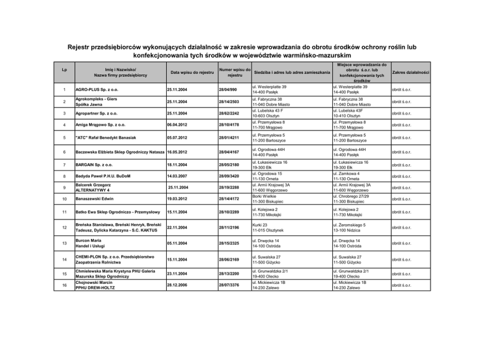 Rejestr przedsiębiorców wykonujących działalność w zakresie wprowadzania do obrotu środków ochrony roślin lub konfekcjonowania tych środków w województwie warmińsko-mazurskim Lp Imię i Nazwisko/ Nazwa firmy przedsiębiorcy Data wpisu do rejestru Numer wpisu do Siedziba i adres lub adres zamieszkania rejestru Miejsce wprowadzania do obrotu ś.o.r. lub konfekcjonowania tych środków Zakres działalności 1 AGRO-PLUS Sp. z o.o. 25.11.2004 28/04/990 ul. Westerplatte 39 14-400 Pasłęk ul. Westerplatte 39 14-400 Pasłęk obrót ś.o.r. 2 Agrokompleks - Giers Spółka Jawna 25.11.2004 28/14/2503 ul. Fabryczna 38 11-040 Dobre Miasto ul. Fabryczna 38 11-040 Dobre Miasto obrót ś.o.r. 3 Agropartner Sp. z o.o. 25.11.2004 28/62/2242 ul. Lubelska 43 F 10-603 Olsztyn ul. Lubelska 43F 10-410 Olsztyn obrót ś.o.r. 4 Amiga Mrągowo Sp. z o.o. 06.04.2012 28/10/4178 ul. Przemysłowa 8 11-700 Mrągowo ul. Przemysłowa 8 11-700 Mrągowo obrót ś.o.r. 5 "ATC" Rafał Benedykt Banasiak 05.07.2012 28/01/4211 ul. Przemysłowa 5 11-200 Bartoszyce ul. Przemysłowa 5 11-200 Bartoszyce obrót ś.o.r. 6 Baczewska Elżbieta Sklep Ogrodniczy Natasza 16.05.2012 28/04/4167 ul. Ogrodowa 44H 14-400 Pasłęk ul. Ogrodowa 44H 14-400 Pasłęk obrót ś.o.r. 7 BARGAIN Sp. z o.o. 18.11.2004 28/05/2180 ul. Łukasiewicza 16 19-300 Ełk ul. Łukasiewicza 16 19-300 Ełk obrót ś.o.r. 8 Badyda Paweł P.H.U. BuDoM 14.03.2007 28/09/3420 ul. Ogrodowa 15 11-130 Orneta ul. Zamkowa 4 11-130 Orneta obrót ś.o.r. 9 Balcerek Grzegorz ALTERNATYWY 4 28/19/2288 ul. Armii Krajowej 3A 11-600 Węgorzewo ul. Armii Krajowej 3A 11-600 Węgorzewo obrót ś.o.r. ul. Chrobrego 27/29 11-300 Biskupiec obrót ś.o.r. 25.11.2004 10 Banaszewski Edwin 19.03.2012 28/14/4172 Borki Wielkie 11-300 Biskupiec 11 Batko Ewa Sklep Ogrodniczo - Przemysłowy 15.11.2004 28/10/2289 ul. Kolejowa 2 11-730 Mikołajki ul. Kolejowa 2 11-730 Mikołajki obrót ś.o.r. 12 Breńska Stanisława, Breński Henryk, Breński Tadeusz, Dylicka Katarzyna - S.C. KAKTUS 22.11.2004 28/11/2196 Kurki 23 11-015 Olsztynek ul. Żeromskiego 5 13-100 Nidzica obrót ś.o.r. 13 Burcon Maria Handel i Usługi 05.11.2004 28/15/2325 ul. Drwęcka 14 14-100 Ostróda ul. Drwęcka 14 14-100 Ostróda obrót ś.o.r. 14 CHEMI-PLON Sp. z o.o. Przedsiębiorstwo Zaopatrzenia Rolnictwa 15.11.2004 28/06/2169 ul. Suwalska 27 11-500 Giżycko ul. Suwalska 27 11-500 Giżycko obrót ś.o.r. 23.11.2004 28/13/2200 ul. Grunwaldzka 2/1 19-400 Olecko ul. Grunwaldzka 2/1 19-400 Olecko obrót ś.o.r. 28.12.2006 28/07/3376 ul. Mickiewicza 1B 14-230 Zalewo ul. Mickiewicza 1B 14-230 Zalewo obrót ś.o.r. 15 16 Chmielewska Maria Krystyna PHU Galeria Mazurska Sklep Ogrodniczy Chojnowski Marcin PPHU DREW-HOLTZ 17 Cichy Andrzej Usługi Transportowe 28.02.2012 28/02/4169 ul. Kościuszki 10 14-520 Pieniężno Miejsce wprowadzania do obrotu ś.o.r. lub konfekcjonowania tych środków ul. Kościuszki 10 14-520 Pieniężno 18 Czacharowska Edyta - Sklep Ogrodniczy i Środków Ochrony Roślin OGRÓD 23.11.2004 28/07/2619 ul. Przemysłowa 4 14-260 Lubawa ul. Przemysłowa 4 14-260 Lubawa obrót ś.o.r. 09.09.2011 28/15/4124 ul. Przemysłowa 10 14-300 Morąg ul. Przemysłowa 10 14-300 Morąg obrót ś.o.r. 05.12.2005 28/17/3088 Rudka 9A 12-100 Szczytno Rudka 9A 12-100 Szczytno obrót ś.o.r. Lp 19 20 Imię i Nazwisko/ Nazwa firmy przedsiębiorcy Dąbkowski Andrzej Przedsiębiorstow Handlowe Dzienian Barbara Jolanta, Firma Handlowo - Usługowa Norbara Data wpisu do rejestru Numer wpisu do Siedziba i adres lub adres zamieszkania rejestru Zakres działalności obrót ś.o.r. 21 Dłużniewski Adam, Wikieł Mirosław Firma Handlowo Usługowa AGRICOLA SC 14.01.2005 28/62/2674 ul. Cementowa 1 1-429 Olsztyn ul. Cementowa 1 1-429 Olsztyn obrót ś.o.r. 22 EWROL Sp. z o.o. 16.01.2007 28/14/3363 Lutry 101 11-311 Kolno Lutry 101 11-311 Kolno obrót ś.o.r. 23 FAGO Sp. z o.o. 25.02.2012 28/17/3791 ul. Wileńska 5 12-100 Szczytno ul. Wileńska 5 12-100 Szczytno obrót ś.o.r. 24 FAVET Sp. zo.o. 25.04.2012 28/15/4086 Kruszewnia 2 14-300 Morąg Kruszewnia 2 14-300 Morąg obrót ś.o.r. 25 Fenyk Bogusława - Przedsiębiorstwo Handlowo-Usługowe 08.06.2005 28/08/2718 ul. Mickiewicz 2A/2 11-430 Korsze ul. Mickiewicz 2A/2 11-430 Korsze obrót ś.o.r. Fiedorowicz Anna, Fiedorowicz Jacek ROLPLON s.c. 23.11.2004 28/18/2362 ul. Żeromskiego 40A 19-500 Gołdap obrót ś.o.r. 26 Plac Zwycięstwa 3 19-500 Gołdap obrót ś.o.r. 27 Filip Antoni Zakład Produkcyjno-HandlowoUsługowy FILPOL 20.09.2006 28/03/3317 Zalesie 68 13-206 Płośnica obrót ś.o.r. 28 Finkieklan Zbigniew S. Przedsiębiorstwo Usługowo-Handlowe FINKIEKLAN 23.10.2006 28/11/3281 ul. Kolejowa 25 13-100 Nidzica obrót ś.o.r. 25.11.2004 28/09/2227 ul. Olsztyńska 27 11-130 Orneta ul. Olsztyńska 27 11-130 Orneta obrót ś.o.r. 18.11.2004 28/17/2590 ul. 24 Stycznia 1 07-433 Rozogi ul. 24 Stycznia 1 07-433 Rozogi obrót ś.o.r. 08.04.2011 28/09/4067 ul. Warmińska 26 11-100 Lidzbark Warmiński ul. Warmińska 26 11-100 Lidzbark Warmiński obrót ś.o.r. 28/11/479 ul. Kolejowa 21 13-100 Nidzica ul. Kolejowa 21 13-100 Nidzica obrót ś.o.r. 28/12/4009 Gryźliny 31 13-332 Jamielnik Gryźliny 31 13-332 Jamielnik obrót ś.o.r. ul. Mazurska 50 82-300 Elbląg obrót ś.o.r. 29 30 Gajdamowicz Anna PHHU KARBO-HURT Gminna Spółdzielnia Samopomoc Chłopska 31 Giers Wiesław "WARMIAK" 32 Gospodarstwo Produkcji Rolnej Centrala Nasienna Sp. z o.o 33 34 Góralski Waldemar Gór-Pasz 23.11.2004 18.11.2004 25.10.2010 Góralczyk Anna Hurtownia Nasion ELPLANT 05.11.2004 28/18/2362 28/61/789 ul. Żeromskiego 42B 19-500 Gołdap Zalesie 68 13-206 Płośnica ul. Kolejowa 25 13-100 Nidzica ul. Mazurska 50 82-300 Elbląg Lp Imię i Nazwisko/ Nazwa firmy przedsiębiorcy Data wpisu do rejestru Numer wpisu do Siedziba i adres lub adres zamieszkania rejestru Miejsce wprowadzania do obrotu ś.o.r. lub konfekcjonowania tych środków ul. Dworcowa 30 14-420 Młynary Zakres działalności obrót ś.o.r. 35 Grochola Anna