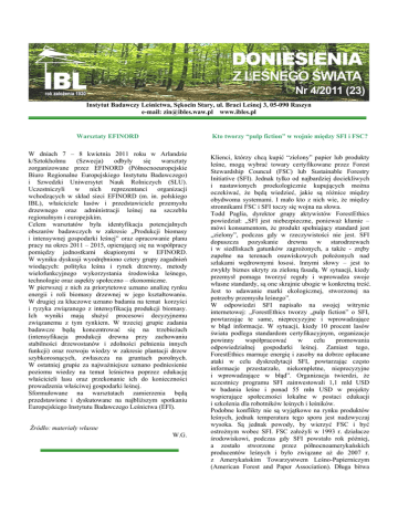 Instytut Badawczy Leśnictwa, Sękocin Stary, ul. Braci Leśnej 3, 05-090 Raszyn e-mail: [email protected] www.ibles.pl Warsztaty EFINORD Kto tworzy “pulp fiction” w wojnie między SFI i FSC? W dniach 7 – 8 kwietnia 2011 roku w Arlandzie k/Sztokholmu (Szwecja) odbyły się warsztaty zorganizowane przez EFINORD (Północnoeuropejskie Biuro Regionalne Europejskiego Instytutu Badawczego) i Szwedzki Uniwersytet Nauk Rolniczych (SLU). Uczestniczyli w nich reprezentanci organizacji wchodzących w skład sieci EFINORD (m. in. polskiego IBL), właściciele lasów i przedstawiciele przemysłu drzewnego oraz administracji leśnej na szczeblu regionalnym i europejskim. Celem warsztatów była identyfikacja potencjalnych obszarów badawczych w zakresie „Produkcji biomasy i intensywnej gospodarki leśnej” oraz opracowanie planu pracy na okres 2011 – 2015, opierającej się na współpracy pomiędzy jednostkami skupionymi w EFINORD. W wyniku dyskusji wyodrębniono cztery grupy zagadnień wiodących: polityka leśna i rynek drzewny, metody wielofunkcyjnego wykorzystania środowiska leśnego, technologie oraz aspekty społeczno – ekonomiczne. W pierwszej z nich za priorytetowe uznano analizę rynku energii i roli biomasy drzewnej w jego kształtowaniu. W drugiej za kluczowe uznano badania na temat korzyści i ryzyka związanego z intensyfikacją produkcji biomasy. Ich wyniki mają służyć procesowi decyzyjnemu związanemu z tym rynkiem. W trzeciej grupie zadania badawcze będą koncentrować się na trzebieżach (intensyfikacja produkcji drewna przy zachowaniu stabilności drzewostanów i zdolności pełnienia innych funkcji) oraz rozwoju wiedzy w zakresie plantacji drzew szybkorosnących, zwłaszcza na gruntach porolnych. W ostatniej grupie za najważniejsze uznano podniesienie poziomu wiedzy na temat leśnictwa poprzez edukację właścicieli lasu oraz przekonanie ich do konieczności prowadzenia właściwej gospodarki leśnej. Sformułowane na warsztatach zamierzenia będą przedstawione i dyskutowane na najbliższym spotkaniu Europejskiego Instytutu Badawczego Leśnictwa (EFI). Źródło: materiały własne W.G. Klienci, którzy chcą kupić “zielony” papier lub produkty leśne, mogą wybrać towary certyfikowane przez Forest Stewardship Councul (FSC) lub Sustainable Forestry Initiative (SFI). Jednak tylko od najbardziej dociekliwych i nastawionych proekologicznie kupujących można oczekiwać, że będą wiedzieć, jakie są różnice między obydwoma systemami. I mało kto z nich wie, że między stronnikami FSC i SFI toczy się wojna na słowa. Todd Paglia, dyrektor grupy aktywistów ForestEthics powiedział: „SFI jest niebezpieczne, ponieważ kłamie – mówi konsumentom, że produkt spełniający standard jest „zielony”, podczas gdy w rzeczywistości nie jest. SFI dopuszcza pozyskanie drewna w starodrzewach i w siedliskach gatunków zagrożonych, a także - zręby zupełne na terenach osuwiskowych położonych nad szlakami wędrownymi łososi. Innymi słowy – jest to zwykły biznes ukryty za zieloną fasadą. W sytuacji, kiedy przemysł pomaga tworzyć reguły i wprowadza swoje własne standardy, są one skrajnie ubogie w konkretną treść. Jest to udawanie marki ekologicznej, stworzonej na potrzeby przemysłu leśnego”. W odpowiedzi SFI napisało na swojej witrynie internetowej: „ForestEthics tworzy „pulp fiction” o SFI, powtarzając te same, nieprecyzyjne i wprowadzające w błąd informacje. W sytuacji, kiedy 10 procent lasów świata podlega standardom certyfikacyjnym, organizacje powinny współpracować w celu promowania odpowiedzialnej gospodarki leśnej. Zamiast tego, ForestEthics marnuje energię i zasoby na dobrze opłacane ataki w celu dyskredytacji SFI, powtarzając często informacje przestarzałe, niekompletne, nieprecyzyjne i wprowadzające w błąd”. Organizacja twierdzi, że uczestnicy programu SFI zainwestowali 1,1 mld USD w badania leśne i ponad 55 mln USD w projekty wspierające społeczności lokalne w postaci edukacji i szkolenia dla robotników leśnych i leśników. Podobne konflikty nie są wyjątkowe na rynku produktów leśnych, jednak temperatura tego sporu jest nadzwyczaj wysoka. Są jednak powody, by wierzyć FSC i być ostrożnym wobec SFI. FSC założyli w 1993 r. działacze środowiskowi, podczas gdy SFI powstało rok później, a zostało stworzone przez północnoamerykańskich producentów leśnych i było związane aż do 2007 r. z Amerykańskim Towarzystwem Leśno-Papierniczym (American Forest and Paper Association). Długa bitwa o to, by nie było dodatkowych punktów w systemie standardów LEED (Leadership in Energy & Environmental Design) dla drewna certyfikowanego w systemie SFI zakończyła się decyzją, by nie faworyzować SFI. Za takim rozwiązaniem opowiedziały się m.in. WWF i Greenpeace. Wszystkie fundusze SFI pochodzą od firm, które są właścicielami lub zarządcami certyfikowanych lasów. Niestety, ten sam problem dotyczy innych systemów certyfikacji, w tym – FSC rekreacyjnych, wzrost zatrudnienia i wypasu reniferów na obszarach leśnych. utrzymywanie Źródło: http://www.metsa.fi W.G. Fińskie Lasy Państwowe stawiają na młodzież Źródło: Marc Gunther, GreenBiz.com http://www.greenbiz.com/blog/2011/03/30/whos-peddlingpulp-fiction-sfi-vs-fsc-forestry-wars?page=0%2C1 W tym roku Fińskie Gospodarstwo Leśne (Metsähallitus) zatrudni około tysiąca młodych pracowników sezonowych, głównie do sadzenia drzew. Większość miejsc pracy jest zlokalizowana w północnej Finlandii, na obszarach oddalonych od aglomeracji miejskich, czyli tam, gdzie możliwości zatrudnienia, zwłaszcza dla młodych osób, są ograniczone. Prace sezonowe są znakomitą okazją do zwiększenia wiedzy młodzieży o lesie i leśnictwie. Osoby nie mające żadnego doświadczenia (w wieku co najmniej 15 lat) otrzymają propozycje pracy na okres kilku tygodni. Te osoby, które dysponują już określoną praktyką, bę