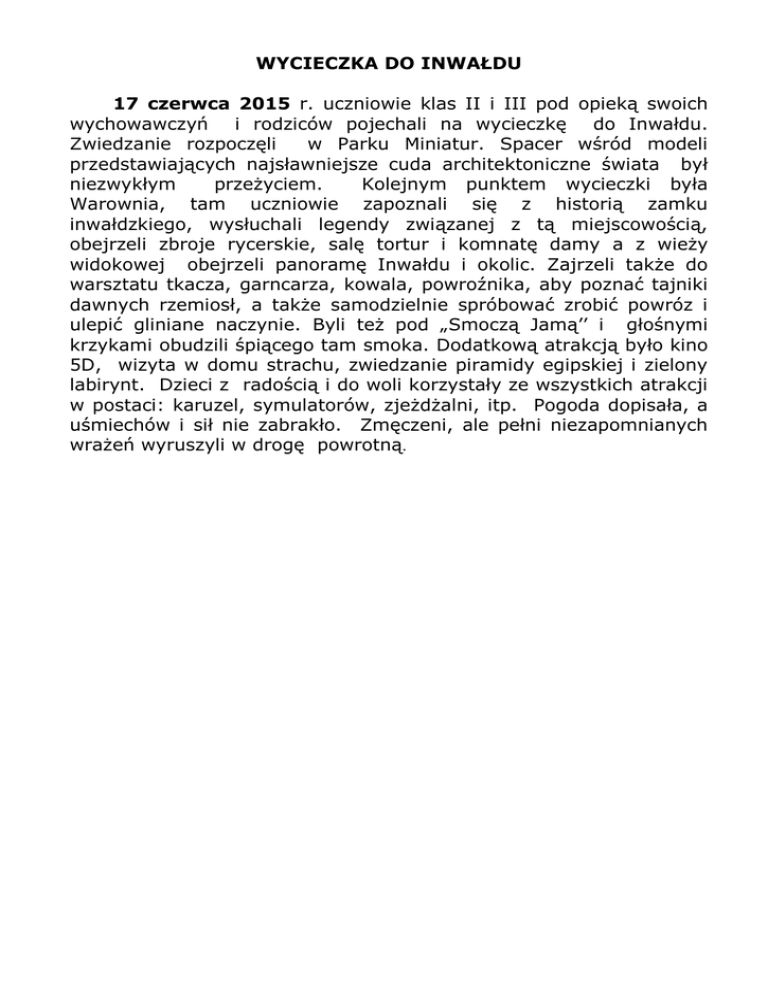 WYCIECZKA DO INWAŁDU 17 czerwca 2015 r. uczniowie klas II i III pod opieką swoich wychowawczyń i rodziców pojechali na wycieczkę do Inwałdu. Zwiedzanie rozpoczęli w Parku Miniatur. Spacer wśród modeli przedstawiających najsławniejsze cuda architektoniczne świata był niezwykłym przeżyciem. Kolejnym punktem wycieczki była Warownia, tam uczniowie zapoznali się z historią zamku inwałdzkiego, wysłuchali legendy związanej z tą miejscowością, obejrzeli zbroje rycerskie, salę tortur i komnatę damy a z wieży widokowej obejrzeli panoramę Inwałdu i okolic. Zajrzeli także do warsztatu tkacza, garncarza, kowala, powroźnika, aby poznać tajniki dawnych rzemiosł, a także samodzielnie spróbować zrobić powróz i ulepić gliniane naczynie. Byli też pod „Smoczą Jamą’’ i głośnymi krzykami obudzili śpiącego tam smoka. Dodatkową atrakcją było kino 5D, wizyta w domu strachu, zwiedzanie piramidy egipskiej i zielony labirynt. Dzieci z radością i do woli korzystały ze wszystkich atrakcji w postaci: karuzel, symulatorów, zjeżdżalni, itp. Pogoda dopisała, a uśmiechów i sił nie zabrakło. Zmęczeni, ale pełni niezapomnianych wrażeń wyruszyli w drogę powrotną.