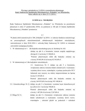 Wyciąg z protokołu nr 11)2016 z posiedzenia plenarnego Rady Nadzorczej Spółdzielni Mieszkaniowej „Południe” we Włocławku, które odbyło się w dniu 23.11.2016 r. UCHWAŁA NR 88)2016 Rada Nadzorcza Spółdzielni Mieszkaniowej „Południe” we Włocławku na posiedzeniu plenarnym w dniu 27 października 2016r. na podstawie § 106 pkt 23 Statutu Spółdzielni Mieszkaniowej „Południe” postanawia: §1 W planie robót remontowych w SM „Południe” na 2016 r. w zakresie funduszu remontowego na poszczególnych nieruchomościach zabudowanych budynkami mieszkalnymi, zatwierdzonym w dniu 20.01.2016 r. uchwałą Rady Nadzorczej Nr 1)2016 ze zmianami zatwierdzić następującą korektę: 1. W Administracji nr 1: dla budynku mieszkalnego przy ul. Kaliskiej Nr 102: dodaje się pkt 6 o brzmieniu: remont zespołu napędowego dźwigu kl. 4 na kwotę 13 500,00 zł. Wartość planowanych robót dla budynku zmienia się z kwoty 29 042,00 zł na kwotę 42 542,00 zł. 2. W Administracji nr 2 dla budynków mieszkalnych: 2.1. Arentowicza Nr 5: dodaje się pkt 5 o brzmieniu; zwiększenie zakresu remontu klatek schodowych o wykonanie: wymiany drzwi wewn. wiatrołapów, wymiany pochwytów PCV balustrad oraz rezerwy na roboty nieprzewidziane na łączną kwotę 21 255,00 zł. Wartość planowanych robót dla budynku zmienia się z kwoty 160 853,00 zł na kwotę 182 108,00 zł. 2.2. Gniazdowskiego Nr 8; dodaje się pkt 2 o brzmieniu: wymiana kaset domofonowych na cyfrowe kl. 3 na kwotę 780,00 zł. Wartość planowanych robót dla budynku zmienia się z kwoty 1 487,00 zł na kwotę 2 267,00 zł. 2.3 Długa Nr 31; dodaje się pkt 8 o brzmieniu: zwiększenie zakresu remontu klatek schodowych o wykonanie: wymiany drzwi wewn. wiatrołapów , ułożenie płytek na podestach i schodach do 4 piętra oraz rezerwy na roboty nieprzewidziane na łączną kwotę 9 112,00 zł. Wartość planowanych robót dla budynku zmienia się z kwoty 60 952,00 zł na kwotę 70 064,00 zł. 2.4.Chłodna Nr 29; dodaje się pkt 8 o brzmieniu: zwiększenie zakresu remontu klatek schodowych o wykonanie: wymiany drzwi wewnętrznych wiatrołapów, ułożenie płytek na podestach i schodach do 4 piętra oraz rezerwy na roboty nieprzewidziane na łączną kwotę 42 338,00 zł. Wartość planowanych robót dla budynku zmienia się z kwoty 97 202,00 zł na kwotę 139 540,00 zł. 2.5.Chłodna Nr 31; dodaje się pkt 6 o brzmieniu; zwiększenie zakresu remontu klatek schodowych o wykonanie: wymiany drzwi wewnętrznych wiatrołapów, ułożenie płytek na podestach i schodach do 4 piętra oraz rezerwy na roboty nieprzewidziane na łączną kwotę 29 275,00 zł. Wartość planowanych robót dla budynku zmienia się z kwoty 62 909,00 zł na kwotę 92 184,00 zł. 2.6. Planty Nr 10; dodaje się pkt 5 o brzmieniu: zwiększenie zakresu remontu klatek schodowych o wykonanie: wymiany drzwi wewnętrznych wiatrołapów, ułożenie płytek na podestach i schodach do 4 piętra, wymiana pochwytów PCV na balustradach, wymiana drzwi do piwnic na drzwi ppoż oraz rezerwy na roboty nieprzewidziane na łączną kwotę 48 953,00 zł. Wartość planowanych robót dla budynku zmienia się z kwoty 80 571,00 zł na kwotę 129 524,00 zł. 2.7. Kolska Nr 6; dodaje się pkt 5 o brzmieniu: zwiększenie zakresu remontu klatek schodowych o wykonanie: płytki na podestach i schodach do 4 piętra oraz rezerwy na roboty nieprzewidziane na łączną kwotę 21 925,00 zł. Wartość planowanych robót dla budynku z kwoty 53 036,00 zł na kwotę 74 961,00 zł. zmienia się 2.8. Kolska Nr 6A; dodaje się pkt 5 o brzmieniu; zwiększenie zakresu remontu klatek schodowych o wykonanie: ułożenia płytek na podestach i schodach do 4 piętra, wymiana pochwytów PCV na balustradach oraz rezerwy na roboty nieprzewidziane na łączną kwotę na kwotę 35 040,00 zł. Wartość planowanych robót dla budynku zmienia się z kwoty 79 573,00 zł na kwotę 114 613,00 zł. 2.9. Kolska Nr 6B; dodaje się pkt 4 o brzmieniu; zwiększenie zakresu remontu klatek schodowych o wykonanie: ułożenia płytek na podestach i schodach do 4 piętra, wymiana pochwytów PCV na balustradach oraz rezerwy na roboty nieprzewidziane na łączną kwotę na kwotę 35 040,00 zł. Wartość planowanych robót dla budynku zmienia się z kwoty 77 774,00 zł na kwotę 112 814,00 zł. 3. W Administracji nr 3 dla budynku mieszkalnego przy ul. Moniuszki Nr 2 dodaje się pkt 8 o brzmieniu wymiana kaset domofonowych na cyfrowe kl. 3 na kwotę 780,00 zł. Wartość planowanych robót dla budynku zmienia się z kwoty 43 731,00 zł. na kwotę 44 511,00 zł. §2 1. Przyjąć tekst jednolity planu robót remontowych w SM „Południe” na 2016 r. w zakresie funduszu remontowego na poszczególnych nieruchomościach zabudowanych budynkami mieszkalnymi, który stanowią załączniki: Załącznik Nr 1A, Załącznik Nr 2A, Załącznik Nr 3A i Załącznik Nr 4A, datowane 18.10.2016 r. 2. Tekst jednolity obejmuje plan robót remontowych w SM” Południe” na 2016 r. w zakresie funduszu remontowego na poszczególnych nieruchomościach zatwierdzony uchwałą z dnia 20.01.2016 r. Nr 1)2016. z późniejszymi korektami zatwierdzonymi następującymi uchwałami: uchwała z dnia 25.02.2016 r. Nr 8)2016, uchwała z dnia 31.03.2016 r. Nr 18)2016, uchwała z dnia 10.05.2016 r. Nr 44)2016, uchwała z dnia 21.07.2016 r. Nr 61)2016, uchwała z dnia 29.09.2016 r. Nr 77)2016 , uchwałę Nr 83/2016 z dnia 27.10.2016 r. oraz korektę zatwierdzoną w § 1 niniejszej uchwały. 3. Załączniki: Załącznik Nr 1 stanowiący integralna część uchwały. §3 Wykonanie uchwały powierza się Zarządowi Spółdzielni. §4 Uchwała wchodzi w życie z dniem podjęcia.