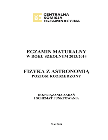 EGZAMIN MATURALNY W ROKU SZKOLNYM 2013/2014 FIZYKA Z ASTRONOMIĄ POZIOM ROZSZERZONY ROZWIĄZANIA ZADAŃ I SCHEMAT PUNKTOWANIA MAJ 2014 Egzamin maturalny z fizyki i astronomii Rozwiązania zadań i schemat punktowania – poziom rozszerzony 2 Zadanie 1. (0–7) 1.1. (0–3) Obszar standardów Opis wymagań (dla obszaru „Wiadomości i rozumienie” PP oznacza wymagania szczegółowe z poziomu podstawowego, PR – z poziomu rozszerzonego) Korzystanie z informacji Obliczanie wielkości fizycznych z wykorzystaniem znanych zależności (II.4.c) Poprawna odpowiedź: Podczas ruchu jednostajnego prostoliniowego siły się równoważą, czyli ρv2 S = mg, stąd v= = · , = · , , · , · , · 3 p. – zapisanie warunku jednostajnego spadania v2 = lub v = , = 9,1 . ρv2 S = mg oraz wyprowadzenie wzoru i obliczenie v = 9,1 m/s 2 p. – zapisanie warunku jednostajnego spadania v2 = / lub v = ρv2 S = mg oraz wyprowadzenie wzoru , lub podstawienie poprawnych danych do warunku jednostajnego spadania 1 p. – zapisanie warunku jednostajnego spadania ρv2 S = mg 0 p. – brak spełnienia powyższych kryteriów 1.2. (0–4) Korzystanie z informacji Rysowanie wykresu (II.4.b) Tworzenie informacji Analizowanie opisanych wyników doświadczeń (III.1) Poprawna odpowiedź: Obliczamy kwadraty prędkości (kolejno 0,92 5,15 , 6,25 , 1,74 , 2,59 , 3,42 , 4,33 ). Siła oporu powietrza jest równa ciężarowi foremek Q. Wykres ma postać 0,04 Fop, N 0,03 0,02 0,01 0 1 2 3 4 5 6 7 v2, m2/s2 , Egzamin maturalny z fizyki i astronomii Rozwiązania zadań i schemat punktowania – poziom rozszerzony 3 Położenie punktów na wykresie jest zgodne z linią prostą przechodzącą przez początek układu współrzędnych, co świadczy o zależności proporcjonalnej między wielkościami odłożonymi na osiach. 4 p. – wyskalowanie i opisanie osi wykresu oraz poprawne naniesienie wszystkich punktów, poprowadzenie prostej przechodzącej przez początek układu współrzędnych, stwierdzenie zgodności punktów z prostą oraz wniosek: Fop jest proporcjonalna do v2 3 p. – wyskalowanie i opisanie osi wykresu oraz poprawne naniesienie wszystkich punktów, poprowadzenie prostej przechodzącej przez początek układu współrzędnych lub – wyskalowanie i opisanie osi wykresu oraz poprawne naniesienie 5 lub 6 punktów, poprowadzenie prostej przechodzącej przez początek układu współrzędnych, stwierdzenie zgodności punktów z prostą oraz poprawny wniosek lub – wyskalowanie i opisanie osi wykresu oraz poprawne naniesienie wszystkich punktów, poprowadzenie prostej (nie przechodzącej przez początek układu współrzędnych), stwierdzenie zgodności punktów z prostą oraz poprawny wniosek 2 p. – wyskalowanie i opisanie osi wykresu, błędy naniesienia punktów, wniosek zgodny z narysowanym wykresem lub – wyskalowanie i opisanie osi wykresu oraz poprawne naniesienie 5 lub 6 punktów 1 p. – wyskalowanie i opisanie osi wykresu lub – błąd wyskalowania lub opisania osi wykresu, naniesienie punktów, wniosek zgodny z narysowanym wykresem 0 p. – brak spełnienia powyższych kryteriów Zadanie 2. (0–9) 2.1. (0–1) Korzystanie z informacji Uzupełnianie brakujących elementów rysunku (II.2) Poprawna odpowiedź: Na+ Cl– 1 p. – poprawne narysowanie obu strzałek 0 p. – brak spełnienia powyższego kryterium 2.2. (0–2) Wiadomości i rozumienie Przedstawianie pola magnetycznego za pomocą linii pola (PP I.1.2.6) Korzystanie z informacji Uzupełnianie brakujących elementów rysunku (II.2) Poprawna odpowiedź: N S F F N S 2 p. – narysowanie linii pola magnetycznego ze zwrotem w górę oraz narysowanie obu sił skierowanych w prawo 1 p. – narysowanie linii pola magnetycznego ze zwrotem w górę Egzamin maturalny z fizyki i astronomii Rozwiązania zadań i schemat punktowania – poziom rozszerzony 4 lub – narysowanie obu sił zgodnie z narysowanymi liniami pola (w lewo, jeśli linie mają zwrot w dół) 0 p. – brak spełnienia powyższych kryteriów 2.3. (0–1) Tworzenie informacji Budowanie prostych modeli fizycznych do opisu zjawisk (III.3) Poprawna odpowiedź: Siła napędowa działa wzdłuż osi y, ze zwrotem zgodnym z tą osią. 1 p. – poprawne oba podkreślenia 0 p. – brak spełnienia powyższego kryterium 2.4. (0–2) Wiadomości i rozumienie Obliczanie oporu przewodnika na podstawie danego oporu właściwego i wymiarów geometrycznych (PR I.1.3.3) Zastosowanie prawa Ohma (PR I.1.3.2) Poprawna odpowiedź: Opór cieczy między płytkami wyraża się wzorem R = ρ = . Natężenie prądu wyznaczamy z prawa Ohma I= = = V· , , · , Ω 2 p. – zastosowanie wzoru R = , = 1,13 A. i obliczenie natężenia prądu I = 1,13 A 1 p. – obliczenie oporu cieczy między płytkami R = 8 lub – zapisanie wzoru R = 0 p. – brak spełnienia powyższych kryteriów 2.5. (0–2) Wiadomości i rozumienie Obliczanie wartości siły elektrodynamicznej (PR I.1.4.3) Poprawna odpowiedź: Wartość siły elektrodynamicznej obliczamy ze wzoru F = IlB = IaB. Otrzymujemy F = 1 A · 0,03 m · 0,4 T = 0,012 N. 2 p. – zastosowanie wzoru F = IlB, podstawienie l = a i obliczenie siły F = 0,012 N 1 p. – zapisanie wzoru F = IlB i podstawienie l = a 0 p. – brak spełnienia powyższych kryteriów 2.6. (0–1) Tworzenie informacji Formułowanie i uzasadnianie opinii i wniosków (III.5) Poprawna odpowiedź: W słonej wodzie są obecne jony, ale jeśli stężenie roztworu jest zbyt małe, ich liczba nie jest wystarczająco duża, aby silnik działał skutecznie. 1 p. – poprawne wyjaśnienie warunków działania silnika 0 p. – brak spełnienia powyższego kryterium Egzamin maturalny z fizyki i astronomii Rozwiązania zadań i schemat punktowania – poziom rozszerzony 5 Zadanie 3. (0–7) 3.1. (0–4) Tworzenie informacji Planowanie prostych doświadczeń (III.4) Korzystanie z informacji Uzupełnianie brakujących elementów rysunku (II.2) Wiadomości i rozumienie Opisywanie przejścia światła przez siatkę dyfrakcy