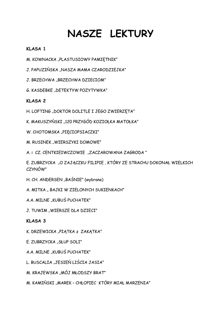 NASZE LEKTURY KLASA 1 M. KOWNACKA „PLASTUSIOWY PAMIĘTNIK” J. PAPUZIŃSKA „NASZA MAMA CZARODZIEJKA” J. BRZECHWA „BRZECHWA DZIECIOM” G. KASDEBKE „DETEKTYW POZYTYWKA” KLASA 2 H. LOFTING „DOKTOR DOLITLE I JEGO ZWIERZĘTA” K. MAKUSZYŃSKI „120 PRZYGÓD KOZIOŁKA MATOŁKA” W. CHOTOMSKA „PIĘCIOPSIACZKI” M. RUSINEK „WIERSZYKI DOMOWE” A. i CZ. CENTKIEIWCZOWIE „ZACZAROWANA ZAGRODA ” E. ZUBRZYCKA „O ZAJĄCZKU FILIPIE , KTÓRY ZE STRACHU DOKONAŁ WIELKICH CZYNÓW” H. CH. ANDERSEN „BAŚNIE” (wybrane) A. MITKA „ BAJKI W ZIELONYCH SUKIENKACH” A.A. MILNE „KUBUŚ PUCHATEK” J. TUWIM „WIERSZE DLA DZIECI” KLASA 3 K. DRZEWICKA „PIĄTKA z ZAKĄTKA” E. ZUBRZYCKA „SŁUP SOLI” A.A. MILNE „KUBUŚ PUCHATEK” L. BUSCALIA „JESIEŃ LIŚCIA JASIA” M. KRAJEWSKA „MÓJ MŁODSZY BRAT” M. KAMIŃSKI „MAREK – CHŁOPIEC KTÓRY MIAŁ MARZENIA” G. KASDEPKE „CO TO ZNACZY … czyli 101 zabawnych historyjek,… M. STRZAŁKOWSKA „RADY NIE OD PARADY 2” KLASA 4 J. BRZECHWA „AKADEMIA PANA KLEKSA” C. COLLODI „PINOKIO” C.S. LEWIS „LEW, CZAROWNICA I STARA SZAFA” J. OLECH” „DYNASTIA MIZIOŁKÓW” H. SIENKIEWICZ „JANKO MUZYKANT” KLASA 5 F. MOLNAR „CHŁOPCY Z PLACU BRONI ” L. M. MONTGOMERY „ANIA Z ZIELONEGO WZGÓRZA” E. NIZIURSKI „SPOSÓB NA ALCYBIADESA” H. SIENKIEWICZ” W PUSTYNI I W PUSZCZY” M. TWAIM „PRZYGODY TOMKA SAWYERA” B. PRUS „ANTEK” KLASA 6 F. H. BURNETT „TAJEMNICZY OGRÓD” I. JURGIELEWICZOWA „TEN OBCY” K. MAKUSZYŃSKI „SZATAN Z SIÓDMEJ KLASY” A. LINDGREN „BRACIA LWIE SERCE” S. LEM „BAJKI ROBOTÓW” (wybór) M. DĄBROWSKA „MARCIN KOZERA”