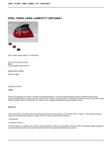 OPEL TIGRA LEWA LAMPA TY? ORYGINA? OPEL TIGRA LEWA LAMPATY? ORYGINA? OPEL TIGRA LEWA LAMPA TY? ORYGINA? Ocena: Nie ma jeszcze oceny Cena Cena sprzeda?y brutto: 50,00 z? Zadaj pytanie o produkt Producent: Opel Szczegó?y produktu O NAS Od wielu lat zajmujemy si? skupem i sprzeda?? lamp samochodowych. W swoim komisie posiadamy bogaty asortyment zarówno lamp u?ywanych pochodz?cych z demonta?u, jak i nowych cz??ci. Kupuj?c u nas masz pewno?? i gwarancj? rozruchow? towaru (14 dni od momentu odbioru). Istnieje mo?liwo?? zamówienia cz??ci, gdy? 2 razy w tygodniu realizowana jest nowa dostawa towaru. WYSY?KA Towar wysy?amy w tym samym dniu je?eli zamówienie zostanie z?o?one do godz.11:00 kurierem DPD. Po godz. 11:00 przesy?ka zostanie wys?ana w nast?pnym dniu roboczym. Istnieje mo?liwo?? wysy?ki paczek (forma p?atno?ci): - za pobraniem - przedp?ata na konto Przesy?ka dociera na nast?pny dzie? roboczy. Paczki nadawane s? tylko w dni powszednie. Istnieje mo?liwo?? osobistego odbioru reflektorów po wcze?niejszej konsultacji. Ceny wysy?ki zawieraj? równie? koszty pakowania zamówionego towaru. 1 / 3 OPEL TIGRA LEWA LAMPA TY? ORYGINA? Maj? Pa?stwo prawo zwrotu zakupionego towaru w ci?gu 14 dni (ustawowo) wraz z dowodem zakupu i formularzem odst?pienia od umowy zawartym na naszej stronie : http://lampy-samochodowe.pl/media/files/Formularz_Odstapienia_OU.pdf bez podania przyczyny, zwrócimy pieni?dze- nie zwracamy jedynie kosztów wysy?ki. Nie odbieramy przesy?ek za pobraniem. ZAKUP PRZEDMIOTU OPEL TIGRA LEWA LAMPA TY? ORYGINA? 1. Wybierz produkt i dodaj go do koszyka. 2. Wybierz sposób zap?aty/ odbioru, uzupe?nij dane do wysy?ki 3. Ewentualne sugestie prosz? wpisa? w polu wiadomo??. 4. Oczekuj na kuriera- sprawd? zawarto?? przesy?ki przy odbiorze (wszystkie paczki s? ubezpieczone) . STAN MAGA MODEL/ STRON OPIS ZYNO MARKA A CZ??CI WY OPEL LEWA TIGRA CENA TY?, A4-108 50,00 PLN CA?A, ?ADNA, ORYGIN A?, VALEO PARAGON/FAKTURA Do ka?dej zakupionej cz??ci do??czamy paragon . Je?li ?ycz? Pa?stwo sobie faktur?, prosimy o informacj? wraz z danymi niezb?dnymi do jej wystawienia. KONTAKT: Wszelkie zapytania prosimy kierowa? na e-mail: [email protected] Wszystkie przedmioty s? dok?adnie opisane i skatalogowane. Je?li masz dodatkowe pytania prosimy o kontakt z naszym ekspertem pod nr tel.: 739-020-099 2 / 3 OPEL TIGRA LEWA LAMPA TY? ORYGINA? GODZINY OTWARCIA: Pracujemy od poniedzia?ku do soboty w godz. 8:00- 18:00. STRONA WWW: www.lampy-samochodowe.pl ZAMIENNIKI: Nie kupuj zamienników na innych aukcjach. S? to cz??ci o krótkiej ?ywotno?ci i s?abej jako?ci wykonania. Pos?u?? na zdecydowanie krótszy czas ni? cz??ci oryginalne, mimo, ?e s? nowe. Zakup na naszych aukcjach jest jednoznaczny z akceptacj? regulaminu dost?pnego na naszej stronie. DZI?KUJEMY ZA ZAINTERESOWANIE 3 / 3 Powered by TCPDF (www.tcpdf.org)
