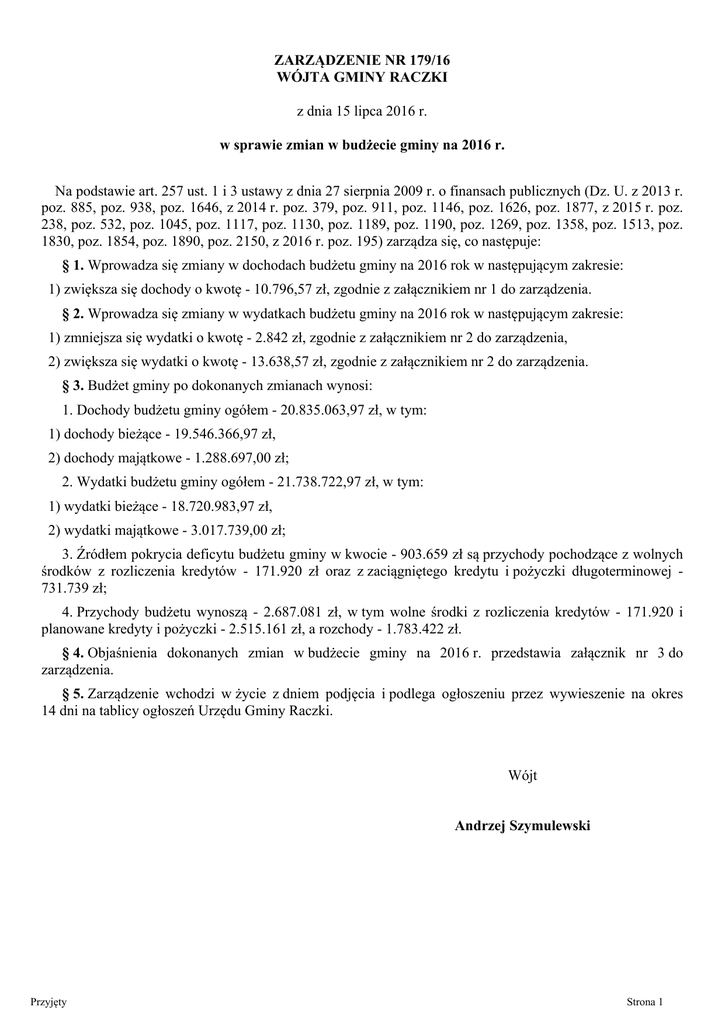 Zarządzenie Nr 179/16 Wójta Gminy Raczki z dnia 15 lipca 2016r. w