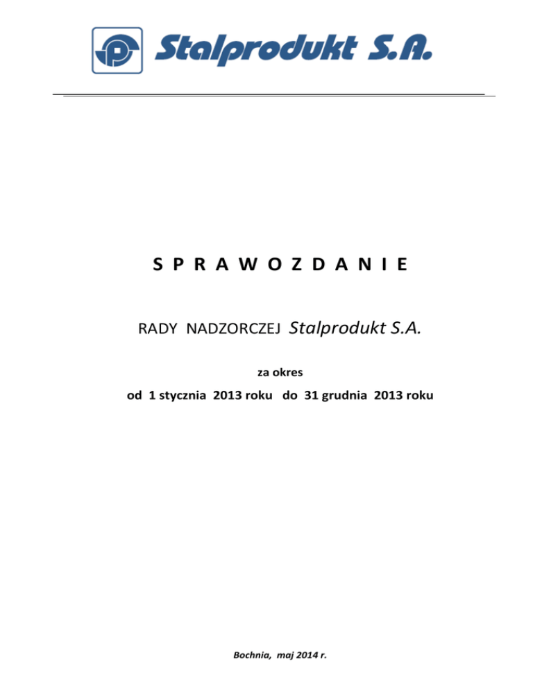 S P R A W O Z D A N I E RADY NADZORCZEJ Stalprodukt S.A. za okres od 1 stycznia 2013 roku do 31 grudnia 2013 roku Bochnia, maj 2014 r. Spis treści: I. Działalność i decyzje Rady Nadzorczej w 2013 roku. II. Ocena sytuacji ekonomiczno - finansowej Stalprodukt S.A. za okres od 1 stycznia 2013 roku do 31 grudnia 2013 roku. III. Ocena pracy Zarządu Spółki za okres od 1 stycznia 2013 roku do 31 grudnia 2013 roku. IV. Sprawozdanie Rady Nadzorczej z wyników oceny sprawozdania finansowego Stalprodukt S.A. za rok okres od 1 stycznia do 31 grudnia 2013 roku. V. Sprawozdanie Rady Nadzorczej z wyników oceny skonsolidowanego sprawozdania finansowego Grupy Kapitałowej Stalprodukt S.A. oraz sprawozdania Zarządu z działalności Grupy Kapitałowej Stalprodukt S.A. za okres od 1 stycznia do 31 grudnia 2013 roku. VI. Sprawozdanie Rady Nadzorczej z wyników oceny Sprawozdania Zarządu z działalności Spółki Stalprodukt S.A. za okres od 1 stycznia 2013 roku do 31 grudnia 2013 roku. VII. Ocena wniosku Zarządu w sprawie podziału zysku netto za 2013 rok. 1 I. Działalność i decyzje Rady Nadzorczej Stalprodukt S.A. W okresie od 1 stycznia 2013 roku do 31 grudnia 2013 roku Rada Nadzorcza działała w oparciu o przepisy Kodeksu Spółek Handlowych, postanowienia Statutu Spółki, Regulaminu Rady Nadzorczej Stalprodukt S.A. jak również zgodnie z przyjętymi przez Spółkę zasadami ładu korporacyjnego określonymi w Dobrych Praktykach Spółek Notowanych na GPW, prowadząc stały nadzór nad działalnością Spółki we wszystkich obszarach jej działania, a także rozpatrując zagadnienia i wnioski przedkładane na posiedzenia Rady przez Zarząd Spółki. Skład Rady Nadzorczej w okresie sprawozdawczym: W okresie od 1 stycznia 2013 roku do 31 grudnia 2013 roku Rada Nadzorcza pracowała w następującym składzie: - - w okresie od 1 stycznia do 21 czerwca 2013 r. Stanisław Kurnik - Przewodniczący Maria Sierpińska - Wiceprzewodnicząca Kazimierz Szydłowski - Sekretarz Janusz Bodek - Członek Tomasz Plaskura - Członek Augustine Kochuparampil - Członek Sanjay Samaddar - Członek w związku z upływem kadencji dotychczasowych członków Rady Nadzorczej Zwyczajne Walne Zgromadzenie Stalprodukt S.A. w dniu 21 czerwca 2013 roku powołało na kolejną kadencję Radę Nadzorczą w następującym składzie: Stanisław Kurnik - Przewodniczący Maria Sierpińska - Wiceprzewodnicząca Kazimierz Szydłowski - Sekretarz Janusz Bodek - Członek 2 Tomasz Plaskura - Członek Tomasz Ślęzak - Członek Sanjay Samaddar - Członek Działania statutowe Rada Nadzorcza w omawianym okresie analizowała wyniki finansowe Spółki, dokonywała oceny sytuacji ekonomicznej i gospodarczej funkcjonowania Spółki, uchwaliła przedstawiony przez Zarząd Plan Spółki Stalprodukt S.A. na 2013 rok. Rada Nadzorcza prowadziła w okresie sprawozdawczym swoją działalność w trybie posiedzeń zwoływanych przez Przewodniczącego Rady. Rada wykonywała swoje czynności kolegialnie. Na posiedzeniach Rady członkowie Zarządu przedstawiali obszerne informacje o aktualnej sytuacji ekonomiczno-finansowej Spółki, jej funkcjonowaniu, planach działania oraz istotnych wydarzeniach mogących mieć wpływ na funkcjonowanie Spółki. Zarząd Spółki szczegółowo informował Radę Nadzorczą o wszystkich istotnych zagadnieniach związanych z prowadzoną działalnością oraz o ryzykach z nimi związanych i sposobem zarządzania tymi ryzykami. Na każdym posiedzeniu Rada Nadzorcza szczegółowo analizowała osiągane przez Spółkę wyniki ekonomiczno-finansowe pod względem założeń do Planu i bieżącej sytuacji Spółki. Przedmiotem posiedzeń Rady Nadzorczej była kontrola i nadzór nad bieżącą działalnością Spółki we wszystkich dziedzinach jej działalności. Rada Nadzorcza w 2013 roku m.in.: - analizowała kwartalne wyniki finansowe Spółki, jak również ustalała wysokość premii kwartalnej dla Zarządu Spółki, - uchwaliła Plan Spółki Stalprodukt S.A. na 2013 rok, 3 - dokonała oceny sprawozdania Zarządu z działalności Spółki oraz sprawozdania finansowego Spółki za rok obrotowy od 1 stycznia do 31 grudnia 2012 roku, a także wniosku Zarządu dotyczącego podziału zysku netto za rok obrotowy od 1 stycznia do 31 grudnia 2012 roku i zarekomendowała podjęcie przez Zwyczajne Walne Zgromadzenie uchwał zgodnie z tymi wnioskami, - dokonała oceny skonsolidowanego sprawozdania finansowego Grupy Kapitałowej Stalprodukt S.A. oraz sprawozdania Zarządu z działalności Grupy Kapitałowej Stalprodukt S.A. za rok obrotowy od 1 stycznia do 31 grudnia 2012 roku i zarekomendowała podjęcie przez Zwyczajne Walne Zgromadzenie uchwały zgodnie z tym wnioskiem, - sporządziła i przyjęła sprawozdanie dotyczące działalności Rady Nadzorczej w okresie od 1 stycznia do 31 grudnia 2012 roku, - sporządziła i dokonała oceny działalności Spółki w roku 2012, - wyraziła zgodę na zawarcie umowy kredytowej z Bankiem PKO Bank Polski S.A., - podejmowała uchwały w zakresie wyrażania zgody na dokonanie przez Spółkę określonych czynności. Zgodnie z § 28 pkt 13 Statutu Spółki, w dniu 21 czerwca 2013 r. Rada Nadzorcza Uchwałą Nr 94/VIII/2013 dokonała wyboru biegłego rewidenta, firmę Biegły.pl Kancelaria Biegłych Rewidentów Spółka z o.o. z siedzibą we Wrocławiu, która przeprowadziła badanie sprawozdania finansowego Spółki za 2013 rok oraz skonsolidowanego sprawozdania finansowego Grupy Kapitałowej za rok 2013. Działania Rady Nadzorczej zostały udokumentowane w sporządzanych protokołach z posiedzeń Rady. Komitet Audytu Działania Rady Nadzorczej były wspomagane przez Komitet Audytu działający jako organ doradczy i opiniotwórczy działający w strukturach Rady Nadzorczej, powoływany spośród jej członków. W okresie od 1 stycznia do 31 grudnia 2013 roku Komitetu Audytu Rady Nadzorczej Stalprodukt S.A. wykonywał swoje obowiązki w następującym składzie: 4 - od 1 stycznia 2013 r. do 