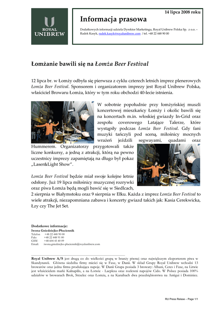 14 lipca 2008 roku Informacja prasowa Dodatkowych informacji udziela Dyrektor Marketingu, Royal Unibrew Polska Sp. z o.o. – Radek Kasyk, [email protected] / tel. +48 22 448 90 00 Łomżanie bawili się na Łomża Beer Festival 12 lipca br. w Łomży odbyła się pierwsza z cyklu czterech letnich imprez plenerowych Łomża Beer Festival. Sponsorem i organizatorem imprezy jest Royal Unibrew Polska, właściciel Browaru Łomża, który w tym roku obchodzi 40‐lecie istnienia. W sobotnie popołudnie przy łomżyńskiej muszli koncertowej mieszkańcy Łomży i okolic bawili się na koncertach m.in. włoskiej gwiazdy In‐Grid oraz zespołu coverowego Latające Talerze, które wystąpiły podczas Łomża Beer Festival. Gdy fani muzyki tańczyli pod sceną, miłośnicy mocnych wrażeń jeździli segwayami, quadami oraz Hummerem. Organizatorzy przygotowali także liczne konkursy, a jedną z atrakcji, którą na pewno uczestnicy imprezy zapamiętają na długo był pokaz „Laser&Light Show”. Łomża Beer Festival będzie miał swoje kolejne letnie odsłony. Już 19 lipca miłośnicy muzycznej rozrywki oraz piwa Łomża będą mogli bawić się w Siedlcach, 2 sierpnia w Białymstoku oraz 9 sierpnia w Ełku. Każda z imprez Łomża Beer Festival to wiele atrakcji, niezapomniana zabawa i koncerty gwiazd takich jak: Kasia Cerekwicka, Łzy czy The Jet Set. Dodatkowe informacje: Iwona Gniedziejko-Płuciennik Telefon Faks GSM Email: +48 22 448 90 00 +48 22 448 91 00 +48 604 45 40 09 [email protected] ––––––––––––––––––––––––––––––––––––––––––––––––––––––––––––––––––––––––––––––––––––– Royal Unibrew A/S jest drugą co do wielkości grupą w branży piwnej oraz największym eksporterem piwa w Skandynawii. Główna siedziba firmy mieści się w Faxe, w Danii. W skład Grupy Royal Unibrew wchodzi 13 browarów oraz jedna firma produkująca napoje. W Danii Grupa posiada 3 browary: Albani, Ceres i Faxe, na Litwie jest właścicielem marki Kalnapilis, a na Łotwie - Lacplesa oraz rozlewni napojów Cido. W Polsce posiada 100% udziałów w browarach Brok, Strzelec oraz Łomża, a na Karaibach dwa przedsiębiorstwa na Antigui i Dominice. RU Press Relase – Page 1/1 Royal Unibrew zatrudnia około 2 600 pracowników oraz eksportuje towary do około 65 krajów na całym świecie. Więcej na www.royalunibrew.com RU Press Relase – Page 2/1