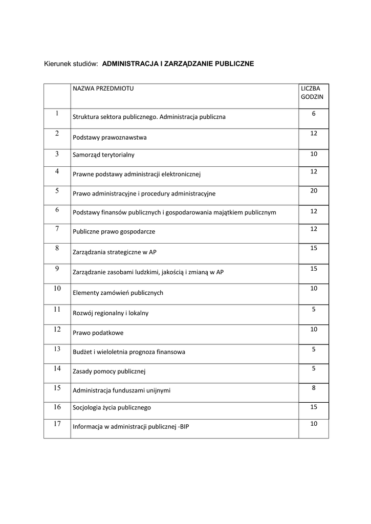 Kierunek studiów: ADMINISTRACJA I ZARZĄDZANIE PUBLICZNE NAZWA PRZEDMIOTU 1 2 Struktura sektora publicznego. Administracja publiczna Podstawy prawoznawstwa LICZBA GODZIN 6 12 3 Samorząd terytorialny 10 4 Prawne podstawy administracji elektronicznej 12 5 Prawo administracyjne i procedury administracyjne 20 6 Podstawy finansów publicznych i gospodarowania majątkiem publicznym 12 7 Publiczne prawo gospodarcze 12 8 9 10 11 Zarządzania strategiczne w AP Zarządzanie zasobami ludzkimi, jakością i zmianą w AP Elementy zamówień publicznych Rozwój regionalny i lokalny 15 15 10 5 12 Prawo podatkowe 10 13 Budżet i wieloletnia prognoza finansowa 5 14 Zasady pomocy publicznej 5 15 Administracja funduszami unijnymi 8 16 Socjologia życia publicznego 15 17 Informacja w administracji publicznej -BIP 10
