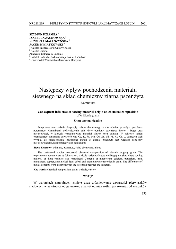 NR 218/219 BIULETYN INSTYTUTU HODOWLI I AKLIMATYZACJI ROŚLIN 2001 SZYMON DZIAMBA 1 IZABELLA JACKOWSKA 2 ELŻBIETA MAŁUSZYŃSKA 3 JACEK KWIATKOWSKI 4 1 Katedra Szczegółowej Uprawy Roślin Katedra Chemii Akademia Rolnicza w Lublinie 3 Instytut Hodowli i Aklimatyzacji Roślin, Radzików 4 Uniwersytet Warmińsko-Mazurski w Olsztynie 2 Następczy wpływ pochodzenia materiału siewnego na skład chemiczny ziarna pszenżyta Komunikat Consequent influence of sowing material origin on chemical composition of triticale grain Short communication Przeprowadzone badania dotyczyły składu chemicznego ziarna odmian pszenżyta pokolenia potomnego. Czynnikami doświadczenia były dwie odmiany pszenżyta: Presto i Bogo oraz miejscowości, w których reprodukowano materiał siewny tych odmian. W zakresie składu chemicznego oznaczono zawartość Mg, Ca, K, Fe, Mn, Cu, Zn, Ni, Pb, Co Cd. Z oznaczeń tych wynika, że zróżnicowanie zawartości metali w ziarnie pszenżyta jest większe pomiędzy miejscowościami, niż pomiędzy jego odmianami. Słowa kluczowe: odmiana, pszenżyto, skład chemiczny, ziarno The performed studies concerned chemical composition of triticale progeny grain. The experimental factors were as follows: two triticale varieties (Presto and Bogo) and sites where sowing material of these varieties was reproduced. Contents of magnesium, calcium, potassium, iron, manganese, copper, zinc, nickel, lead, cobalt and cadmium were recorded in grain. The differences of metals contents were larger between the sites than between the varieties. Key words: chemical composition, grain, triticale, variety WSTĘP W warunkach naturalnych istnieje duże zróżnicowanie zawartości pierwiastków śladowych w zależności od gatunków, a nawet odmian roślin, jak również od warunków 293 Szymon Dziamba ... wegetacji (Ernst, 1996; Gembarzewski, 1996; Kabata-Pendias, 1992; Ruszkowska i Wojcieska-Wyskupajtys, 1996). W literaturze przedmiotu brak jest doniesień odnośnie porównania składu chemicznego ziarna otrzymanego w tych samych warunkach, z materiału siewnego reprodukowanego w różnych miejscowościach, różniących się czynnikami siedliska. Dlatego też podjęcie badań określonych w tytule pracy ma swoje uzasadnienie. MATERIAŁ I METODY Materiał badawczy stanowiło ziarno pszenżyta pochodzące z doświadczenia prowadzonego w Katedrze Szczegółowej Uprawy Roślin Akademii Rolniczej w Lublinie. Czynnikami doświadczenia były dwie odmiany pszenżyta ozimego: Presto i Bogo oraz miejscowości, w których reprodukowano materiał siewny. Materiał siewny wymienionych odmian pochodził z Stacji Hodowli Roślin hodującej daną odmianę, reprodukcji (Akademii Rolniczej w Lublinie, Uniwersytetu WarmińskoMazurskiego w Olsztynie) i przechowalni Instytutu Hodowli i Aklimatyzacji Roślin w Radzikowie. Tak przygotowany materiał siewny w 1999 roku posłużył do założenia doświadczenia polowego, z którego otrzymane ziarno wykorzystano do oznaczeń chemicznych. Ziarno pszenżyta po wysuszeniu zmielono i zmineralizowano w piecu muflowym w temperaturze 450°C. Uzyskane popioły umieszczono w roztworze HCl (1:1) i rozcieńczono 0,1 mol · dm-3 HCl. W roztworach oznaczono zawartość metali posługując się techniką atomowej spektrometrii absorpcyjnej. Oznaczono zawartość: Mg, Ca, K, Mn, Fe, Zn, Pb, Co, Cu, Cd. WYNIKI I DYSKUSJA Zawartość metali w ziarnie pszenżyta przedstawiono na rysunku 1. Największe zróżnicowanie zawartości metali w ziarnie pszenżyta odmiany Presto i Bogo było dla potasu i magnezu (odpowiednio: 232,6 i 193,1 mg/kg s.m.). Zawartość wapnia była o 29 mg/kg s.m. większa w ziarnie Bogo. Różnice w zawartości żelaza, cynku i manganu w pszenżycie Presto i Bogo wynoszą od 3,38 do 6,42 mg/kg s.m. Natomiast różnice w poziomie zawartości ołowiu, niklu, kobaltu i miedzi pomiędzy obu odmianami pszenżyta są niewielkie i wynoszą poniżej 0,4 mg/kg s.m. Szereg zawartości metali w odmianie Presto przedstawia się następująco: K>Mg>Ca>Mn>Fe>Zn>Cu>Pb>Ni>Co>Cd, a w odmianie Bogo: K>Mg>Ca>Mn>Zn>Fe>Cu>Pb>Ni>Co>Cd Szereg zróżnicowania zawartości metali w obu odmianach pszenżyta: K>Mg>Ca>Mn>Fe>Zn>Pb>Ni>Co>Cu>Cd 294 1800 3,8 1500 3,6 mg/kg s.m. 1200 900 600 300 SHR IHAR IHAR Felin 0,32 0,31 0,3 0,29 0,28 0,27 Presto Cd 5700 Felin 0,26 IHAR SHR Bałcyny Felin Bogo Presto Ca SHR 50 SHR 100 Bałcyny 150 Bałcyny 0,33 Bałcyny 0,34 250 mg/kg s.m. 300 200 Bogo Presto IHAR SHR Bałcyny Felin Bogo Presto mg/kg s.m. 3 Cu 0 2,5 5600 2 5500 mg/kg s.m. mg/kg s.m. 3,2 2,8 0 Mg 3,4 Bogo mg/kg s.m. Szymon Dziamba ... 5400 5300 5200 1,5 1 0,5 IHAR Felin Pb Bogo 0 Presto IHAR SHR Felin Bogo Bałcyny K Presto 5100 Rys. 1 Zawartość metali w ziarnie pszenżyta Fig. 1. Content of metals in triticale grain W pszenżycie uprawianym w różnych miejscowościach największe zróżnicowanie zawartości metali dotyczyło też potasu i magnezu (odpowiednio 342,1 i 293,4 mg/kg s.m.). Różnica w zawartości wapnia wynosiła 63,7 mg/kg s.m. Zawartości cynku, żelaza i manganu w ziarnie pszenżyta z różnych miejscowości różniły się w granicach 5,9 do 9,96 mg/kg s.m. Natomiast zróżnicowanie zawartości miedzi i ołowiu wynosi 0,46 i 0,56 295 Szymon Dziamba ... 60 50 50 mg/kg s.m. 42 40 38 0,57 0,54 0,51 0,48 0,45 IHAR SHR Bałcyny Felin Bogo Presto 0,32 IHAR SHR Bałcyny Felin Sucha masa (%) – Dry mass Rys. 2. Zawartość metali i suchej masy w ziarnie pszenżyta Fig. 2. Content of metals (in mg/kg of dry mass) and dry mass in triticale grain IHAR 0,34 SHR 0,36 Bałcyny 0,38 % Felin 0,4 Presto 86,2 86 85,8 85,6 85,4 85,2 85 84,8 84,6 Bogo IHAR SHR Bałcyny Felin Bogo Presto 0,42 Ni Bogo 0,42 Presto mg/kg s.m. 0,6 36 296 IHAR Mn 44 Zn Presto IHAR SHR Bałcyny Felin 0 Bogo 10 0 46 mg/kg s.m. 20 10 Fe Co 30 SHR 20 40 Bałcyny 30 Felin 40 Bogo mg/kg s.m. 60 Presto mg/kg s.m. mg/kg s.m. Różnice w zawartości pozostałych metali: kobaltu, kadmu i niklu są nieznaczne poniżej 0,04 mg/kg s.