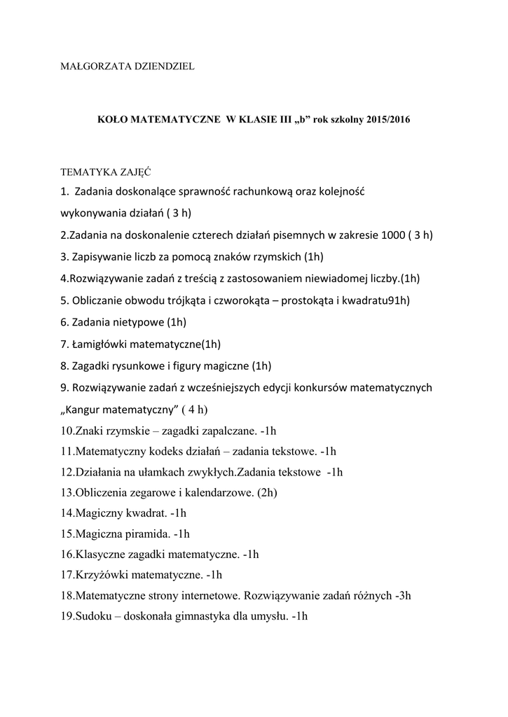 MAŁGORZATA DZIENDZIEL KOŁO MATEMATYCZNE W KLASIE III „b” rok szkolny 2015/2016 TEMATYKA ZAJĘĆ 1. Zadania doskonalące sprawnośd rachunkową oraz kolejnośd wykonywania działao ( 3 h) 2.Zadania na doskonalenie czterech działao pisemnych w zakresie 1000 ( 3 h) 3. Zapisywanie liczb za pomocą znaków rzymskich (1h) 4.Rozwiązywanie zadao z treścią z zastosowaniem niewiadomej liczby.(1h) 5. Obliczanie obwodu trójkąta i czworokąta – prostokąta i kwadratu91h) 6. Zadania nietypowe (1h) 7. Łamigłówki matematyczne(1h) 8. Zagadki rysunkowe i figury magiczne (1h) 9. Rozwiązywanie zadao z wcześniejszych edycji konkursów matematycznych „Kangur matematyczny” ( 4 h) 10.Znaki rzymskie – zagadki zapalczane. -1h 11.Matematyczny kodeks działań – zadania tekstowe. -1h 12.Działania na ułamkach zwykłych.Zadania tekstowe -1h 13.Obliczenia zegarowe i kalendarzowe. (2h) 14.Magiczny kwadrat. -1h 15.Magiczna piramida. -1h 16.Klasyczne zagadki matematyczne. -1h 17.Krzyżówki matematyczne. -1h 18.Matematyczne strony internetowe. Rozwiązywanie zadań różnych -3h 19.Sudoku – doskonała gimnastyka dla umysłu. -1h 20.Przygotowanie do konkursu matematycznego - rozwiązywanie zadań z gminnego konkursu matematycznego -3h 21.Przygotowanie do konkursu matematycznego Kangur. -3h 22. Rozwiązywanie interaktywnych testów. -1h