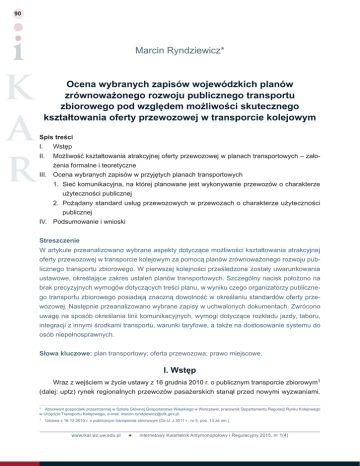 90 Marcin Ryndziewicz* Ocena wybranych zapisów wojewódzkich planów zrównoważonego rozwoju publicznego transportu zbiorowego pod względem możliwości skutecznego kształtowania oferty przewozowej w transporcie kolejowym Spis treści I. Wstęp II. Możliwość kształtowania atrakcyjnej oferty przewozowej w planach transportowych – założenia formalne i teoretyczne III. Ocena wybranych zapisów w przyjętych planach transportowych 1.Sieć komunikacyjna, na której planowane jest wykonywanie przewozów o charakterze użyteczności publicznej 2.Pożądany standard usług przewozowych w przewozach o charakterze użyteczności publicznej IV. Podsumowanie i wnioski Streszczenie W artykule przeanalizowano wybrane aspekty dotyczące możliwości kształtowania atrakcyjnej oferty przewozowej w transporcie kolejowym za pomocą planów zrównoważonego rozwoju publicznego transportu zbiorowego. W pierwszej kolejności prześledzone zostały uwarunkowania ustawowe, określające zakres ustaleń planów transportowych. Szczególny nacisk położono na brak precyzyjnych wymogów dotyczących treści planu, w wyniku czego organizatorzy publicznego transportu zbiorowego posiadają znaczną dowolność w określaniu standardów oferty przewozowej. Następnie przeanalizowano wybrane zapisy w uchwalonych dokumentach. Zwrócono uwagę na sposób określania linii komunikacyjnych, wymogi dotyczące rozkładu jazdy, taboru, integracji z innymi środkami transportu, warunki taryfowe, a także na dostosowanie systemu do osób niepełnosprawnych. Słowa kluczowe: plan transportowy; oferta przewozowa; prawo miejscowe. I. Wstęp Wraz z wejściem w życie ustawy z 16 grudnia 2010 r. o publicznym transporcie zbiorowym1 (dalej: uptz) rynek regionalnych przewozów pasażerskich stanął przed nowymi wyzwaniami. * Absolwent gospodarki przestrzennej w Szkole Głównej Gospodarstwa Wiejskiego w Warszawie; pracownik Departamentu Regulacji Rynku Kolejowego w Urzędzie Transportu Kolejowego; e-mail: [email protected]. 1 Ustawa z 16.12.2010 r. o publicznym transporcie zbiorowym (Dz.U. z 2011 r., nr 5, poz. 13 ze zm.). www.ikar.wz.uw.edu.pl internetowy Kwartalnik Antymonopolowy i Regulacyjny 2015, nr 1(4) 91 Marcin Ryndziewicz Ocena wybranych zapisów wojewódzkich planów zrównoważonego rozwoju publicznego transportu… Na określone jednostki samorządu terytorialnego oraz ministra właściwego do spraw transportu nałożone zostały obowiązki związane z organizowaniem i funkcjonowaniem publicznego transportu zbiorowego na obszarze swojej właściwości. Obejmują one m.in. obowiązek opracowania planu zrównoważonego rozwoju publicznego transportu zbiorowego (dalej: plan transportowy), a także prowadzenie działań mających na celu realizację lub aktualizację takiego planu. Realizując ustawowe zadania, związane z planowaniem publicznego transportu zbiorowego, samorządy wojewódzkie rozpoczęły w 2013 r. proces uchwalania planów transportowych. Zawarte w nich zapisy będą miały kluczowe znaczenie w zawieranych później umowach o świadczenie usług publicznych. Zgodnie z art. 28p ustawy z 28 marca 2003 r. o transporcie kolejowym2, powinny być one zawierane przez organizatorów publicznego transportu kolejowego „wyłącznie na podstawie i w zakresie określonym w planach transportowych”. Skuteczność zawartych w nich zapisów będzie więc miała kluczowe znaczenie dla kształtu kontraktowanej w kolejnych latach oferty przewozowej. Na potrzeby niniejszego artykułu przeanalizowane zostały plany transportowe województw, które jako pierwsze wywiązały się z obowiązku ich sporządzenia, tj.: warmińsko-mazurskiego, podlaskiego, podkarpackiego, pomorskiego i zachodniopomorskiego. II. Możliwość kształtowania atrakcyjnej oferty przewozowej w planach transportowych – założenia formalne i teoretyczne Europejska polityka transportowa już w 2001 r.3 wskazywała na konieczność zmiany struktury zadań przewozowych m.in. poprzez wzrost znaczenia transportu kolejowego. Oferta przewozowa w transporcie kolejowym powinna więc stanowić realną alternatywę w stosunku do indywidualnych środków transportu. Aby było to możliwe, należy zapewnić pasażerom wysoką dostępność usług, a także ich odpowiedni standard oraz bezpieczeństwo przy jednoczesnym zachowaniu akceptowalnych warunków taryfowych. Podejście takie potwierdzają wyniki badań zawartych w Bilansie Otwarcia UTK z 30 czerwca 2012 r.4, zgodnie z którym użytkownicy transportu kolejowego oczekują przede wszystkim: atrakcyjnej oferty cenowej, niezawodności i stabilności usług, ich odpowiedniej jakości, zasięgu i sprawności organizacyjnej, a także bezpieczeństwa wykorzystywanych środków transportu. Obszary te powinny być zatem przedmiotem szczególnej troski ze strony organizatorów, w zakresie ich kompetencji związanych z planowaniem i zarządzaniem publicznym transportem zbiorowym. Możliwość ich kształtowania została określona w art. 12 ust. 1 uptz, wskazującym obligatoryjne do uwzględnienia w planie transportowym treści. Ich zakres został jednak określony w sposób ogólny, umożliwiający organizatorom szeroką interpretację stopnia szczegółowości przyjmowanych ustaleń. Elementy bezpośrednio dotyczące zasad kształtowania oferty przewozowej przeanalizowane na potrzeby niniejszego artykułu obejmują: 1) sieć komunikacyjną, na której planowane jest wykonywanie przewozów o charakterze użyteczności publicznej (art. 12 ust. 1 pkt 1); 2) pożądany standard usług przewozowych w przewozach o charakterze użyteczności publicznej (art. 12 ust. 1 pkt 6). 2 Ustawa z 28.03.2003 r. o transporcie kolejowym (t. j.: Dz.U. z 2013 r., poz. 1594 ze zm.). 3 Biała Księga z 12.09.2001 r. „Polityka transportowa do 2010 r.: czas na decyzje”. 4 Pobrano z: http://www.utk.gov.pl/pl/aktualnosci/1934,BILANS-OTWARCIA-URZAD-TRANSPORTU-KOLEJOWEGO-STAN-NA-30-CZERWCA-2012. html (05.12.2014). www.ikar.wz.uw.edu