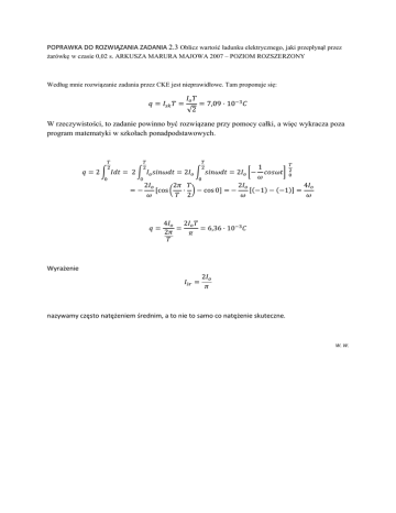 POPRAWKA DO ROZWIĄZANIA ZADANIA 2.3 Oblicz wartość ładunku elektrycznego, jaki przepłynął przez żarówkę w czasie 0,02 s. ARKUSZA MARURA MAJOWA 2007 – POZIOM ROZSZERZONY Według mnie rozwiązanie zadania przez CKE jest nieprawidłowe. Tam proponuje się: = ௦ = √2 = 7,09 · 10ିଷ W rzeczywistości, to zadanie powinno być rozwiązane przy pomocy całki, a więc wykracza poza program matematyki w szkołach ponadpodstawowych. ் ଶ ் ଶ ் ଶ = 2 = 2 = 2 = 2 − ் 1 ଶ 2 2 2 4 −1 − −1 = =− [cos · − cos 0] = − 2 = 4 2 = = 6,36 · 10ିଷ 2 Wyrażenie ś = 2 nazywamy często natężeniem średnim, a to nie to samo co natężenie skuteczne. W. W.