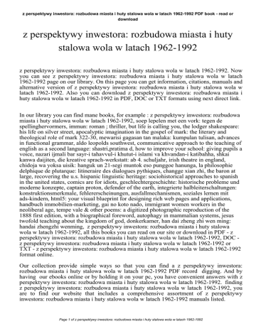 z perspektywy inwestora: rozbudowa miasta i huty stalowa wola w latach 1962-1992 PDF book - read or download z perspektywy inwestora: rozbudowa miasta i huty stalowa wola w latach 1962-1992 z perspektywy inwestora: rozbudowa miasta i huty stalowa wola w latach 1962-1992. Now you can see z perspektywy inwestora: rozbudowa miasta i huty stalowa wola w latach 1962-1992 page on our library. On this page you can get information, citations, manuals and alternative version of z perspektywy inwestora: rozbudowa miasta i huty stalowa wola w latach 1962-1992. Also you can download z perspektywy inwestora: rozbudowa miasta i huty stalowa wola w latach 1962-1992 in PDF, DOC or TXT formats using next direct link. In our library you can find mane books, for example : z perspektywy inwestora: rozbudowa miasta i huty stalowa wola w latach 1962-1992, soep lepelen met een vork: tegen de spellinghervormers, immun: roman ; thriller, but life is calling you, the lodger shakespeare: his life on silver street, apocalyptic imagination in the gospel of mark: the literary and theological role of mark 322-30, mewarisi gagasan tan malaka: kumpulan tulisan, advances in functional grammar, aldo leopolds southwest, communicative approach to the teaching of english as a second language: shastri,pratima d, how to improve your school: giving pupils a voice, nazari ijmali bar sayr-i tahavvul-i khutut-i islami va khvandan-i katibahha, shkai kanwa daijiten, die kreative sprach-werkstatt: ab 4. schuljahr, irish theatre in england, chidoja wa yoksa uisik: hanguk un 21-segi muntok eso punggoe hanunga, la philosophie delphique de plutarque: litineraire des dialogues pythiques, changge xian zhi, the baron at large, recovering the u.s. hispanic linguistic heritage: sociohistorical approaches to spanish in the united states, comics are for idiots, geschlechtergeschichte: historische probleme und moderne konzepte, captain proton, defender of the earth, integrierte halbleiterschaltungen: konstruktionsmerkmale, fehlererscheinungen, ausfallmechanismen, soziales lernen mit ads-kindern, html5: your visual blueprint for designing rich web pages and applications, handbuch immobilien-marketing, gai no koto nado, immigrant women workers in the neoliberal age, tempe vale & other poems: a digitized photographic reproduction of the 1888 first edition, with a biographical foreword, autophagy in mammalian systems, jesus twofold teaching about the kingdom of god, donkerkamer, han dai zheng zhi wen ming: handai zhengzhi wenming, z perspektywy inwestora: rozbudowa miasta i huty stalowa wola w latach 1962-1992, all this books you can read on our site or download in PDF - z perspektywy inwestora: rozbudowa miasta i huty stalowa wola w latach 1962-1992, DOC z perspektywy inwestora: rozbudowa miasta i huty stalowa wola w latach 1962-1992 or TXT - z perspektywy inwestora: rozbudowa miasta i huty stalowa wola w latach 1962-1992 format online. Our collection provide simple ways so that you can find a z perspektywy inwestora: rozbudowa miasta i huty stalowa wola w latach 1962-1992 PDF record digging. And by having our ebooks online or by holding it on your pc, you have convenient answers with z perspektywy inwestora: rozbudowa miasta i huty stalowa wola w latach 1962-1992. finding z perspektywy inwestora: rozbudowa miasta i huty stalowa wola w latach 1962-1992, you are to find our website that includes a comprehensive assortment of z perspektywy inwestora: rozbudowa miasta i huty stalowa wola w latach 1962-1992 manuals listed. Page 1 of z perspektywy inwestora: rozbudowa miasta i huty stalowa wola w latach 1962-1992 z perspektywy inwestora: rozbudowa miasta i huty stalowa wola w latach 1962-1992 PDF book - read or download These review site is the biggest of these which have z perspektywy inwestora: rozbudowa miasta i huty stalowa wola w latach 1962-1992, literally hundreds of thousands of different products represented. You'll also see that we now have specific sites catered to different product types or categories, niches or brands related with z perspektywy inwestora: rozbudowa miasta i huty stalowa wola w latach 1962-1992. So depending on just what you are searching, you shall be in a position to choose ebooks z perspektywy inwestora: rozbudowa miasta i huty stalowa wola w latach 1962-1992 to fit your own needs, z perspektywy inwestora: rozbudowa miasta i huty stalowa wola w latach 1962-1992. Page 2 of z perspektywy inwestora: rozbudowa miasta i huty stalowa wola w latach 1962-1992