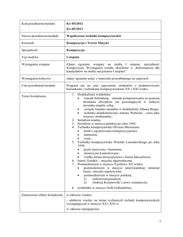 Kod przedmiotu/modułu K1-05/2012 K1-05/2013 Nazwa przedmiotu/modułu Współczesne techniki kompozytorskie Kierunek Kompozycja i Teoria Muzyki Specjalność Kompozycja Typ studiów I stopnia Wymagania wstępne Zdany egzamin wstępny na studia I stopnia, specjalność Kompozycja. Wymagania zostały określone w „Informatorze dla kandydatów na studia stacjonarne I stopnia”. Wymagania końcowe zdany egzamin ustny z materiału przerabianego na zajęciach Cele przedmiotu/modułu Program ma na celu zapoznanie studentów z podstawowymi kierunkami i technikami kompozytorskimi XX i XXI wieku. Treści kształcenia 1. Dodekafonia wiedeńska: • Arnold Schönberg – metoda komponowania za pomocą dwunastu dźwięków nie pozostających w żadnym stosunku między sobą; • związki tonalno-modalne w dodekafonii Albana Berga; • technika dodekafoniczna Antona Weberna – seria jako wzorzec strukturalny; 2. Serializm totalny. 3. Serializm w muzyce polskiej po roku 1945. 4. Technika kompozytorska Oliviera Messiaena: • modi o ograniczonej transpozycyjności; • harmonia; • rytm; 5. Technika kompozytorska Witolda Lutosławskiego po roku 1956: • język muzyczny i harmonia; • aleatoryzm kontrolowany; • wielka forma dwuczęściowa i forma łańcuchowa; 6. Iannis Xenakis – muzyka algorytmiczna. 7. Postmodernizm w muzyce II połowy XX wieku: • postmodernizm w muzyce amerykańskiej: minimal music, muzyka repetytywna; • postmodernizm w muzyce polskiej: 1) surkonwencjonalizm; 2) Andrzej Krzanowski i nowy romantyzm; • Zamierzone efekty kształcenia symbolika w muzyce Sofii Gubaiduliny; w zakresie wiedzy: - zdobycie wiedzy na temat wybranych technik kompozytorskich występujących w muzyce XX i XXI w. w zakresie umiejętności: 1 - zna i komponuje ściśle określone formy - dysponuje technikami kompozytorskimi samodzielną pracę nad utworem umożliwiającymi - potrafi wyszukiwać, analizować, oceniać, selekcjonować i użytkować informacje przy użyciu różnych źródeł i sposobów w zakresie kompetencji społecznych: - rozumie potrzebę uczenia się przez całe życie Formy kształcenia (np. wykład/ćwiczenia/inne) wykład Rok Punkty ECTS (nakład pracy studenta niezbędny do osiągnięcia zamierzonych efektów kształcenia) Semestr I 1 II 2 III 3 4 Tok 2012 1 2 Tok2013 2 2 2 2 zst egz 5 6 Punkty ECTS Ilość godzin w tygodniu Tok 2012, 2013 Rodzaj zaliczenia Tok 2012, 2013 Legenda Kryteria oceny i sposoby weryfikacji zal – zaliczenie; zst – zaliczenie ze stopniem; egz – egzamin; ekm – egzamin komisyjny sprawdzenie nabytej wiedzy z zakresu wybranych technik kompozytorskich występujących w muzyce XX i XXI w. podczas indywidualnego egzaminu ustnego. Przygotowanie pisemnego referatu na temat dowolnie wybranej techniki kompozytorskiej II poł XX w. lub XXI w. Przygotowanie analizy dodekafonicznego. Literatura dowolnie wybranego utworu 1. Maciej Gołąb, Dodekafonia. Studia nad teorią i kompozycją pierwszej połowy XX wieku, Bydgoszcz 1987. 2. Krzysztof Baculewski, Polska twórczość kompozytorska 1945-1884, PWM, Kraków 1987. 3. Olivier Messiaen, Technika mojego języka muzycznego, Res Facta nr 7, PWM, Kraków 1973. 4. Zeszyty naukowe nr 2, Akademia Muzyczna im. Feliksa Nowowiejskiego, Bydgoszcz 1992. 5. Charles Bodman Rae, Muzyka Lutosławskiego, PWN, Warszawa 1996. 6. Iannis Xenakis, Formalized Music. Thought and 2 Mathematics in Music, Pendragon Press, New York 1992. 7. Iannis Xenakis, W stronę metamuzyki, Res Facta nr 4, PWM, Kraków 1970. 8. Muzyka nr 4, 1998. 9. Zbigniew Skowron, Nowa muzyka amerykańska, Musica Iagellonica, Kraków 1995. 10. Paweł Strzelecki, "Nowy romantyzm" w twórczości kompozytorów polskich po roku 1975, Musica Iagellonica, Kraków 2006. 11. Muzyczny świat Andrzeja Krzanowskiego, Materiały sesji naukowej pod red. Janusza Patera, Akademia Muzyczna, Kraków 2000. 12. Sonia Wachowska, Andrzej Krzanowski. Katalog tematyczny dzieł, Akademia Muzyczna, Katowice 2000. 13. Iwona Bias, Aleksander Lasoń. Portret kompozytora, Akademia Muzyczna, Katowice 2001. 14. Iwona Bias, Eugeniusz Knapik. Kompozytor i pianista, Akademia Muzyczna, Katowice 2001. 15. Michael Kurtz, Sofia Gubaidulina. A biography, Indiana University Press, Bloomington and Indianapolis 2007. Język wykładowy polski, angielski Prowadzący dr hab. M. Bortnowski Uwagi 3