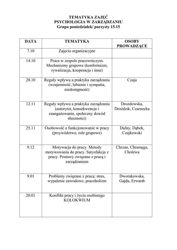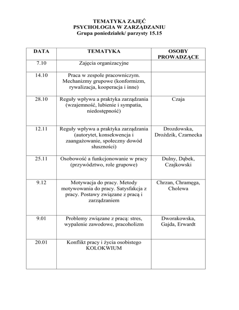 TEMATYKA ZAJĘĆ PSYCHOLOGIA W ZARZĄDZANIU Grupa