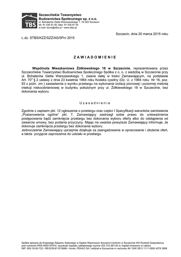 Szczecińskie Towarzystwo Budownictwa Społecznego sp. z o.o. ul. Bohaterów Getta Warszawskiego 1, 70-302 Szczecin tel: 91 430 91 00, faks: 91 430 91 45 e-mail: [email protected] • www.stbs.pl Szczecin, dnia 20 marca 2015 roku L.dz. STBS/KZZ/SZZ/AS/5Pn/ 2015 ZAWIADOMIENIE Wspólnota Mieszkaniowa Żółkiewskiego 18 w Szczecinie, reprezentowana przez Szczecińskie Towarzystwo Budownictwa Społecznego Spółka z o. o. z siedzibą w Szczecinie przy ul. Bohaterów Getta Warszawskiego 1, zwana dalej w treści Zamawiającym, na podstawie Art. 703 § 2 ustawy z dnia 23 kwietnia 1964 roku Kodeks cywilny (Dz. U. z 1964 roku Nr 16, poz. 93 z późn. zm.) zawiadamia o wyniku przetargu na wykonanie izolacji pionowej i poziomej metodą iniekcji niskociśnieniowej w budynku położonym przy ul. Żółkiewskiego 18 w Szczecinie, bez dokonania wyboru. Uzasadnienie Zgodnie z zapisem pkt. 12 ogłoszenia o przetargu oraz części I Specyfikacji warunków zamówienia „Postanowienia ogólne” pkt. 7, Zamawiający zastrzegł sobie prawo do unieważnienia postępowania bądź zamknięcia przetargu bez dokonania wyboru oferty albo do odstąpienia od zawarcia umowy, bez podania przyczyny. Mając na uwadze powyższe Zamawiający informuje, że dokonuje zamknięcia przetargu bez dokonania wyboru. Jednocześnie Zamawiający uprzejmie dziękuje za zaangażowanie w opracowanie i złożenie ofert, a także przyjęcie zaproszenia do udziału w przetargu. Spółka wpisana do Krajowego Rejestru Sadowego w Sądzie Rejonowym Szczecin-Centrum w Szczecinie XIII Wydział Gospodarczy pod numerem KRS 0000157810, wysokość kapitału zakładowego wynosi 253.743.567,00 zł, kapitał wniesiono w całości NIP: 852-18-50-722 • REGON:811015666 • Konto: PEKAO SA I oddział w Szczecinie nr rachunku 84 1240 3813 1111 0000 4379 3958