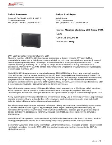 Salon Bemowo Salon Białołęka Powstańców Śląskich 87 lok. U10 B 01-466 Warszawa Tel. (22)427-89-95, (22)398-73-32 Kabrioletu 4 03-117 Warszawa Tel. (22)490-31-43, (22)243-36-05 Nazwa: Monitor studyjny LCD Sony BVML230 Cena: 26 350,00 zł Producent: Sony BVM-L230 23-calowy monitor studyjny LCD Studyjny monitor LCD BVM-L230 zastępuje przodujące w branży modele CRT serii BVM-A, zapowiadając nową erę w dziedzinach postprodukcji na potrzeby transmisji oraz produkcji, oceny i masteringu na potrzeby kina cyfrowego. W zastosowaniach profesjonalnych monitory LCD coraz częściej wypierają monitory CRT z uwagi na swoją wszechstronność i niższy całkowity koszt posiadania. Monitor BVM-L230 to bardzo zaawansowane urządzenie o wydajności przewyższającej wcześniejsze monitory CRT. Model BVM-L230 wyposażono w nową technologię TRIMASTER firmy Sony, aby stworzyć monitor LCD, który rzeczywiście zapewnia studyjną jakość. Podczas projektowania technologii TRIMASTER konieczne było zapewnienie dokładnej reprodukcji kolorów, precyzyjnego obrazowania i doskonałej spójności obrazu. Projektanci firmy Sony uzyskali ten cel dzięki trzem kluczowym elementom: specjalnie dostosowanemu panelowi LCD wysokiej klasy, nowemu, precyzyjnemu podświetleniu LED o wysokiej przejrzystości i zaawansowanemu torowi wizyjnemu. Specjalnie dostosowany panel LCD wysokiej klasy został wyposażony w 10-bitowy układ sterujący, który zapewnia płynne przejścia odcieni szarości i barw oraz wysoką szybkość klatkową, umożliwiającą wstawianie czarnych klatek w celu ograniczenia rozmycia powodowanego przez ruch. Nowy system precyzyjnego podświetlenia wykorzystuje diody LED o wysokiej czystości, zapewniając szeroką przestrzeń barw o standardzie referencyjnym, kontrolę równomierności oraz stabilność kolorów dzięki układowi automatycznego balansu bieli. Tor wizyjny wykorzystuje dwa najnowocześniejsze układy elektroniczne, umożliwiające precyzyjne 12-bitowe przetwarzanie sygnału wyjściowego. Jeden z tych układów jest odpowiedzialny za konwersję I/P i generuje najmniejszą możliwą liczbę artefaktów, podczas gdy drugi skupia się na bardzo dokładnym zarządzaniu kolorami, oferując stabilność, spójność i precyzyjną emulację standardów. Model BVM-L230 zapewnia także możliwość wyświetlania dwóch obrazów lub ich łączenia, a także funkcję powiększania pikseli, jeszcze bardziej zwiększającą elastyczność dla użytkownika. Doskonała wydajność oraz zalety technologii LCD (niewielka masa, mniejsza grubość i elastyczność montażu) sprawiają, że model BVM-L230 jest godnym następcą studyjnych monitorów CRT do obsługi transmisji. strona 1 / 3 Idealne rozwiązanie do szerokiej gamy zastosowań referencyjnych i związanych z masteringiem. Monitor idealnie sprawdza się w TRANSMISJI (studio, reżyserka itp.), PRODUKCJI (wóz transmisyjny, ściana monitorów, sterowanie kamerą i rejestratorem VTR itp.) i POSTPRODUKCJI (konsole montażowe średniej klasy, obsługujące wiele formatów, kino telewizyjne i kino cyfrowe). Doskonała jakość obrazu, dorównująca najlepszym monitorom CRT Monitor BVM-L230 umożliwia wyświetlanie na ekranie LCD wysokiej natywnej rozdzielczości 1920x1080. Dzięki połączeniu odpowiednio dostosowanego panelu LCD, 10-bitowych układów sterujących, zapewniających płynną gradację kolorów, precyzyjnego podświetlenia LED z szeroką gamą kolorów i spójnym obrazem oraz 12-bitowego procesora toru wizyjnego sygnału wyjściowego, który zapewnia dokładną reprodukcję kolorów i zaawansowaną konwersję I/P, model BVML230 wyznacza nowe standardy w dziedzinie referencyjnych monitorów LCD. Doskonała precyzja kolorów Nowatorski system zarządzania kolorami zapewnia spójne i powtarzalne odwzorowanie barw zgodnie ze standardami ITU-709, SMPTE-C i EBU, niezależnie od używanego monitora. Poziom dokładności jest identyczny jak w przypadku monitorów CRT z serii BVM-A. Wyjątkowa głębia kolorów i szarości zapewniająca realistyczną jakość obrazu Umożliwia to zastosowanie 10-bitowych układów sterujących panelu LCD i 12-bitowego przetwarzania sygnału wyjściowego. Gwarantowana jakość obrazu Doskonała wydajność monitora BVM-L230 w kluczowych obszarach, takich jak jakość obrazu, dokładność, spójność i stabilność, oznacza, że urządzenie to stanowi naturalny wybór jako narzędzie pomiarowe i referencyjne. Niezmiennie wysoka jakość obrazu Obraz ma mniej zakłóceń niż w przypadku monitorów CRT bez konieczności dostosowywania zbieżności, geometrii, liniowości czy wyśrodkowania. Monitor BVM-L230 jest również odporny na zakłócenia elektromagnetyczne. Wierna reprodukcja obrazu z przeplotem Monitor może wyświetlać obraz z przeplotem w takiej jakości, jak monitory CRT. Wysoka jakość obrazu ruchomego Tryb wstawiania czarnych klatek znacząco ogranicza rozmycie ruchomego obrazu. Wzorcowa spójność obrazu Jednakowe, powtarzalne nasycenie barw oraz odwzorowanie szarości pozwala zachować spójność kolorystyczną między wieloma monitorami. Większa efektywność pracy Nowe tryby wyświetlania obrazu (Side by Side, Wipe, Butterfly, Blending) i funkcja powiększania pikseli umożliwiają szybkie porównanie obrazów z dwóch źródeł oraz ich ocenę. Niezwykła wszechstronność Dzięki szerokiej gamie wejść i obsłudze wielu różnych formatów sygnału monitor BVM-L230 nadaje się zarówno do zastosowań opartych na technice AV, jak i tych wykorzystujących platformę IT. Daje to możliwość wyboru żądanego formatu, z kinem cyfrowym włącznie. Rozwiązanie na długie lata Obsługa wielu formatów i rozdzielczości HD oraz opcjonalne karty dekoderów sprawiają, iż monitor BVM-L230 pozostanie nowoczesny przez wiele lat. Instalacja i konfiguracja ustawień łatwiejsza niż w przypadku monitorów CRT Niewielkie gabaryty, mały ciężar i niska emisja ciepła. Niższe wymagania w