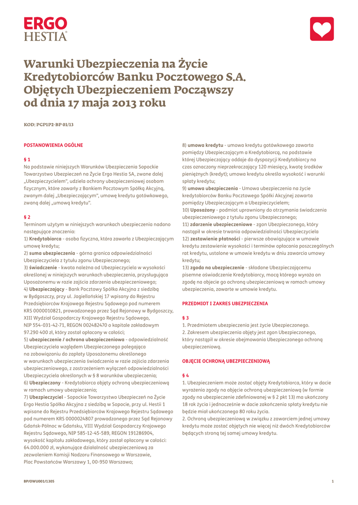 Warunki Ubezpieczenia na Życie Kredytobiorców Banku Pocztowego S.A. Objętych Ubezpieczeniem Począwszy od dnia 17 maja 2013 roku kod: PGP1P2-BP 01/13 POSTANOWIENIA OGÓLNE §1 Na podstawie niniejszych Warunków Ubezpieczenia Sopockie Towarzystwo Ubezpieczeń na Życie Ergo Hestia SA, zwane dalej „Ubezpieczycielem”, udziela ochrony ubezpieczeniowej osobom fizycznym, które zawarły z Bankiem Pocztowym Spółką Akcyjną, zwanym dalej „Ubezpieczającym”, umowę kredytu gotówkowego, zwaną dalej „umową kredytu”. §2 Terminom użytym w niniejszych warunkach ubezpieczenia nadano następujące znaczenia: 1) Kredytobiorca - osoba fizyczna, która zawarła z Ubezpieczającym umowę kredytu; 2) suma ubezpieczenia - górna granica odpowiedzialności Ubezpieczyciela z tytułu zgonu Ubezpieczonego; 3) świadczenie - kwota należna od Ubezpieczyciela w wysokości określonej w niniejszych warunkach ubezpieczenia, przysługująca Uposażonemu w razie zajścia zdarzenia ubezpieczeniowego; 4) Ubezpieczający - Bank Pocztowy Spółka Akcyjna z siedzibą w Bydgoszczy, przy ul. Jagiellońskiej 17 wpisany do Rejestru Przedsiębiorców Krajowego Rejestru Sądowego pod numerem KRS 0000010821, prowadzonego przez Sąd Rejonowy w Bydgoszczy, XIII Wydział Gospodarczy Krajowego Rejestru Sądowego, NIP 554-031-42-71, REGON 002482470 o kapitale zakładowym 97.290 400 zł, który został opłacony w całości; 5) ubezpieczenie / ochrona ubezpieczeniowa - odpowiedzialność Ubezpieczyciela względem Ubezpieczonego polegająca na zobowiązaniu do zapłaty Uposażonemu określonego w warunkach ubezpieczenia świadczenia w razie zajścia zdarzenia ubezpieczeniowego, z zastrzeżeniem wyłączeń odpowiedzialności Ubezpieczyciela określonych w § 8 warunków ubezpieczenia; 6) Ubezpieczony - Kredytobiorca objęty ochroną ubezpieczeniową w ramach umowy ubezpieczenia; 7) Ubezpieczyciel - Sopockie Towarzystwo Ubezpieczeń na Życie Ergo Hestia Spółka Akcyjna z siedzibą w Sopocie, przy ul. Hestii 1 wpisane do Rejestru Przedsiębiorców Krajowego Rejestru Sądowego pod numerem KRS 0000024807 prowadzonego przez Sąd Rejonowy Gdańsk-Północ w Gdańsku, VIII Wydział Gospodarczy Krajowego Rejestru Sądowego, NIP 585-12-45-589, REGON 191286904, wysokość kapitału zakładowego, który został opłacony w całości: 64.000.000 zł, wykonujące działalność ubezpieczeniową za zezwoleniem Komisji Nadzoru Finansowego w Warszawie, Plac Powstańców Warszawy 1, 00-950 Warszawa; BP/OWU001/1305 8) umowa kredytu - umowa kredytu gotówkowego zawarta pomiędzy Ubezpieczającym a Kredytobiorcą, na podstawie której Ubezpieczający oddaje do dyspozycji Kredytobiorcy na czas oznaczony nieprzekraczający 120 miesięcy, kwotę środków pieniężnych (kredyt); umowa kredytu określa wysokość i warunki spłaty kredytu; 9) umowa ubezpieczenia - Umowa ubezpieczenia na życie kredytobiorców Banku Pocztowego Spółki Akcyjnej zawarta pomiędzy Ubezpieczającym a Ubezpieczycielem; 10) Uposażony - podmiot uprawniony do otrzymania świadczenia ubezpieczeniowego z tytułu zgonu Ubezpieczonego; 11) zdarzenie ubezpieczeniowe - zgon Ubezpieczonego, który nastąpił w okresie trwania odpowiedzialności Ubezpieczyciela 12) zestawienie płatności - pierwsze obowiązujące w umowie kredytu zestawienie wysokości i terminów opłacania poszczególnych rat kredytu, ustalone w umowie kredytu w dniu zawarcia umowy kredytu; 13) zgoda na ubezpieczenie - składane Ubezpieczającemu pisemne oświadczenie Kredytobiorcy, mocą którego wyraża on zgodę na objecie go ochroną ubezpieczeniową w ramach umowy ubezpieczenia, zawarte w umowie kredytu. PRZEDMIOT I ZAKRES UBEZPIECZENIA §3 1. Przedmiotem ubezpieczenia jest życie Ubezpieczonego. 2. Zakresem ubezpieczenia objęty jest zgon Ubezpieczonego, który nastąpił w okresie obejmowania Ubezpieczonego ochroną ubezpieczeniową. OBJĘCIE OCHRONĄ UBEZPIECZENIOWĄ §4 1. Ubezpieczeniem może zostać objęty Kredytobiorca, który w dacie wyrażenia zgody na objęcie ochroną ubezpieczeniową (w formie zgody na ubezpieczenie zdefiniowanej w § 2 pkt 13) ma ukończony 18 rok życia i jednocześnie w dacie zakończenia spłaty kredytu nie będzie miał ukończonego 80 roku życia. 2. Ochroną ubezpieczeniową w związku z zawarciem jednej umowy kredytu może zostać objętych nie więcej niż dwóch Kredytobiorców będących stroną tej samej umowy kredytu. 1 §5 1. Z zastrzeżeniem postanowień ust. 2 poniżej, objęcie ochroną ubezpieczeniową Kredytobiorcy, w odniesieniu do którego kwota kredytu z umowy kredytu przekracza kwotę 100.000 zł (słownie: sto tysięcy złotych), uzależnione jest od wydania indywidualnej zgody przez Ubezpieczyciela. Przed wyrażeniem zgody przez Ubezpieczyciela wymagane jest wypełnienie przez Kredytobiorcę kwestionariusza medycznego, przy czym Ubezpieczyciel zastrzega sobie ponadto prawo do skierowania Kredytobiorcy na badania lekarskie (z wyłączeniem badań genetycznych). Badania lekarskie przeprowadzane są w placówce medycznej wskazanej przez Ubezpieczyciela oraz na koszt Ubezpieczyciela. 2. W przypadkach określonych w ust. 1 i ust. 5 niniejszego paragrafu Ubezpieczyciel zastrzega sobie prawo do odmowy objęcia danego Kredytobiorcy ochroną ubezpieczeniową lub zaproponowania Kredytobiorcy objęcia ochroną ubezpieczeniową na zasadach odbiegających od określonych w umowie ubezpieczenia, w tym zmiany wysokości składki ubezpieczeniowej. 3. Propozycja objęcia Kredytobiorcy ochroną ubezpieczeniową na zasadach odbiegających od określonych w umowie ubezpieczenia, o której mowa w ust. 2 powyżej (dalej: „propozycja Ubezpieczyciela”) zostanie przekazana Ubezpieczającemu oraz Kredytobiorcy (za pośrednictwem Ubezpieczającego) w terminie do 5 dni roboczych od daty doręczenia Ubezpieczycielowi wszystkich wymaganych dokumentów niezbędnych do dokonania przez Ubezpieczyciela oceny ryzyka ubezpieczeniowego. 4. Akceptacja propozycji Ubezpieczy