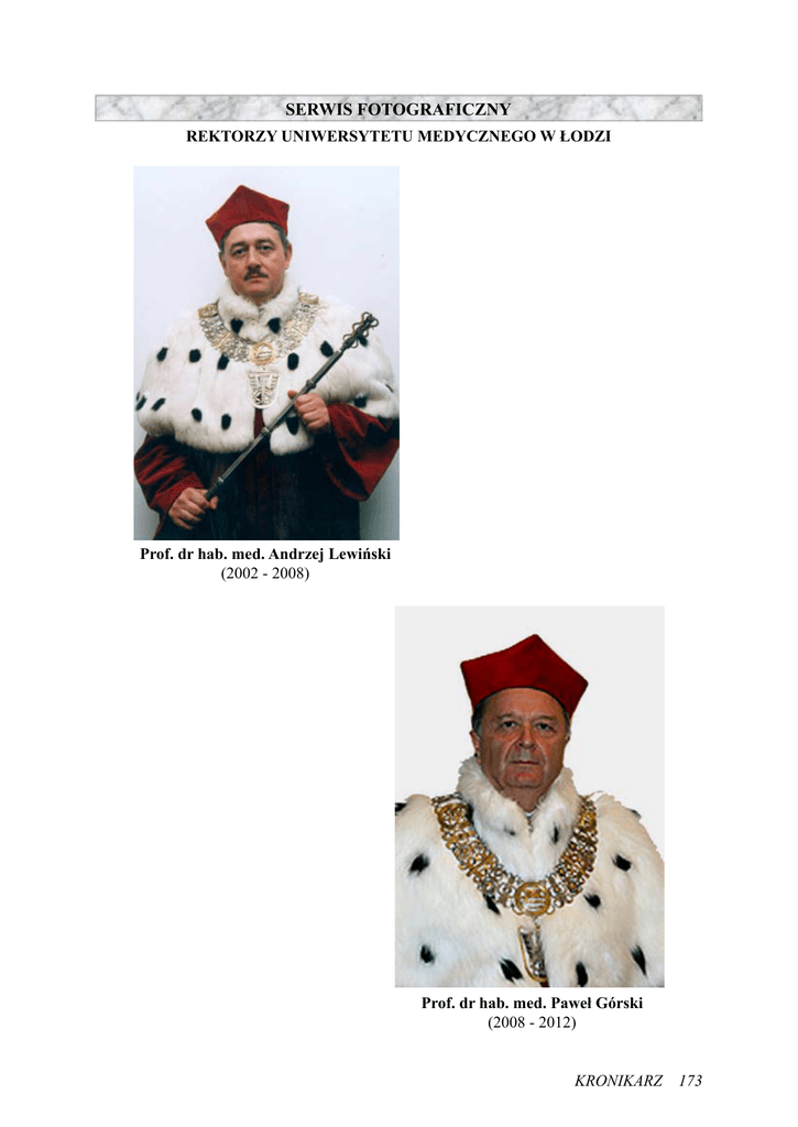 SERWIS FOTOGRAFICZNY Rektorzy Uniwersytetu Medycznego w Łodzi Prof. dr hab. med. Andrzej Lewiński (2002 - 2008) Prof. dr hab. med. Paweł Górski (2008 - 2012) KRONIKARZ 173 Doktorzy honoris causa Uniwersytetu Medycznego w Łodzi Prof. Felipe Freijo Casanueva Prof. Teofan M. Domżał Dr Marek Edelman 174 KRONIKARZ Prof. Robert H. Jones Prof. Stanisaw Jan Konturek Prof. Jerzy A. G. Vetulani KRONIKARZ 175 inauguracja roku akademickiego 2007/2008 Łódź, Teatr Wielki Piotrków Trybunalski 176 KRONIKARZ Wydział Fizjoterapii Wydział Wojskowo-Lekarski KRONIKARZ 177 Promocja na stopień podpułkownika Absolwenci studiów w języku angielskim 178 KRONIKARZ Kardynał Javier Lozano Barragán i ArcybiskupWładysław Ziółek Chór Uniwersytetu Medycznego w Łodzi KRONIKARZ 179 profesor naszej uczelni doktorem honoris causa śląskiego uniwersytetu medycznego w katowicach Prof. Marek Pawlikowski, JM Rektor ŚUM w Katowicach - prof. Ewa Małecka-Tendera, prof. Marian Zembala, prof. Marian Ratajczak, JM Rektor UM w Łodzi - prof. Andrzej Lewiński Od lewej: prof. Marian Ratajczak, prof. Marek Pawlikowski, prof. Franciszek Kokot 180 KRONIKARZ