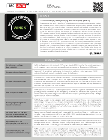 Białołęcka 158E • 03-253 Warszawa • tel.: +48+48 22 510 14 40 • fax: +48+48 22 741 69 33 • hotline 24h:24h: +48+48 22 510 14 79 • e-mail: [email protected] • www.rscautoid.pl Białołęcka 158E • 03-253 Warszawa • tel.: 22 510 14 40 • fax: 22 741 69 33 • hotline 22 510 14 79 • e-mail: [email protected] • www.rscautoid.pl WING 5 INTERMEC INTERMECPC23D PC23D Zaawansowany system operacyjny WLAN następnej generacji System operacyjny WiNG 5 firmy Zebra Technologies to produkt następnejktóre generacji w ewolucji Drukarka Intermec PC23d jestjest małym gabarytowo urządzeniem, nadaje sięsię dodo Drukarka Intermec PC23d małym gabarytowo urządzeniem, które nadaje architektur sieci WLAN. WiNG 5 został zaprojektowany w taki sposób, by umożliwiać sprawne skawielu zastosowań, gdzie najczęściej potrzebna jestjest mniejsza ilość etykiet czyczy teżteż opawielu zastosowań, gdzie najczęściej potrzebna mniejsza ilość etykiet opalowanie: od najmniejszych sieci po duże, rozproszone geograficznie instalacje. Innowacyjną cechą sek. Drukarka PC23d jestjest prosta ww obsłudze. Posiada wbudowany wyświetlacz LCD. sek. Drukarka PC23d prosta obsłudze. Posiada wbudowany wyświetlacz LCD. architektury WiNG 5 jest zespołowa, rozproszona płaszczyzna sterowania, zapewniająca system operacyjny gotowy do obsługi sieci sterowanych programowo (software-defined networking, SDN) i mogący nadawać funkcje kontrolera każdemu punktowi dostępowemu w danej sieci. Każdy punkt dostępowy jest teraz „świadomy” sieci i dostarcza informacje potrzebne do prawdziwej optymalizacji wydajności, dzięki czemu wszystkie elementy infrastruktury bezprzewodowej sieci LAN mogą ze sobą współpracować i dbać o wyznaczanie za każdym razem optymalnej ścieżki dla każdej transmisji. WiNG 5 zapewnia odporność sieci opartej na samodzielnych punktach SPECYFIKACJA TECHNICZNA SPECYFIKACJA TECHNICZNA dostępowych (i nieposiadającej dzięki temu słabych stron sieci obejmujących scentralizowany kontroler) oraz innowacyjne cechy przenoszące wydajność, niezawodność, bezpieczeństwo, skalowalność oraz łatwość zarządzania na całkiem nowy poziom. Efekt? Maksymalna dostępność mm 54 mmpracy w zarządzanie oraz prawdziwie płynna i bezpieczeństwo sieci przy minimalnym54 wkładzie i niezawodna mobilność dla użytkowników. 900 mm 900 mm INTERMEC PC23D Metoda Druku Metoda Druku Max. szer. druku Max. szer. druku Max długość druku Max długość druku Standardowe Standardowe wyposażenie wyposażenie Prędkość druku Prędkość druku Rozdzielczość Rozdzielczość Max. szer. etykiety Max. szer. etykiety Kompleksowa obsługa Komunikacja łącznościKomunikacja Wi-Fi Termiczna Termiczna 5656 mm mm 1727 mm 1727 mm Zegar Czasu Rzeczywistego (RTC) Zegar Czasu Rzeczywistego (RTC) 8 dots/mm 8 dots/mm 203 dpi 203 dpi KLUCZOWE CECHY 1212 dots/mm dots/mm 300dpi 300dpi 6060 mm mm WiNG obsługuje wszystkie protokoły Wi-Fi, w tym standard 802.11a/b/g/n/ac, umożliwiając stworzenie przystępnego cenowo planu migracji opartego oWiFi, potrzeby danego przedsiębiorstwa. Standardowo: USB 2.0, USB Host Opcjonalnie: Serial, parallel, WiFi, Bluetooth Standardowo: USB 2.0, USB Host Opcjonalnie: Serial, parallel, Bluetooth PL,PL, Fingerprint, ZSim (ZPLII Simulation), ESim (EPL2 DSim (DPL Fingerprint, ZSim (ZPLII Simulation), ESim (EPL2 Simulation), DSim (DPL System WiNG umożliwia budowanie sieciSimulation), dowolnej wielkości – od małych sieci WLAN Firmware Firmware Nadzwyczajna skalowalność Simulation), XML enabled forfor SAP® AIIAII and Oracle® WMS Simulation), XML enabled SAP® and Oracle® WMS w jednej lokalizacji po duże, wieloobiektowe sieci globalne. Wewn. średnica Wewn. średnica rolki taśmy rolki taśmy 12,7mm(1/2”); 26mm (1”) 12,7mm(1/2”); 26mm (1”) Niezależnie od zastosowanej infrastruktury, WiNG 5 dostarcza wymagane informacje wszystkim elementom: samodzielnym, autonomicznym punktom dostępowym lub punktom doMax. długość taśmy Max. długość taśmy 91,1m lub 274,32m 91,1m lub 274,32m Nadzwyczajna elastyczność. stępowym wykorzystywanym przez kontroler, ale mogącym pracować także w trybie samo2,36” – 4,33” Szerokość taśmy 2,36” – 4,33” Szerokość taśmy dzielnym, kontrolerom wirtualnym, kontrolerom fizycznym w oddziałach firmy, sieciowemu 128MB Flash memory, 128MB SDRAM (opcjonalnie dodo 32GB) centrum operacyjnemu (NOC) i chmurze. 128MB Flash memory, 128MB SDRAM (opcjonalnie 32GB) Pamięć wbudowana Pamięć wbudowana 1212 Monotype True Type fonts i 4i bitmap fonts (tylko IPL) Monotype True Type fonts 4 bitmap fonts (tylko IPL) WiNG dostarcza informacje i przekazuje stosowne funkcje wszystkim elementom sieci, wy1D1D - wszystkie główne kody jednowymiarowe - wszystkie główne kody jednowymiarowe posażając każdy kontroler i punkt dostępowy w informacje potrzebne do uzyskania „świaMoc Drukowane inteligencji kody rozproszonej Drukowane kody 2D2D - Aztec, Code 16K, Code 49,49, Data Matrix, Dot Code, EAN-8, EAN-13, EAN.UCC 128, Grid Matrix, - Aztec, Code 16K, Code Data Matrix, Dot Code, EAN-8, EAN-13, EAN.UCC 128, Grid Matrix, domości sieci” i dynamicznego wyznaczania tras ruchu po najbardziej efektywnej z dostępHIBC 39,39, HIBC 128, MSI, PDF417, Micro PDF417, Planet, Plessey, Postnet, QR-Code, RSS-14 HIBC HIBC 128, MaxiCode, MSI, PDF417, Micro PDF417, Planet, Plessey, Postnet, QR-Code, RSS-14 nych wMaxiCode, danym momencie ścieżek. Fonty wbudowane Fonty wbudowane Temperatura Temperatura 5 –5 40˚C – 40˚C WiNG łączy w sobie same najlepsze cechy: prawdziwie hierarchiczny system zarządzania, 10-80 %% bez kondensacji 10-80 bez kondensacji zapewniający nowy poziom pod względem prostoty zarządzania oraz odporności poprzez Nadzwyczajna elastyczność 1.45 kgkg umożliwianie kontrolerom przyłączania innych kontrolerów i punktów dostępowych i zaWaga 1.45 Waga i przeżywalność sieci rządzania nimi, przyx jedn