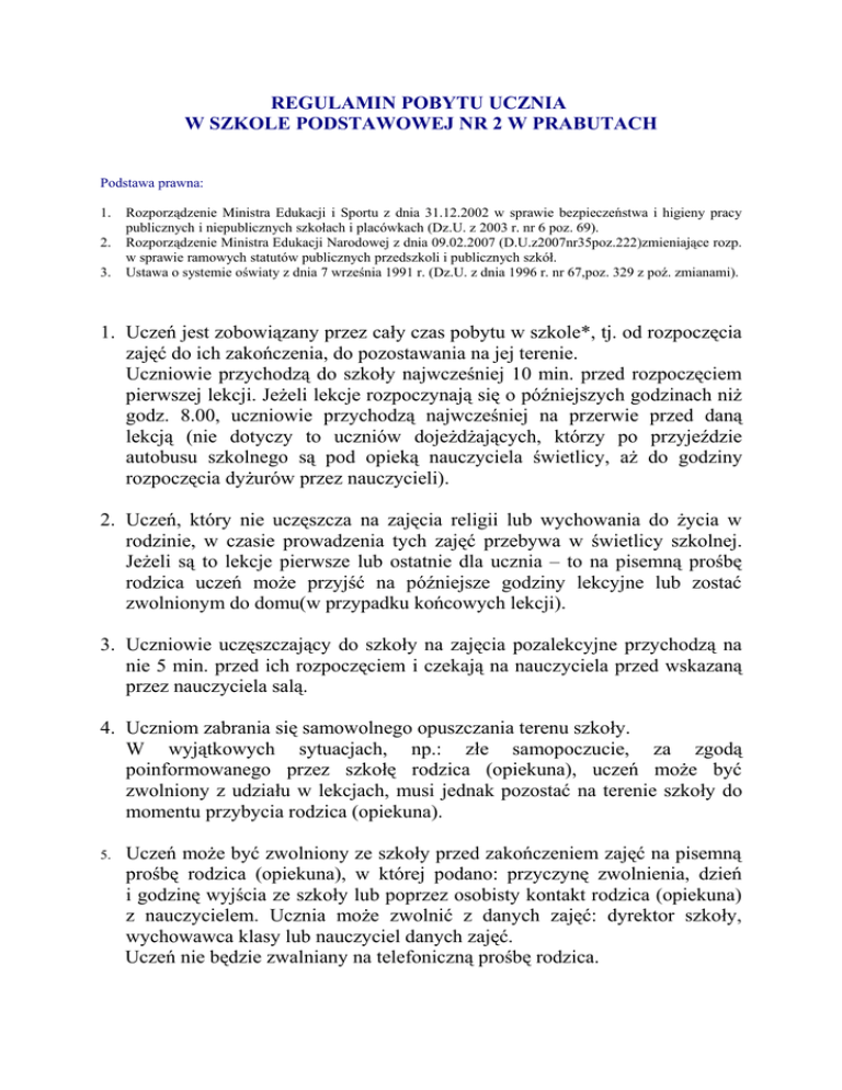 REGULAMIN POBYTU UCZNIA W SZKOLE PODSTAWOWEJ NR 2 W PRABUTACH Podstawa prawna: 1. 2. 3. Rozporządzenie Ministra Edukacji i Sportu z dnia 31.12.2002 w sprawie bezpieczeństwa i higieny pracy publicznych i niepublicznych szkołach i placówkach (Dz.U. z 2003 r. nr 6 poz. 69). Rozporządzenie Ministra Edukacji Narodowej z dnia 09.02.2007 (D.U.z2007nr35poz.222)zmieniające rozp. w sprawie ramowych statutów publicznych przedszkoli i publicznych szkół. Ustawa o systemie oświaty z dnia 7 września 1991 r. (Dz.U. z dnia 1996 r. nr 67,poz. 329 z poź. zmianami). 1. Uczeń jest zobowiązany przez cały czas pobytu w szkole*, tj. od rozpoczęcia zajęć do ich zakończenia, do pozostawania na jej terenie. Uczniowie przychodzą do szkoły najwcześniej 10 min. przed rozpoczęciem pierwszej lekcji. Jeżeli lekcje rozpoczynają się o późniejszych godzinach niż godz. 8.00, uczniowie przychodzą najwcześniej na przerwie przed daną lekcją (nie dotyczy to uczniów dojeżdżających, którzy po przyjeździe autobusu szkolnego są pod opieką nauczyciela świetlicy, aż do godziny rozpoczęcia dyżurów przez nauczycieli). 2. Uczeń, który nie uczęszcza na zajęcia religii lub wychowania do życia w rodzinie, w czasie prowadzenia tych zajęć przebywa w świetlicy szkolnej. Jeżeli są to lekcje pierwsze lub ostatnie dla ucznia – to na pisemną prośbę rodzica uczeń może przyjść na późniejsze godziny lekcyjne lub zostać zwolnionym do domu(w przypadku końcowych lekcji). 3. Uczniowie uczęszczający do szkoły na zajęcia pozalekcyjne przychodzą na nie 5 min. przed ich rozpoczęciem i czekają na nauczyciela przed wskazaną przez nauczyciela salą. 4. Uczniom zabrania się samowolnego opuszczania terenu szkoły. W wyjątkowych sytuacjach, np.: złe samopoczucie, za zgodą poinformowanego przez szkołę rodzica (opiekuna), uczeń może być zwolniony z udziału w lekcjach, musi jednak pozostać na terenie szkoły do momentu przybycia rodzica (opiekuna). 5. Uczeń może być zwolniony ze szkoły przed zakończeniem zajęć na pisemną prośbę rodzica (opiekuna), w której podano: przyczynę zwolnienia, dzień i godzinę wyjścia ze szkoły lub poprzez osobisty kontakt rodzica (opiekuna) z nauczycielem. Ucznia może zwolnić z danych zajęć: dyrektor szkoły, wychowawca klasy lub nauczyciel danych zajęć. Uczeń nie będzie zwalniany na telefoniczną prośbę rodzica. 6. Uczeń może być zwolniony z zajęć przez nauczyciela na: zawody sportowe, konkursy itp. zgodnie z obowiązującą w szkole procedurą zwalniania (przedstawienie powodu zwolnienia i listy zwolnionych uczniów, karty wycieczki dyrektorowi i zainteresowanym nauczycielom). Uczniowie zwolnieni z zajęć dla w. w. potrzeb szkoły są uważani za obecnych. W dzienniku zaznaczamy ten fakt literą: „Z”. Nieobecności te nie wpływają na frekwencję danego ucznia (nie są wliczane do sumy godzin nieobecnych danego ucznia, podobnie jak wycieczki, które oznaczamy literą: „W”). 7. Uczniowie, posiadający ważne zaświadczenie lekarskie lub pisemne usprawiedliwienie rodzica, mogą być zwolnieni z zajęć wychowania fizycznego, ale muszą przebywać na terenie szkoły, pod opieką nauczyciela. Wyjątek stanowią pierwsze i ostatnie lekcje, gdzie, na pisemną prośbę rodzica, uczeń może przyjść dopiero na pozostałe lekcje lub zostać zwolniony do domu ( w przypadku ostatnich lekcji). 8. Nauczyciel, który stwierdzi na kolejnej lekcji nieobecność ucznia, (który był obecny w szkole na poprzednich lekcjach, niezwłocznie o tym fakcie powiadamia wychowawcę, pedagoga lub dyrektora szkoły. Jeśli ucznia nie ma na terenie szkoły, natychmiast powiadamia się rodzica. 9. Uczniowie nie mogą podczas pobytu w szkole przebywać bez opieki osób dorosłych: w sali lekcyjnej, na boiskach szkolnych, w sali gimnastycznej, świetlicy szkolnej, bibliotece. 10.Odpowiedzialność za bezpieczeństwo uczniów podczas zajęć lekcyjnych, pozalekcyjnych ponosi nauczyciel prowadzący. Opuszczenie miejsca pracy przez nauczyciela w czasie wykonywania swoich obowiązków, jest możliwe pod warunkiem, że dyrektor wyrazi na to zgodę, a opiekę nad klasą przejmie w tym czasie inny pracownik szkoły. 11.Odpowiedzialność za bezpieczeństwo uczniów podczas: przerw ponosi nauczyciel dyżurujący, a podczas wycieczek, zawodów, imprez kulturalnych - nauczyciele sprawujący wtedy nad nimi opiekę. 12.Szkoła nie podnosi odpowiedzialności za zdarzenia z udziałem ucznia ani za wypadki ucznia w czasie samowolnego opuszczenia terenu szkoły lub samowolnego przebywania na jej terenie. 13.Uczniowie opuszczają szkołę zaraz po zakończonych zajęciach. 14.Uczniowie dojeżdżający autobusem szkolnym, oczekujący na rozpoczęcie zajęć i po zakończeniu planowych zajęć przebywają w świetlicy szkolnej do odjazdu autobusu szkolnego. 15. Uczniowie przychodzą do szkoły pieszo lub dojeżdżają autobusem szkolnym. Szkoła nie posiada miejsca odpowiedniego do przechowywania rowerów czy motorowerów i nie bierze odpowiedzialności za pozostawione bezprawnie na jej terenie pojazdy tego typu. 16.Obowiązkiem każdego ucznia jest informowanie nauczycieli, pracowników szkoły lub dyrektora o niepokojących zdarzeniach i obcych osobach przebywających na trenie szkoły. 17.Obowiązkiem każdego ucznia jest zgłoszenie wypadku nauczycielowi, który prowadzi lekcję lub pełniącemu dyżur w czasie przerwy (jeżeli uczeń nie może zgłosić wypadku sam, zgłasza to świadek zdarzenia). 18.Obowiązkiem każdego ucznia jest dostarczenie w terminie 7 dni, od momentu powrotu do szkoły, pisemnego usprawiedliwienia od rodzica, uzasadnionej nieobecności. 19.W czasie przerw zabrania się uczniom: biegania po korytarzach, skakania po schodach, popychania się nawzajem, siadania na parapetach okiennych, otwierania okien i wychylania się przez nie, przebywania w klasach, sali gimnastycznej, szatniach, przesiadywania w toaletach, jazdy na rowerach i in