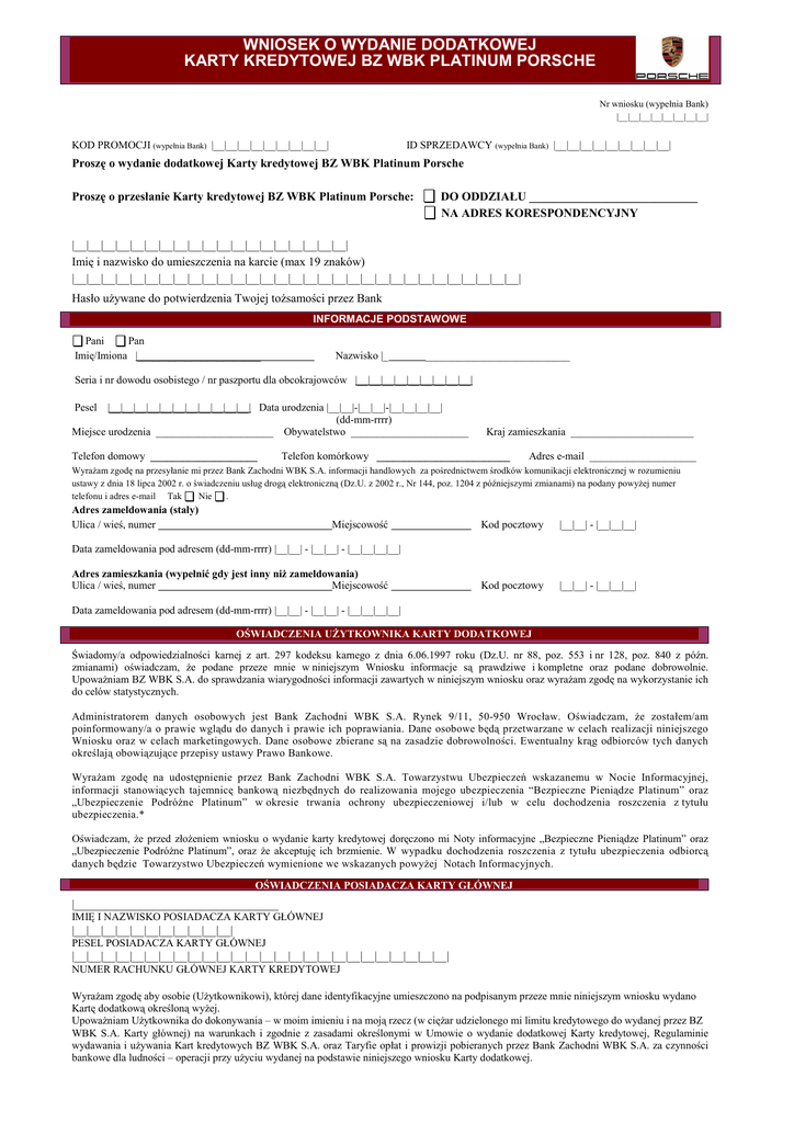 WNIOSEK O WYDANIE DODATKOWEJ KARTY KREDYTOWEJ BZ WBK PLATINUM PORSCHE Nr wniosku (wypełnia Bank) |__|__|__|__|__|__|__|__| KOD PROMOCJI (wypełnia Bank) |__|__|__|__|__|__|__|__|__| ID SPRZEDAWCY (wypełnia Bank) |__|__|__|__|__|__|__|__|__| Proszę o wydanie dodatkowej Karty kredytowej BZ WBK Platinum Porsche Proszę o przesłanie Karty kredytowej BZ WBK Platinum Porsche: DO ODDZIAŁU ____________________________ NA ADRES KORESPONDENCYJNY |__|__|__|__|__|__|__|__|__|__|__|__|__|__|__|__|__|__|__| Imię i nazwisko do umieszczenia na karcie (max 19 znaków) |__|__|__|__|__|__|__|__|__|__|__|__|__|__|__|__|__|__|__|__|__|__|__|__|__|__|__|__|__|__|__| Hasło uŜywane do potwierdzenia Twojej toŜsamości przez Bank INFORMACJE PODSTAWOWE Pani Pan Imię/Imiona |_______________________ Nazwisko |_ ___________________________ Seria i nr dowodu osobistego / nr paszportu dla obcokrajowców |__|__|__|__|__|__|__|__|__| Pesel |__|__|__|__|__|__|__|__|__|__|__| Data urodzenia |__|__|-|__|__|-|__|__|__|__| (dd-mm-rrrr) Miejsce urodzenia ______________________ Obywatelstwo ______________________ Telefon domowy ____________________ Kraj zamieszkania _______________________ Telefon komórkowy _________________________ Adres e-mail ____________________ WyraŜam zgodę na przesyłanie mi przez Bank Zachodni WBK S.A. informacji handlowych za pośrednictwem środków komunikacji elektronicznej w rozumieniu ustawy z dnia 18 lipca 2002 r. o świadczeniu usług drogą elektroniczną (Dz.U. z 2002 r., Nr 144, poz. 1204 z późniejszymi zmianami) na podany powyŜej numer telefonu i adres e-mail Tak Nie . Adres zameldowania (stały) Ulica / wieś, numer Miejscowość Kod pocztowy |__|__| - |__|__|__| Kod pocztowy |__|__| - |__|__|__| Data zameldowania pod adresem (dd-mm-rrrr) |__|__| - |__|__| - |__|__|__|__| Adres zamieszkania (wypełnić gdy jest inny niŜ zameldowania) Ulica / wieś, numer Miejscowość Data zameldowania pod adresem (dd-mm-rrrr) |__|__| - |__|__| - |__|__|__|__| OŚWIADCZENIA UśYTKOWNIKA KARTY DODATKOWEJ Świadomy/a odpowiedzialności karnej z art. 297 kodeksu karnego z dnia 6.06.1997 roku (Dz.U. nr 88, poz. 553 i nr 128, poz. 840 z późn. zmianami) oświadczam, Ŝe podane przeze mnie w niniejszym Wniosku informacje są prawdziwe i kompletne oraz podane dobrowolnie. UpowaŜniam BZ WBK S.A. do sprawdzania wiarygodności informacji zawartych w niniejszym wniosku oraz wyraŜam zgodę na wykorzystanie ich do celów statystycznych. Administratorem danych osobowych jest Bank Zachodni WBK S.A. Rynek 9/11, 50-950 Wrocław. Oświadczam, Ŝe zostałem/am poinformowany/a o prawie wglądu do danych i prawie ich poprawiania. Dane osobowe będą przetwarzane w celach realizacji niniejszego Wniosku oraz w celach marketingowych. Dane osobowe zbierane są na zasadzie dobrowolności. Ewentualny krąg odbiorców tych danych określają obowiązujące przepisy ustawy Prawo Bankowe. WyraŜam zgodę na udostępnienie przez Bank Zachodni WBK S.A. Towarzystwu Ubezpieczeń wskazanemu w Nocie Informacyjnej, informacji stanowiących tajemnicę bankową niezbędnych do realizowania mojego ubezpieczenia “Bezpieczne Pieniądze Platinum” oraz „Ubezpieczenie PodróŜne Platinum” w okresie trwania ochrony ubezpieczeniowej i/lub w celu dochodzenia roszczenia z tytułu ubezpieczenia.* Oświadczam, Ŝe przed złoŜeniem wniosku o wydanie karty kredytowej doręczono mi Noty informacyjne „Bezpieczne Pieniądze Platinum” oraz „Ubezpieczenie PodróŜne Platinum”, oraz Ŝe akceptuję ich brzmienie. W wypadku dochodzenia roszczenia z tytułu ubezpieczenia odbiorcą danych będzie Towarzystwo Ubezpieczeń wymienione we wskazanych powyŜej Notach Informacyjnych. OŚWIADCZENIA POSIADACZA KARTY GŁÓWNEJ |__________________________________ IMIĘ I NAZWISKO POSIADACZA KARTY GŁÓWNEJ |__|__|__|__|__|__|__|__|__|__|__| PESEL POSIADACZA KARTY GŁÓWNEJ |__|__|__|__|__|__|__|__|__|__|__|__|__|__|__|__|__|__|__|__|__|__|__|__|__|__| NUMER RACHUNKU GŁÓWNEJ KARTY KREDYTOWEJ WyraŜam zgodę aby osobie (UŜytkownikowi), której dane identyfikacyjne umieszczono na podpisanym przeze mnie niniejszym wniosku wydano Kartę dodatkową określoną wyŜej. UpowaŜniam UŜytkownika do dokonywania – w moim imieniu i na moją rzecz (w cięŜar udzielonego mi limitu kredytowego do wydanej przez BZ WBK S.A. Karty głównej) na warunkach i zgodnie z zasadami określonymi w Umowie o wydanie dodatkowej Karty kredytowej, Regulaminie wydawania i uŜywania Kart kredytowych BZ WBK S.A. oraz Taryfie opłat i prowizji pobieranych przez Bank Zachodni WBK S.A. za czynności bankowe dla ludności – operacji przy uŜyciu wydanej na podstawie niniejszego wniosku Karty dodatkowej. UpowaŜnienie moŜe być cofnięte w kaŜdej chwili. Jednocześnie zrzekam się uprawnień do jego cofnięcia do momentu zwrotu Bankowi Karty dodatkowej lub jej zastrzeŜenia. Udzielone upowaŜnienie wygasa z chwilą mojej śmierci lub śmierci UŜytkownika. Odstąpienie od Umowy o udzielenie kredytu i wydanie płatniczej Karty kredytowej jest skuteczne wobec UpowaŜnienia. Wypowiedzenie bądź wygaśnięcie Umowy o udzielenie kredytu i wydanie płatniczej Karty kredytowej lub Umowy o wydanie dodatkowej Karty kredytowej lub jej zastrzeŜenie jest równoznaczne z cofnięciem bądź stosownie wygaśnięciem UpowaŜnienia. WyraŜam zgodę na objęcie UŜytkownika dodatkowej Karty kredytowej ubezpieczeniem „Bezpieczne Pieniądze Platinum”. Jako Posiadacz wyraŜam zgodę, aby UŜytkownik otrzymywał co miesiąc Zestawienie operacji obejmujące transakcje dokonane tylko jego Kartą. Tak Nie |_____________________________________ MIEJSCOWOŚĆ |__|__| - |__|__| - |__|__|__|__| DATA (DZIEŃ-MIESIĄC-ROK) |______________________________________ |________________________________ PODPIS UśYTKOWNIKA KARTY DODATKOWEJ PODPIS POSIADACZA KARTY GŁOWNEJ