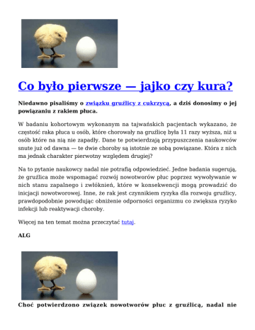 Co było pierwsze — jajko czy kura? Niedawno pisaliśmy o związku gruźlicy z cukrzycą, a dziś donosimy o jej powiązaniu z rakiem płuca. W badaniu kohortowym wykonanym na tajwańskich pacjentach wykazano, że częstość raka płuca u osób, które chorowały na gruźlicę była 11 razy wyższa, niż u osób które na nią nie zapadły. Dane te potwierdzają przypuszczenia naukowców snute już od dawna — te dwie choroby są istotnie ze sobą powiązane. Która z nich ma jednak charakter pierwotny względem drugiej? Na to pytanie naukowcy nadal nie potrafią odpowiedzieć. Jedne badania sugerują, że gruźlica może wspomagać rozwój nowotworów płuc poprzez wywoływanie w nich stanu zapalnego i zwłóknień, które w konsekwencji mogą prowadzić do inicjacji nowotworowej. Inne, że rak jest czynnikiem ryzyka dla rozwoju gruźlicy, prawdopodobnie powodując obniżenie odporności organizmu co zwiększa ryzyko infekcji lub reaktywacji choroby. Więcej na ten temat można przeczytać tutaj. ALG Choć potwierdzono związek nowotworów płuc z gruźlicą, nadal nie wiadomo która z chorób jest przyczyną, a która skutkiem WHO potwierdza — używanie komórek może powodować raka Użytkowanie telefonów komórkowych może wywoływać nowotwory mózgu — ogłosili w oficjalnie wydanym oświadczeniu eksperci Światowej Organizacji Zdrowia (WHO). Użytkownicy komórek są najbardziej narażeni na wystąpienie glejaków — złośliwych nowotworów mózgu (glioma). Eksperci WHO zachęcają do ograniczenia używania telefonów komórkowych. Eksperci IARC (Międzynarodowej Agencji Badań nad Rakiem) wydali bardzo stanowcze oświadczenie podczas majowego zebrania grupy ekspertów WHO w Lyonie. Ich zdaniem, wyniki prowadzonych ostatnio badań naukowych bezsprzecznie dowodzą, że wykorzystywane w urządzeniach łączności bezprzewodowej, czyli przede wszystkim w telefonach komórkowych, promieniowanie elektromagnetyczne (o częstotliwości fal radiowych) zwiększa ryzyko zachorowania na glejaki mózgu. WHO ryzyko używania komórek zakwalifikowała do typu B2, uznając je za równie kancerogenne jak opary ołowiu, spaliny samochodowe w dużym stężeniu czy pestycydy. Komunikat został wydany po dokładnej analizie dostępnych publikacji naukowych na ten temat, zwraca uwagę nie tylko na aparaty komórkowe, ale i inne instalacje łączności bezprzewodowej, powszechnie występujące w naszym otoczeniu. Według WHO konieczne są także dalsze badania, które wyjaśnią mechanizmy odpowiadające za szkodliwe działanie promieniowania komórek. Badania te są obecnie niełatwe do przeprowadzenia, ponieważ zachorowania pojawiają się prawdopodobnie dopiero po wielu latach. Jednak WHO w wydanym oświadczeniu apeluje o zredukowanie częstotliwości używania telefonów komórkowych przez ich użytkowników. Oświadczenie WHO można przeczytać tutaj. Choć potwierdzono związek nowotworów płuc z gruźlicą, nadal nie wiadomo która z chorób jest przyczyną, a która skutkiem Nowa metoda detekcji komórek nowotworowych we krwi W maju 2011 roku badacze z Instytutu Akustyki w Madrycie zaprezentowali na konferencji „Mikrotechnologie w Biologii i Medycynie” w Szwajcarii przełomową technikę wykrywania komórek nowotworowych we krwi pacjentów chorych na raka. Odnalezienie komórek nowotworowych we krwi chorych wskazuje na to, że guz pierwotny rozpoczął przerzutowanie. Taka informacja jest bardzo cenna dla lekarzy i dla samych pacjentów; służy do monitorowania przebiegu choroby, a nawet decyduje o modyfikacji terapii czy zastosowaniu konkretnego algorytmu terapeutycznego. Opracowanie taniej, szybkiej i — co najważniejsze — pewnej metody detekcji przerzutujących komórek we krwi stanowi od wielu lat wyzwanie dla badaczy i klinicystów. Autorem nowatorskiego odkrycia jest Itziar González z Instytutu Akustyki w Madrycie, który wraz z kolegami opracował alternatywną do obecnych, skomplikowanych metod detekcji, metodę wykrycia komórek nowotworowych we krwi: małą plastikową komorę z możliwością wzbudzania wibracji, przez którą przepływają próbki krwi. W komorze wzbudzane są drgania cieczy — wywoływana w ten sposób fala stojąca zaczyna sortować komórki zawarte w cieczy, w zależności od ich wielkości. Oczywiście komórki nowotworowe, jako większe, zbierają się w innym rejonie urządzenia niż komórki różniace się od nich wielkością. Prototyp cały czas jest modyfikowany — badacze pracują nad jeszcze szybszą i czulszą wersją urządzenia. Autorzy odkrycia są przekonani, że docelowo urządzenie będzie w stanie wykryć nawet 2 komórki nowotworowe w 7 ml krwi obwodowej. Choć potwierdzono związek nowotworów płuc z gruźlicą, nadal nie wiadomo która z chorób jest przyczyną, a która skutkiem Gruźlica w parze z cukrzycą Diabetycy są narażeni na pięciokrotnie większe ryzyko zachorowania na gruźlicę niż osoby niechorujące na cukrzycę. Podstawy do takiego wniosku dają wyniki badań przeprowadzonych niedawno przez zespół naukowców z University of Texas Health Science Center w Houston. W badaniu wzięło udział 61 pacjentów z południa Teksasu oraz 172 pacjentów z północno-wschodniego Meksyku. Uzyskane rezultaty wskazują na to, że 25% przypadków wystąpienia gruźlicy wykazywało związek z cukrzycą, a około 6% przypadków z HIV. Znaczenie wpływu cukrzycy na rozwój gruźlicy było zróżnicowane, zarówno pod względem regionalnym, jak i zależnie od badanej grupy etnicznej. Najbardziej zauważalna korelacja wystąpiła u Latynosów oraz dwóch głównych populacji o zwiększonym ryzyku wystąpienia obu chorób: Afroamerykanów i Indian [1]. Ujawniony związek przyczynowo-skutkowy sugeruje, że u pacjentów z gruźlicą powinno zostać przeprowadzone badanie w kierunku cukrzycy i vice versa. Społeczeństwa wielu krajów mogłyby z pewnością skorzystać na zintegrowaniu programów profilaktyki i kontroli za