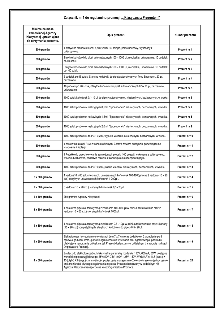 Załącznik nr 1 do regulaminu promocji „„Klasyczna z Prezentem” Minimalna masa zamawianej Agarozy Klasycznej uprawniająca do otrzymania prezentu. Opis prezentu Numer prezentu 500 gramów 1 statyw na probówki 0,5ml; 1,5ml; 2,0ml. 60 miejsc, pomarańczowy, wykonany z polipropylenu. Prezent nr 1 500 gramów Sterylne końcówki do pipet automatycznych 100 - 1000 µl, niebieskie, uniwersalne, 10 pudełek po 60 sztuk. Prezent nr 2 500 gramów Sterylne końcówki do pipet automatycznych 100 - 1000 µl, niebieskie, uinwersalne. 10 pudełek po 100 sztuk. Prezent nr 3 500 gramów 5 pudełek po 96 sztuk, Sterylne końcówki do pipet automatycznych firmy Eppendorf, 20 µl, bezbarwne. Prezent nr 4 500 gramów 10 pudełek po 96 sztuk, Sterylne końcówki do pipet automatycznych 0,5 - 20 µl, bezbarwne, uniwersalne. Prezent nr 5 500 gramów 1000 sztuk końcówek 0,1-10 µl do pipety automatycznej, niesterylnych, bezbarwnych, w worku. Prezent nr 6 500 gramów 1000 sztuk probówek reakcyjnych 0,5ml, "Eppendorfek", niesterylnych, bezbarwnych, w worku. Prezent nr 7 500 gramów 1000 sztuk probówek reakcyjnych 1,5ml, "Eppendorfek", niesterylnych, bezbarwnych, w worku. Prezent nr 8 500 gramów 1000 sztuk probówek reakcyjnych 2,0ml; "Eppendorfek", niesterylnych, bezbarwnych, w worku. Prezent nr 9 500 gramów 1000 sztuk probówek do PCR 0,2ml, wypukłe wieczko, niesterylnych, bezbarwnych, w worku. Prezent nr 10 500 gramów 1 zestaw do izolacji RNA z tkanek roślinnych. Zestwa zawiera odczynniki pozwalające na wykonanie 4 izolacji. Prezent nr 11 500 gramów 1 Pudełko do przechowywania zamrożonych próbek, 100 pozycji, wykonane z polipropylenu, wieczko bezbarwne, podstawa różowa, z zamknięciem zabezpieczającym. Prezent nr 12 500 gramów 1000 sztuk probówek do PCR 0,2ml, płaskie wieczko, niesterylnych, bezbarwnych, w worku. Prezent nr 13 2 x 500 gramów 1 karton (10 x 60 szt.) sterylnych, uniwersalnych końcówek 100-1000µl oraz 2 kartony (10 x 96 szt.) sterylnych uniwersalnych końcówek 1-200µl . Prezent nr 14 2 x 500 gramów 3 kartony (10 x 96 szt.) sterylnych końcówek 0,5 - 20µl. Prezent nr 15 2 x 500 gramów 250 gramów Agarozy Klasycznej. Prezent nr 16 3 x 500 gramów 1 nastawna pipeta automatyczną z zakresem 100-1000µl w pełni autoklawowalna oraz 2 kartony (10 x 60 szt.) sterylnych końcówek 1000µl. Prezent nr 17 4 x 500 gramów 1 nastawna pipeta automatyczną z zakresem 0,5 - 10µl w pełni autoklawowalna oraz 4 kartony (10 x 96 szt.) kompatybilnych, sterylnych końcówek do pipety 0,5 - 20µl. Prezent nr 18 4 x 500 gramów Elektroforezer horyzontalny o wymiarach żelu 7 x 7 cm oraz dodatkowo: 2 grzebienie po 8 zębów o grubości 1mm, gumowe ograniczniki do wylewania żelu agarozowego, podkładki ułatwiające nanoszenie próbek na żel. Prezent dostarczany w oddzielnym transporcie na koszt Organizatora Promocji. Prezent nr 19 4 x 500 gramów Zasilacz do elektroforezerów. Maksymalne parametry rozdziału: 150V, 600mA, 60W, dostępne wartości napięcia wyjściowego: 25V; 50V; 75V; 100V; 125V, 150V, WYMIARY: 11.5 (szer.) X 15 (głęb.) X 8 (wys.) cm, możliwość podłączenia maksymalnie 2 elektroforezerów jednocześnie, brak możliwości płynnego regulowania napięcia. Prezent dostarczany w oddzielnym niż Agaroza Klasyczna transporcie na koszt Organizatora Promocji. Prezent nr 20