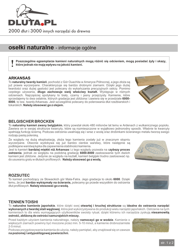 2000 d³ut i 3000 innych narzêdzi do drewna ose³ki naturalne - informacje ogólne Poszczególne egzemplarze kamieni naturalnych mog¹ ró¿niæ siê odcieniem, mog¹ posiadaæ ¿y³y i skazy, które jednak nie maj¹ wp³ywu na jakoœæ kamieni. ARKANSAS To naturalny twardy kamieñ, pochodzi z Gór Ouachita w Ameryce Pó³nocnej, a jego z³o¿a s¹ ju¿ prawie wyczerpane. Charakteryzuje siê bardzo drobnymi ziarnami. Dziêki jego du¿ej twardoœci oraz du¿ej gêstoœci jest polecany do wykañczania precyzyjnych ostrzy. Pomimo czêstego u¿ywania, d³ugo zachowuje swój w³aœciwy kszta³t. Wystêpuje w ró¿nych odcieniach. Najczêœciej spotykany to bia³y, czarny i jasny przejrzysty. Kamienie, które sprzedajemy to dwa ostatnie, których gradacja jest zbli¿ona i zawiera siê w przedziale 60008000, to tzw. twardy Arkansas. Jest szczególnie polecany do polerowania d³ut rzeŸbiarskich i tokarskich. Nale¿y stosowaæ go z olejem. BELGISCHER BROCKEN To naturalny kamieñ zwany belgijskim, który powsta³ oko³o 480 milionów lat temu w Ardenach z wulkanicznego popio³u. Zawiera on w swojej strukturze kwarcyty, które s¹ rozmieszczone w wyj¹tkowo jednorodny sposób. W³aœnie te kwarcyty spe³niaj¹ funkcjê œciern¹. Podczas ostrzenia uwalniaj¹ siê i wraz z wod¹ oraz drobinkami œcieranego metalu tworz¹ swego rodzaju pastê polersk¹. Ze wzglêdu na du¿¹ eksploatacjê, z³o¿a tego kamienia zosta³y ju¿ w znacznym stopniu wyczerpane. Obecnie wydobywa siê ju¿ bardzo cienkie warstwy, które nastêpnie s¹ podklejane warstw¹ ³upka dla zapewnienia stabilnoœci kamienia. Jest to kamieñ bardziej miêkki ni¿ Arkansas i z tego wzglêdu pozwala na szybszy proces ostrzenia, jednak ze wzglêdu na podobn¹ gradacjê 6000-8000 zastosowanie tych dwóch kamieni jest zbli¿one. Jedynie ze wzglêdu na kszta³t, kamieñ belgijski trudno zastosowaæ np. do usuwaniu gratu w d³utach profilowych. Nale¿y stosowaæ go z wod¹. ROZSUTEC To kamieñ pochodz¹cy ze S³owackich gór Mala-Fatra. Jego gradacja to oko³o 6000. Dziêki temu, ¿e jest bardzo wytrzyma³y na œcieranie, polecamy go przede wszystkim do ostrzenia d³ut profilowych. Nale¿y stosowaæ go z wod¹. TENNEN TOISHI To naturalne kamienie japoñskie, które dziêki swej otwartej i kruchej strukturze s¹ idealne do ostrzenia narzêdzi wykonanych z twardej stali wêglowej, która jest wykorzystywana do produkcji wielu narzêdzi japoñskich. Ostrzenie na tych kamieniach to dla wielu wymagaj¹cych u¿ytkowników swoisty rytua³, dziêki któremu ich narzêdzia zyskuj¹ niesamowit¹ ostroœæ, zbli¿on¹ do ostroœci samurajskich mieczy. Przed ka¿dym u¿yciem kamienia naturalnego, nale¿y namoczyæ go w wodzie. Kamienie o wiêkszych ziarnach powinny byæ moczone przez min. 5-10 minut, a kamienie drobnoziarniste 2-5 minut. Podczas przygotowywania kamienia do u¿ycia, nale¿y pamiêtaæ, aby znajdowa³ siê on zawsze na poziomej i antypoœlizgowej powierzchni. str. 1 z 2 2000 d³ut i 3000 innych narzêdzi do drewna ose³ki sztuczne - informacje ogólne TOISHI To japoñskie kamienie syntetyczne. Ze wzglêdu na doskona³¹ jakoœæ, efektywnoœæ, ³atwoœæ u¿ywania oraz przystêpn¹ cenê polecamy te kamienie do ostrzenia zarówno narzêdzi japoñskich, jak i europejskich. Struktura tych kamieni, o bardziej otwartych porach ni¿ w przypadku kamieni typu Arkansas czy Belgijski, pozwala na znacznie szybsze ostrzenie. Zu¿yty kamieñ, o nierównej powierzchni, mo¿na zregenerowaæ np. na mokrym papierze œciernym przyklejonym do szklanej powierzchni lub za pomoc¹ kamienia 710990. Kamienie przed u¿yciem nale¿y moczyæ w wodzie przez 5-10 minut, w zale¿noœci od gradacji (im bardziej mia³ki kamieñ, tym krócej go moczymy). Mo¿na tak¿e przechowywaæ je w pojemniku wype³nionym wod¹, wtedy bêd¹ zawsze gotowe do u¿ycia. OSE£KI DIAMENTOWE Ose³ki diamentowe mog¹ byæ u¿ywane do ostrzenia wszystkich rodzajów narzêdzi rêcznych. Ostrzenie za pomoc¹ diamentu jest wyj¹tkowo szybkie, nawet w przypadku bardzo twardej stali. Ose³ek mo¿na u¿ywaæ nawet do ostrzy HSS i z wêglików spiekanych. Na ose³kach diamentowych ostrzymy na sucho (np. ose³ki sto¿kowe) lub z u¿yciem niewielkiej iloœci wody (np. du¿e bloki). str. 2 z 2