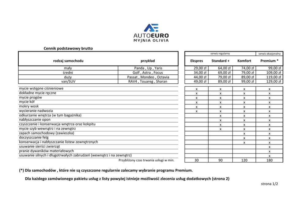 Cennik podstawowy brutto (*) Dla samochodów , które