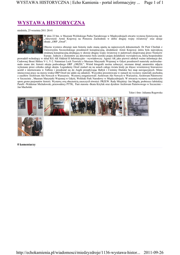 WYSTAWA HISTORYCZNA | Echo Kamienia - portal informacyjny ... Page 1 of 1 WYSTAWA HISTORYCZNA niedziela, 25 września 2011 20:41 W dniu 22 bm. w Muzeum Wolińskiego Parku Narodowego w Międzyzdrojach otwarto wystawę historyczną zat. ,,Aktywność Armii Krajowej na Pomorzu Zachodnim w dobie drugiej wojny światowej” oraz dzieje okrętu ,,ORP ,,Orzeł”. Obecna wystawa obrazuje nam historię mało znaną opartą na najnowszych dokumentach. Dr Piotr Chrobak z Uniwersytetu Szczecińskiego przedstawił konspiracyjną, działalność Armii Krajowej ,która była największą strukturą konspiracyjną działającą w okresie drugiej wojny światowej w państwach okupowanej przez Niemców Europy. Jednym z elementów jej aktywności była szeroko pojęta działalność wywiadowcza, którą bezpośrednio prowadził wchodzący w skład KG AK Oddział II Informacyjno - wywiadowczy. Agenci AK jako pierwsi zdobyli waŜne informacje dot. Cudownej Broni Hitlera V-1, V-2. Natomiast Lech Trawicki z Muzeum Marynarki Wojennej w Gdyni przedstawił materiały archiwalnemało znane dot. historii okrętu podwodnego ORP ,,ORZEŁ”. Wśród fotografii moŜna zobaczyć, nieznane dotąd, amatorskie zdjęcia wykonane przez członka załogi okrętu. Legendarny Orzeł znalazł się na ustach całego świata kiedy po klęsce wrześniowej brawurowo uciekł z internowania w Tallinie i przedostał się do Anglii przepływając Bałtyk i Cieśniny Duńskie bez map nawigacyjnych. Mimo intensywnej pracy na morzu wraku ORP Orzeł nie udało się odnaleźć. Wszystkie prezentowane w ramach tej wystawy materiały pochodzą z zasobów Archiwum Akt Nowych w Warszawie. Wystawę zorganizowali: Archiwum Akt Nowych w Warszawie, Archiwum Państwowe w Szczecinie , Muzeum Marynarki Wojennej w Gdyni, Woliński Park Narodowy w Międzyzdrojach. W otwarciu wystawy uczestniczyło spore grono pasjonatów historii. Wystawę swą obecnością zaszczycił równieŜ: PRZEW. Rady Miejskiej- Jan Magda, proboszcz lubińskiej Parafii -Waldemar Michałowski, przewodnicy PTTK, Pani starosta -Beata Kiryluk oraz dyrektor Archiwum Państwowego w Szczecinie Jan Macholak. Tekst i foto- Julianna Rogowska 0 komentarzy http://echokamienia.pl/wiadomosci/miedzyzdroje/1136-wystawa-histor... 2011-09-26