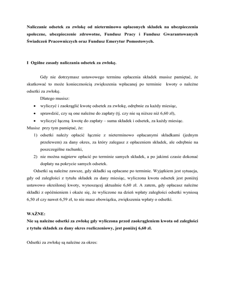 Naliczanie odsetek za zwłokę od nieterminowo opłaconych składek na ubezpieczenia społeczne, ubezpieczenie zdrowotne, Fundusz Pracy i Fundusz Gwarantowanych Świadczeń Pracowniczych oraz Fundusz Emerytur Pomostowych. I Ogólne zasady naliczania odsetek za zwłokę. Gdy nie dotrzymasz ustawowego terminu opłacenia składek musisz pamiętać, że skutkować to może koniecznością zwiększenia wpłacanej po terminie kwoty o należne odsetki za zwłokę. Dlatego musisz: wyliczyć i zaokrąglić kwotę odsetek za zwłokę, odrębnie za każdy miesiąc, sprawdzić, czy są one należne do zapłaty (tj. czy nie są niższe niż 6,60 zł), wyliczyć łączną kwotę do zapłaty – suma składek i odsetek, za każdy miesiąc. Musisz przy tym pamiętać, że: 1) odsetki należy opłacić łącznie z nieterminowo opłacanymi składkami (jednym przelewem) za dany okres, za który zalegasz z opłaceniem składek, ale odrębnie na poszczególne rachunki, 2) nie można najpierw opłacić po terminie samych składek, a po jakimś czasie dokonać dopłaty na pokrycie samych odsetek. Odsetki są należne zawsze, gdy składki są opłacane po terminie. Wyjątkiem jest sytuacja, gdy od zaległości z tytułu składek za dany miesiąc, wyliczona kwota odsetek jest poniżej ustawowo określonej kwoty, wynoszącej aktualnie 6,60 zł. A zatem, gdy opłacasz należne składki z opóźnieniem i okaże się, że wyliczone na dzień wpłaty zaległości odsetki wyniosą 6,50 zł czy nawet 6,59 zł, to nie masz obowiązku, zwiększenia wpłaty o odsetki. WAŻNE: Nie są należne odsetki za zwłokę gdy wyliczona przed zaokrągleniem kwota od zaległości z tytułu składek za dany okres rozliczeniowy, jest poniżej 6,60 zł. Odsetki za zwłokę są należne za okres: od dnia następnego po dniu terminu płatności składek (w sytuacji, gdy termin płatności przypada na dzień wolny od pracy (sobota, niedziela, święta) terminem płatności jest pierwszy dzień przypadający po tym dniu (dniach), PRZYKŁAD: Ustawowy termin płatności składek za wrzesień 2015r. przypadał na 10.10.2015r. (sobota), faktyczny termin płatności przypadał więc na 12.10.2015r. Zatem odsetki od opłaconych po terminie składek za wrzesień 2015r. należne są za okres od 13.10.2015r. do dnia zapłaty należności włącznie, przy czym za dzień zapłaty, uważa się dzień obciążenia rachunku bankowego płatnika, a nie dzień złożenia do Banku Pocztowego na Poczcie dyspozycji zapłaty składek. II Możliwość zastosowania obniżonej stawki odsetek za zwłokę w wysokości 50% lub 75% obowiązującej stawki. Od 1 lipca 2016 r. obowiązują dwie stawki obniżonych odsetek za zwłokę: stawka odsetek obniżonych wynosi 50% stawki podstawowej dla należności z tytułu składek za okres rozliczeniowy od 12/2015 (począwszy), gdy: 1) skuteczna1 korekta deklaracji jest złożona nie później niż w terminie 6 miesięcy od dnia upływu ustawowego terminu do złożenia deklaracji za okres, za który jest składana korekta, 2) opłacenie należności wynikających ze złożenia skutecznie prawnej deklaracji nastąpiło w ciągu 7 dni od dnia złożenia tej korekty deklaracji. stawka odsetek obniżonych wynosi 75% stawki podstawowej dla należności z tytułu składek za okresy rozliczeniowe do 11/2015 (włącznie), gdy: 1) została złożona skuteczna¹ korekta deklaracji rozliczeniowej, 2) opłacenie należności wynikających ze złożenia skutecznie prawnej deklaracji nastąpiło w ciągu 7 dni od dnia złożenia tej korekty deklaracji, ale bez konieczności składania uzasadnienia. 1 Prawnie skuteczna korekta deklaracji rozliczeniowej to korekta spełniająca wymogi prawa (m. in. dotyczy to zgodności kwotowej deklaracji z sumą kwot składek z imiennych raportów). Należy podkreślić, że w obu sytuacjach możesz skorzystać z uprawnienia do opłacenia odsetek za zwłokę w obniżonej wysokości, gdy opłacana zaległość wynika ze złożonej prawnie skutecznej korekty deklaracji rozliczeniowej, jest sporządzona z twojej własnej inicjatywy (a nie jest efektem zawiadomienia terenowej jednostki organizacyjnej ZUS lub wynikiem przeprowadzonej przez inspektorów ZUS kontroli) oraz najpóźniej w ciągu 7 dni od dnia złożenia korekty, zapłacisz zaległość w kwocie pokrywającej różnice składek wynikające ze składanej korekty wraz z należnymi (obliczonymi według obniżonej stawki) odsetkami. WAŻNE: Zastosowanie obniżonej stawki odsetek jest możliwe gdy z własnej inicjatywy złożysz prawnie skuteczne jedynie w przypadku, korekty dokumentów rozliczeniowych oraz opłacisz w całości należne składki z odsetkami, w ciągu 7 dni od dnia złożenia korekty. III Szczegółowe zasady obliczania oraz zaokrąglania odsetek za zwłokę. Aby wyliczyć kwotę odsetek za zwłokę, oprócz kwoty zaległości musisz ustalić: liczbę dni zwłoki w opłacaniu składek, którą liczymy od następnego dnia po terminie płatności do dnia, w którym dokonana zostanie wpłata zaległości, obowiązującą za poszczególne okresy zwłoki (od do) stopę procentową odsetek. UWAGA: Stopa procentowa odsetek ulega zmianom. Gdy za okres zwłoki obowiązuje więcej niż jedna stopa procentowa, wówczas odsetki należy obliczać odrębnie za okresy, w których obowiązywała w danej wysokości. Następnie wyliczone odrębnie kwoty odsetek za poszczególne okresy należy zsumować. Wyliczona kwota odsetek podlega zaokrągleniu do pełnych złotych, według zasady matematycznej, co oznacza, że końcówka wyliczonej kwoty poniżej 50 groszy jest pomijana, natomiast końcówka wyliczonej kwoty równa lub wyższa od 50 groszy podlega zaokrągleniu w górę do pełnej złotówki. WAŻNE: Wyjątek od tej zasady dotyczy kwoty odsetek, które nie są pobierane, tj. kwoty 6,60 zł, bowiem zaokrągleniu do pełnej złotówki w górę podlega dopiero kwota odsetek od 6,61zł (podlega ona zaokrągleniu do 7 zł). Dlatego wyliczoną kwotę odset