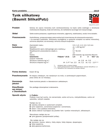 Karta produktu 1615 Tynk silikatowy (Baumit SilikatPutz) baumit.com Produkt Gotowy do u¿ycia mineralny tynk cienkowarstwowy na bazie szk³a wodnego o strukturze rowkowej lub drapanej, bia³y lub kolorowy, do nak³adania rêcznego lub maszynowego. Sk³ad Szk³o wodne potasowe, wype³niacze mineralne, pigmenty, stabilizatory, woda i inne dodatki. Przeznaczenie Hydrofobowy, przepuszczaj¹cy parê wodn¹ tynk krzemianowy do stosowania wewn¹tr z i na zewn¹trz budynków, stosowany szczególnie w systemie ociepleñ na we³nie mineralnej, ochronie zabytków, do renowacji, remontu starych budynków. Dane techniczne 0,5; 1,0; 1,5; 2,0; 3,0 mm Ziarnistoœæ maks.: ok. 1,90 kg/dm3 Gêstoœæ: 37 Wspó³czynnik oporu dyfuzyjnego par y wodnej m: 0,7 W/mK Wspó³czynnik przewodzenia ciep³a l: 12 pH: 200 kolorów wg wzornika Baumit Kolory: Füllputz* (0,5) 1,5 2 3 fein* (1) Uziarnienie: Zu¿ycie materia³u ok. 2,8 ok. 3,9 Struktura rowkowa kg/m 2: ok. 1,4** ok. 2,5 ok. 3,2 ok. 4,2 2,0*** Struktura drapana kg/m 2: *) dostêpne tylko w kolorze bia³ym **) przed zastosowaniem tynku SilikatFüllputz nanieœæ SilikatPutz 1,5 ***) SilikatPutz Fein stosowaæ do obróbki oœcie¿y Forma dostawy Kube³ 30 kg Przechowywanie W miejscu ch³odnym, nie nara¿onym na mróz, w zamkniêtych pojemnikach, przez okres do 12 miesiêcy. Gwarancja jakoœci Sta³a kontrola jakoœci w laboratorium zak³adowym. Klasyfikacja wg ustawy o chemikaliach Nie podlega obowi¹zkowi znakowania. Sposób u¿ycia 1. Pod³o¿e: Pod³o¿e musi byæ suche, nie zamarzniête, wolne od kurzu, niehydrofobowe, wolne od wykwitów, luŸnych cz¹stek. Nadaje siê na: - warstwy zbrojone w systemach ociepleñ, - tynki wapienne, cementowo-wapienne i cementowe, - beton i inne pod³o¿a mineralne, - (stare) dobrze tr zymaj¹ce siê pow³oki farb i tynków mineralnych, silikatowych. Warunkowo nadaje siê na: - tynki gipsowe (przeprowadziæ próbê). Nie nadaje siê na: - tworzywa i ¿ywice, lakier y, farby olejne, farby klejowe, dyspersyjne, - farby wapienne, - p³yty gipsowo-kartonowe. 2. Wskazówki dotycz¹ce przygotowania pod³o¿a: - powierzchnie osypuj¹ce siê nale¿y oczyœciæ mechanicznie; - pozosta³oœci oleju szalunkowego na betonie usuwaæ strumieniem gor¹cej par y wodnej; - powierzchnie zanieczyszczone i/lub pokr yte algami: oczyœciæ mechanicznie, strumieniem gor¹cej pary wodnej lub pr zy u¿yciu œrodków do usuwania alg; - stare zwietrza³e farby mineralne oczyœciæ mechanicznie; - wykwity oczyœciæ mechanicznie; - uszkodzone, spêkane powierzchnie naprawiæ pr zy u¿yciu odpowiednich szpachlówek; - wszystkie pod³o¿a gruntowaæ podk³adem silikatowym Baumit SilikatGrund (czas schniêcia podk³adu min. 48 godzin). 3. Nak³adanie: Po minimum 48-godz. schniêciu podk³adu silikatowego (Baumit SilikatGrund) nanosi siê tynk silikatowy. Tynk gruntownie zamieszaæ wolnoobrotowym mieszad³em, nie mieszaæ z innymi produktami. Tynk nak³adaæ nierdzewn¹ pac¹ stalow¹ w warstwie równej gruboœci ziarna i zacieraæ. Struktura rowkowa: po krótkim pr zeschniêciu zacieraæ pac¹ z tworzywa sztucznego wykonuj¹c ruchy koliste, poziome lub pionowe. Struktura drapana: bezpoœrednio po zaci¹gniêciu zacieraæ pac¹ plastykow¹ ruchami kolistymi. Pracowaæ równomiernie i bez przer wy. Budowa pow³oki: 1 x podk³ad silikatowy (Baumit SilikatGrund), 1 x tynk silikatowy (Baumit SilikatPutz). Na powierzchniach naprawianych: 2 x podk³ad silikatowy (Baumit SilikatGrund), 4. Wskazówki i uwagi ogólne: Nie stosowaæ w temperaturach poni¿ej +8oC. Przy du¿ym nas³onecznieniu, podczas deszczu lub przy silnym wietr ze odpowiednio os³oniæ elewacjê. Du¿a wilgotnoœæ powietrza i niskie temperatury mog¹ wyraŸnie wyd³u¿yæ czas wi¹zania i zmieniaæ odcieñ bar wy. Czyszczenie narzêdzi - wod¹ natychmiast po u¿yciu. Uwzglêdniæ wspó³czynnik odbicia œwiat³a (HBW) przy u¿yciu w systemach ociepleñ i na tynkach termoizolacyjnych (nie mniej jak 30). Baumit PL 08/03 a&g Œrodki bezpieczeñstwa: Chroniæ oczy i skórê. Os³oniæ otoczenie tynkowanych powierzchni. Ewentualne ubrudzenia usuwaæ z pomoc¹ wody nie czekaj¹c na wyschniêcie. Jednolitoœæ barwy mo¿e byæ gwarantowana tylko w ramach jednego zamówienia. Tynki silikatowe Baumit mog¹ zostaæ na ¿yczenie klienta dodatkowo uodpornione na osadzanie siê grzyba, pleœni i glonów. Nasze zalecenia w zakresie stosowanych technik, przekazywane s³owem i pismem w celu wsparcia nabywcy (u¿ytkownika) w oparciu o nasze doœwiadczenia i aktualny stan wiedzy s¹ niewi¹¿¹ce i nie uzasadniaj¹ prawnego stosunku umownego oraz ¿adnych zobowi¹zañ ubocznych z tytu³u umowy kupna (sprzeda¿y). Nie uwalniaj¹ one nabywcy od sprawdzenia na w³asn¹ odpowiedzialnoœæ przydatnoœci naszych produktów do przewidzianego zastosowania. Poza tym obowi¹zuj¹ nasze "Ogólne warunki umów" znajduj¹ce siê w katalogach produktów. Nasza gêsta sieæ przedstawicielstw gwarantuje szybkie doradztwo i dostawy. Prosimy zasiêgn¹æ informacji u najbli¿szego przedstawiciela regionalnego.