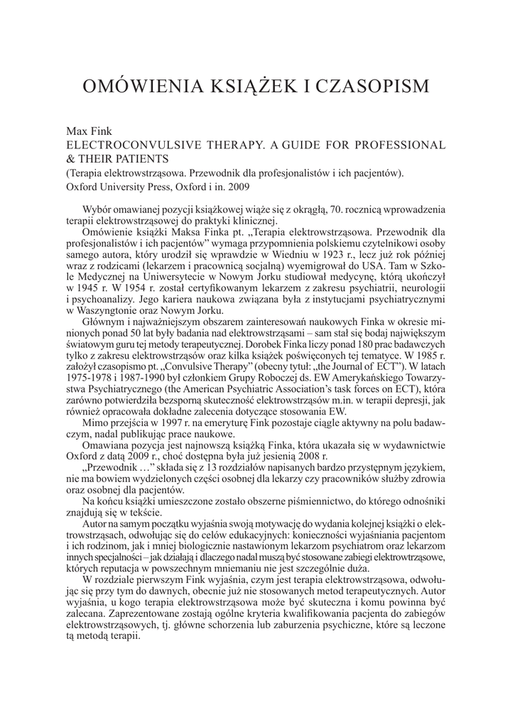 omówienia książek i czasopism Max Fink Electroconvulsive therapy. A guide for professional & their patients (Terapia elektrowstrząsowa. Przewodnik dla profesjonalistów i ich pacjentów). Oxford University Press, Oxford i in. 2009 Wybór omawianej pozycji książkowej wiąże się z okrągłą, 70. rocznicą wprowadzenia terapii elektrowstrząsowej do praktyki klinicznej. Omówienie książki Maksa Finka pt. „Terapia elektrowstrząsowa. Przewodnik dla profesjonalistów i ich pacjentów” wymaga przypomnienia polskiemu czytelnikowi osoby samego autora, który urodził się wprawdzie w Wiedniu w 1923 r., lecz już rok później wraz z rodzicami (lekarzem i pracownicą socjalną) wyemigrował do USA. Tam w Szkole Medycznej na Uniwersytecie w Nowym Jorku studiował medycynę, którą ukończył w 1945 r. W 1954 r. został certyfikowanym lekarzem z zakresu psychiatrii, neurologii i psychoanalizy. Jego kariera naukowa związana była z instytucjami psychiatrycznymi w Waszyngtonie oraz Nowym Jorku. Głównym i najważniejszym obszarem zainteresowań naukowych Finka w okresie minionych ponad 50 lat były badania nad elektrowstrząsami – sam stał się bodaj największym światowym guru tej metody terapeutycznej. Dorobek Finka liczy ponad 180 prac badawczych tylko z zakresu elektrowstrząsów oraz kilka książek poświęconych tej tematyce. W 1985 r. założył czasopismo pt. „Convulsive Therapy” (obecny tytuł: „the Journal of ECT”). W latach 1975-1978 i 1987-1990 był członkiem Grupy Roboczej ds. EW Amerykańskiego Towarzystwa Psychiatrycznego (the American Psychiatric Association’s task forces on ECT), która zarówno potwierdziła bezsporną skuteczność elektrowstrząsów m.in. w terapii depresji, jak również opracowała dokładne zalecenia dotyczące stosowania EW. Mimo przejścia w 1997 r. na emeryturę Fink pozostaje ciągle aktywny na polu badawczym, nadal publikując prace naukowe. Omawiana pozycja jest najnowszą książką Finka, która ukazała się w wydawnictwie Oxford z datą 2009 r., choć dostępna była już jesienią 2008 r. „Przewodnik …” składa się z 13 rozdziałów napisanych bardzo przystępnym językiem, nie ma bowiem wydzielonych części osobnej dla lekarzy czy pracowników służby zdrowia oraz osobnej dla pacjentów. Na końcu książki umieszczone zostało obszerne piśmiennictwo, do którego odnośniki znajdują się w tekście. Autor na samym początku wyjaśnia swoją motywację do wydania kolejnej książki o elektrowstrząsach, odwołując się do celów edukacyjnych: konieczności wyjaśniania pacjentom i ich rodzinom, jak i mniej biologicznie nastawionym lekarzom psychiatrom oraz lekarzom innych specjalności – jak działają i dlaczego nadal muszą być stosowane zabiegi elektrowtrząsowe, których reputacja w powszechnym mniemaniu nie jest szczególnie duża. W rozdziale pierwszym Fink wyjaśnia, czym jest terapia elektrowstrząsowa, odwołując się przy tym do dawnych, obecnie już nie stosowanych metod terapeutycznych. Autor wyjaśnia, u kogo terapia elektrowstrząsowa może być skuteczna i komu powinna być zalecana. Zaprezentowane zostają ogólne kryteria kwalifikowania pacjenta do zabiegów elektrowstrząsowych, tj. główne schorzenia lub zaburzenia psychiczne, które są leczone tą metodą terapii. 126 Omówienia książek i czasopism Drugi rozdział zawiera opis wielu kolejnych kroków, których przebycie pozwala zastosować u pacjenta terapię elektrowstrząsową. Szczególną uwagę autor poświęca problemowi pozyskiwania zgody od pacjenta, po wcześniejszym poinformowaniu chorego o rozmaitych aspektach (korzyściach, przebiegu, możliwych komplikacjach) proponowanej mu terapii. Fink podkreśla konieczność podpisania przez pacjenta specjalnego formularza zgody na leczenie, którego przykładowa postać została zamieszczona na końcu książki. Niżej podpisani sami od 2005 r. – artykułami, rozdziałami książkowymi i wystąpieniami zjazdowymi – zgłaszają konieczność wyjścia naprzeciw wskazaniom dobrej praktyki klinicznej i opracowania polskiego kwestionariusza informacji dla pacjenta o terapii elektrowstrząsowej wraz z formularzem pozyskiwania od niego pisemnej zgody blokowej na zabiegi EW oraz zastosowanie technik anestezjologicznych. Jak na razie starania te nie zostały zauważone przez decyzyjne struktury Polskiego Towarzystwa Psychiatrycznego. W sytuacji otrzymania od pacjenta zgody można przejść do dalszych etapów kwalifikowania i przygotowywania pacjenta do zabiegów elektrowstrząsowych. Następnie Fink objaśnia w ogólny sposób przebieg samych zabiegów, podnosząc, iż odejście od dawnych reżimów terapeutycznych (zabiegi codzienne = regresywne zabiegi EW; kilkakrotne zabiegi w ciągu dnia = wielokrotne monitorowane zabiegi EW) poprawiło bezpieczeństwo zabiegów. Autor opisuje zarówno zmiany stanu pacjenta bezpośrednio po przeprowadzonym zabiegu, jak i możliwe przebiegi w trakcie przeprowadzania serii zabiegów. Fink zwrócił uwagę na konieczność stosowania zabiegów elektrowstrząsowych podtrzymujących, będących w Polsce dużą rzadkością. Rozdział trzeci zawiera „technikalia” wykonywania elektrowstrząsów: od elementów anestezjologicznych, przez sposoby oznaczania bodźca stymulującego, rozmieszczanie elektrod, monitorowanie funkcji fizjologicznych oraz oceny skuteczności przeprowadzanej terapii. W kolejnym, czwartym już rozdziale, Fink odnosi się szczegółowo do ważnego, przeszkadzającego licznym pacjentom oraz będącego przesłanką do odsądzania zabiegów elektrowstrząsowych od czci i wiary objawu ubocznego, jakim są zaburzenia pamięci. Autor podniósł, iż w większości przypadków problemy z pamięcią mają jednakże przemijający charakter, a trwałe zaburzenia pamięci wynikające z przeprowadzonych zabiegów EW są rzadkie. Następne cztery rozdziały prezentują aktualną wiedzę naukową, popartą doświadczeniem autora w zakresie