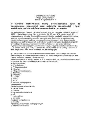 ZARZĄDZENIE 1/2016 Wójta Gminy Manowo z dnia 4 stycznia 2016 r. w sprawie maksymalnej kwoty dofinansowania opłat za doskonalenie nauczycieli oraz ustalenia specjalności i form kształcenia, na które dofinansowanie jest przyznawane. Na podstawie art. 70a ust. 1 w związku z art. 91 d pkt 1 ustawy z dnia 26 stycznia 1982 r. Karta Nauczyciela (Dz. U. z 2006 r. Nr 97 poz. 674, z późn. zm.) § 7 rozporządzenia Ministra Edukacji Narodowej i Sportu z dnia 29 marca 2002 roku w sprawie sposobu podziału środków na wspieranie doskonalenia zawodowego nauczycieli pomiędzy budżety poszczególnych wojewodów, form doskonalenia zawodowego dofinansowanych ze środków wyodrębnionych w budżetach organów prowadzących szkoły, wojewodów ministra właściwego do spraw oświaty i wychowania oraz szczegółowych kryteriów i trybu przyznawania tych środków (Dz. U. z 2002 r. Nr 46, poz. 430) i uchwały Nr XIV/107/2007 Rady Gminy Manowo z dnia 28 grudnia 2007 roku zarządza się co następuje: § 1. Ustala się plan dofinansowania form doskonalenia zawodowego nauczycieli zatrudnionych w szkołach i przedszkolach, dla których organem prowadzącym jest Gmina Manowo, zgodnie z załącznikiem. 1.Dofinansowanie o którym mowa w § 1 powinno być na zasadach priorytetowych przyznane dla nauczycieli kształcących się na kierunkach: a) Język angielski , b) Psychologia, c) Tyflopedagogika, d) Sztuka, e) Oligofrenopedagogika, f) Technika, g) Plastyka h) ADHD, i) Etyka, j) WOS k) Terapia pedagogiczna, l) Logopedia. ł) nauczanie wczesnoszkolne, m) Język polski n) historia o) zarządzanie w oświacie p) wf r) matematyka s) przyroda t) zajęcia komputerowe u) muzyka w) rozwój umiejętności pedagogicznych y) bibliotekoznawstwo 2.Dysponentami środków, o których mowa w § 1są dyrektorzy szkół i przedszkoli. § 2. 1.Maksymalna kwota dofinansowania opłat za kształcenie pobieranych przez uczelnie wyższe i zakłady kształcenia nauczycieli wynosi: maksymalnie 80% kosztów kształcenia, nie więcej niż 1 000,00 zł za semestr. 2.Dofinansowanie szkoleń może być całkowite lub częściowe, jednakże nie może przekraczać kwoty 300,00 zł za jedno szkolenie. W przypadku dofinansowania kursów kwalifikacyjnych określony limit dotyczy każdego semestru. § 3. Zarządzenie wchodzi w życie z dniem 1 stycznia 2016 roku i obowiązuje do końca roku kalendarzowego. załącznik PLAN DOFINANSOWANIA FORM DOSKONALENIA ZAWODOWEGO NAUCZYCIELI ZATRUDNIONYCH W PLACÓWKACH OŚWIATOWYCH PROWADZONYCH PRZEZ GMINĘ MANOWO NA ROK 2016 Nazwa formy doskonalenia zawodowego nauczycieli 1 Organizacja doradztwa metodycznego dla nauczycieli Organizacja szkoleń, seminariów, konferencji szkoleniowych, warsztatów metodycznych i przedmiotowych oraz innych form doskonalenia zawodowego nauczycieli, w tym przygotowanie materiałów szkoleniowych i informacyjnych Szkolenie rad pedagogicznych Opłaty za kształcenie pobierane przez szkoły wyższe i zakłady kształcenia nauczycieli Opłaty za kursy kwalifikacyjne i doskonalące, seminaria oraz inne formy doskonalenia zawodowego. Szkoła Podstawowa w Rosnowie 2 0%* Szkoła Podstawowa w Boninie 3 0%* Gimnazjum w Manowie 4 0%* Przedszkole Gminne w Boninie 5 0%* Przedszkole Samorządowe w Rosnowie 6 0%* 0%* 0%* 10%* 30%* 10%* 0%* 0%* 0%* 0%* 0%* 100%* 45%* 60%* 40%* 30%* 0%* 35%* 30%* 30%* 45%* Koszty przejazdów oraz zakwaterowania i wyżywienia nauczycieli, Podsumowanie 0%* 20%* 0%* 0%* 15%* 100%* 100%* 100%* 100%* 100%* *udział % w rocznej kwocie zaplanowanej w budżecie Gminy Manowo przewidzianej na doskonalenie zawodowe nauczycieli w danej placówce na rok 2016.