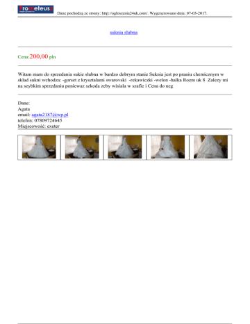 Dane pochodzą ze strony: http://ogloszenia24uk.com/. Wygenerowano dnia: 07-03-2017. suknia slubna Cena:200,00 pln Witam mam do sprzedania sukie slubna w bardzo dobrym stanie Suknia jest po praniu chemicznym w sklad sukni wchodza: -gorset z krysztalami swarovski -rekawiczki -welon -halka Rozm uk 8 Zalezy mi na szybkim sprzedaniu poniewaz szkoda zeby wisiala w szafie i Cena do neg Dane: Agata email: [email protected] telefon: 07809724645 Miejscowość: exeter