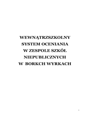 WEWNĄTRZSZKOLNY SYSTEM OCENIANIA W ZESPOLE SZKÓŁ NIEPUBLICZNYCH W BORKCH WYRKACH 1 I. Zasady ogólne oceniania wewnątrzszkolnego 1. Ocenianie wewnątrzszkolne osiągnięć edukacyjnych ucznia regulowane przez przepisy prawa oświatowego polega na rozpoznawaniu przez nauczycieli poziomu i postępów w opanowaniu przez ucznia wiadomości i umiejętności w stosunku do wymagań edukacyjnych wynikających z programów nauczania oraz formowania oceny. 2. Cele oceniania wewnątrzszkolnego: poinformowanie ucznia o poziomie jego osiągnięć edukacyjnych i postępów w tym zakresie; pomoc uczniowi w samodzielnym planowaniu swojego rozwoju; motywowanie ucznia do dalszej pracy; dostarczanie rodzicom (opiekunom prawnym) i nauczycielom informacji o postępach, trudnościach lub specjalnych uzdolnieniach ucznia; umożliwianie nauczycielom doskonalenia organizacji i metod pracy dydaktyczno wychowawczej. 3. Ocenianie wewnątrzszkolne przeprowadzają nauczyciele uczący w oddziale. 4. Zasady ocenianie z religii (etyki) regulują odrębne przepisy. II. Jawność ocen 1. Nauczyciele na początku każdego roku szkolnego informują uczniów oraz rodziców (prawnych opiekunów) o wymaganiach edukacyjnych wynikających z realizowanego przez siebie programu nauczania oraz o sposobach sprawdzania osiągnięć edukacyjnych ucznia. 2. Wychowawca klasy na początku każdego roku szkolnego informuje uczniów oraz rodziców (prawnych opiekunów) o zasadach oceniania zachowania. 3. Oceny są jawne zarówno dla ucznia, jak i jego rodziców (prawnych opiekunów). 4. Na prośbę ucznia lub jego rodziców (prawnych opiekunów) nauczyciel ustalający ocenę powinien ją uzasadnić. 5. Wychowawca klasy organizuje przynajmniej 2 razy w ciągu semestru spotkania z rodzicami, na których obok głównego tematu spotkania jest zobowiązany przedstawić bieżącą analizę pracy klasy i postępów edukacyjnych poszczególnych uczniów i ich zachowania. 6. Wychowawca klasy i nauczyciele przedmiotów wpisują na bieżąco w dzienniczkach ucznia, indeksach (forma uzgodniona z uczniami i rodzicami) uzyskane przez uczniów oceny, dla wiadomości ucznia i jego rodziców. 2 7. Nauczyciele poszczególnych przedmiotów w godzinach dyżurów (wg grafiku) będą udzielać rodzicom informacji o ocenach poszczególnych uczniów oraz informacji o zachowaniu ucznia na terenie szkoły. 8. Sprawdzone i ocenione pisemne prace kontrolne uczeń i jego rodzice (prawni opiekunowie) otrzymują do wglądu na zasadach określonych przez nauczycieli: a) po sprawdzeniu i ocenie prac nauczyciel omawia je wspólnie z uczniami , dokonuje analizy, określa pozytywne strony prac i ich mankamenty; b) każdy uczeń ma do dyspozycji czas na analizę swojej pracy: w czasie zajęć po ogólnym omówieniu wartości prac przez nauczyciela; w domu, gdy nauczyciel przekazuje pracę uczniowi i nie korzysta z możliwości zostawiania pracy w szkole; uczeń ma prawo zgłaszać wątpliwości i pytania dotyczące uzasadniania oceny sprawdzonej pracy: nauczyciel powinien w takiej sytuacji dokładnie poinformować ucznia o swoich zastrzeżeniach i sposobach poprawy pracy przez ucznia w określonym czasie; c) rodzice mają możliwość wglądu w ocenione i sprawdzone prace uczniów (jeżeli nauczyciele pozostawili je w szkole, po uprzednim zapoznaniu uczniów z wynikami prac) podczas wizyt w szkole i kontaktów z nauczycielami przedmiotów, w czasie spotkań z wychowawcami klas, podczas spotkań klasowych rodziców, w czasie wizyt domowych nauczycieli; d) jeżeli nauczyciel oddaje uczniowi sprawdzoną i ocenioną pracę kontrolną do domu, może poprosić o jej zwrot z adnotacją od rodziców o zapoznaniu się z oceną i jej uzasadnieniem. III. Dostosowanie wymagań 1. Kryteria ocen z poszczególnych przedmiotów powinny uwzględniać zdolności poszczególnych uczniów i odnosić ocenę do danego ucznia. 2. Przy ustalaniu oceny z wychowania fizycznego, techniki, muzyki i plastyki bierze się przede wszystkim pod uwagę wysiłek wkładany przez ucznia i wywiązywanie się z obowiązków wynikających ze specyfiki tych zajęć. 3. Dyrektor szkoły zwalnia ucznia z zajęć wychowania fizycznego, zajęć komputerowych, informatyki lub technologii informacyjnej na podstawie opinii o ograniczonych możliwościach uczestniczenia ucznia w tych zajęciach, wydanej przez lekarza, na czas określony w tej opinii. 3 a). jeżeli okres zwolnienia ucznia z zajęć wychowania fizycznego, zajęć komputerowych, informatyki lub technologii informacyjnej uniemożliwia ustalenie śródrocznej lub rocznej (semestralnej) oceny klasyfikacyjnej, w dokumentacji przebiegu nauczania zamiast oceny klasyfikacyjnej wpisuje się „zwolniony” albo „zwolniona”. 4. Dyrektor szkoły, na wniosek rodziców (prawnych opiekunów) oraz na podstawie opinii poradni psychologiczno-pedagogicznej, w tym poradni specjalistycznej, zwalnia do końca danego etapu edukacyjnego ucznia z wadą słuchu, z głęboką dysleksją rozwojową, z afazją, z niepełnosprawnościami sprzężonymi lub z autyzmem, w tym z zespołem Aspergera, z nauki drugiego języka obcego. a). w przypadku ucznia, o którym mowa w pkt.4 posiadającego orzeczenie o potrzebie kształcenia specjalnego albo indywidualnego nauczania, zwolnienie z nauki drugiego języka obcego może nastąpić na podstawie tego orzeczenia. b). w przypadku zwolnienia ucznia z nauki drugiego języka obcego w dokumentacji przebiegu nauczania zamiast oceny klasyfikacyjnej wpisuje się „zwolniony” albo „zwolniona”. 5. Uczniowie klas I - III szkoły podstawowej z trudnościami w nabywaniu wiedzy i umiejętności mogą korzystać z prowadzonych przez szkołę zajęć wyrównawczych. 6. Dla uczniów klas I - III szkoły podstawowej z wadami fizycznymi określonymi przez lekarza szkoła organizuje zajęcia korekcyjne. 7. Dla uczniów niepełnosprawnych, w oparciu i opinię poradni psychologiczno pedagogicznej potwierdzoną przez organ nadzorujący, szkoła organizuj