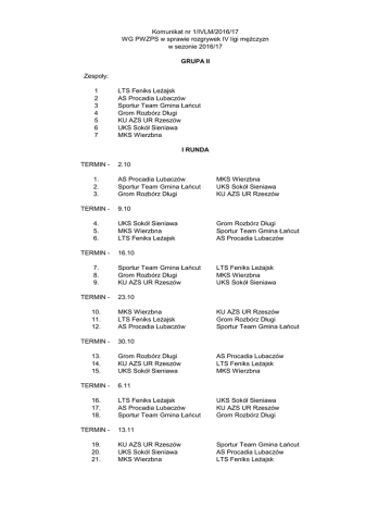 Komunikat nr 1/IVLM/2016/17 WG PWZPS w sprawie rozgrywek IV ligi mężczyzn w sezonie 2016/17 GRUPA II Zespoły: 1 2 3 4 5 6 7 LTS Feniks Leżajsk AS Procadia Lubaczów Sportur Team Gmina Łańcut Grom Rozbórz Długi KU AZS UR Rzeszów UKS Sokół Sieniawa MKS Wierzbna I RUNDA TERMIN 1. 2. 3. TERMIN 4. 5. 6. TERMIN 7. 8. 9. TERMIN 10. 11. 12. TERMIN 13. 14. 15. TERMIN 16. 17. 18. TERMIN 19. 20. 21. 2.10 AS Procadia Lubaczów Sportur Team Gmina Łańcut Grom Rozbórz Długi MKS Wierzbna UKS Sokół Sieniawa KU AZS UR Rzeszów 9.10 UKS Sokół Sieniawa MKS Wierzbna LTS Feniks Leżajsk Grom Rozbórz Długi Sportur Team Gmina Łańcut AS Procadia Lubaczów 16.10 Sportur Team Gmina Łańcut Grom Rozbórz Długi KU AZS UR Rzeszów LTS Feniks Leżajsk MKS Wierzbna UKS Sokół Sieniawa 23.10 MKS Wierzbna LTS Feniks Leżajsk AS Procadia Lubaczów KU AZS UR Rzeszów Grom Rozbórz Długi Sportur Team Gmina Łańcut 30.10 Grom Rozbórz Długi KU AZS UR Rzeszów UKS Sokół Sieniawa AS Procadia Lubaczów LTS Feniks Leżajsk MKS Wierzbna 6.11 LTS Feniks Leżajsk AS Procadia Lubaczów Sportur Team Gmina Łańcut UKS Sokół Sieniawa KU AZS UR Rzeszów Grom Rozbórz Długi 13.11 KU AZS UR Rzeszów UKS Sokół Sieniawa MKS Wierzbna Sportur Team Gmina Łańcut AS Procadia Lubaczów LTS Feniks Leżajsk II RUNDA TERMIN 22. 23. 24. TERMIN 25. 26. 27. TERMIN 28. 29. 30. TERMIN 31. 32. 33. TERMIN 34. 35. 36. TERMIN 37. 38. 39. TERMIN 40. 41. 42. 20.11 MKS Wierzbna UKS Sokół Sieniawa KU AZS UR Rzeszów AS Procadia Lubaczów Sportur Team Gmina Łańcut Grom Rozbórz Długi 27.11 Grom Rozbórz Długi Sportur Team Gmina Łańcut AS Procadia Lubaczów UKS Sokół Sieniawa MKS Wierzbna LTS Feniks Leżajsk 4.12 LTS Feniks Leżajsk MKS Wierzbna UKS Sokół Sieniawa Sportur Team Gmina Łańcut Grom Rozbórz Długi KU AZS UR Rzeszów 11.12 KU AZS UR Rzeszów Grom Rozbórz Długi Sportur Team Gmina Łańcut MKS Wierzbna LTS Feniks Leżajsk AS Procadia Lubaczów 18.12 AS Procadia Lubaczów LTS Feniks Leżajsk MKS Wierzbna Grom Rozbórz Długi KU AZS UR Rzeszów UKS Sokół Sieniawa 8.01 UKS Sokół Sieniawa KU AZS UR Rzeszów Grom Rozbórz Długi LTS Feniks Leżajsk AS Procadia Lubaczów Sportur Team Gmina Łańcut 15.01 Sportur Team Gmina Łańcut AS Procadia Lubaczów LTS Feniks Leżajsk KU AZS UR Rzeszów UKS Sokół Sieniawa MKS Wierzbna