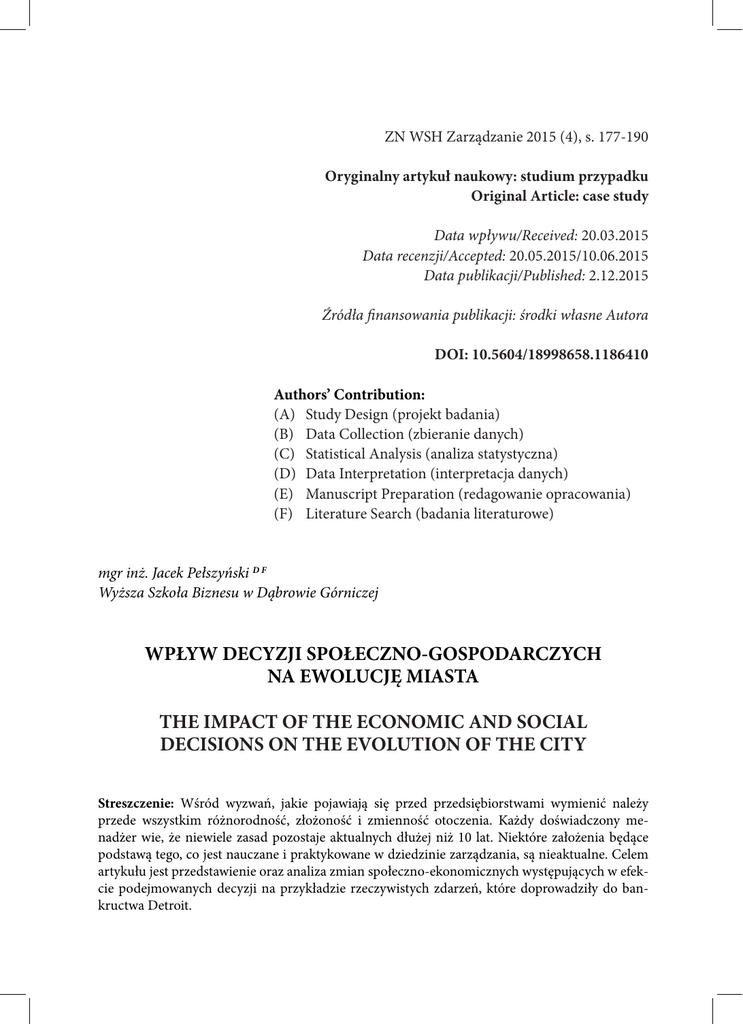 ZN WSH Zarządzanie 2015 (4), s. 177-190 Oryginalny artykuł naukowy: studium przypadku Original Article: case study Data wpływu/Received: 20.03.2015 Data recenzji/Accepted: 20.05.2015/10.06.2015 Data publikacji/Published: 2.12.2015 Źródła finansowania publikacji: środki własne Autora DOI: 10.5604/18998658.1186410 Authors’ Contribution: (A) Study Design (projekt badania) (B) Data Collection (zbieranie danych) (C) Statistical Analysis (analiza statystyczna) (D) Data Interpretation (interpretacja danych) (E) Manuscript Preparation (redagowanie opracowania) (F) Literature Search (badania literaturowe) mgr inż. Jacek Pełszyński D F Wyższa Szkoła Biznesu w Dąbrowie Górniczej WPŁYW DECYZJI SPOŁECZNO-GOSPODARCZYCH NA EWOLUCJĘ MIASTA THE IMPACT OF THE ECONOMIC AND SOCIAL DECISIONS ON THE EVOLUTION OF THE CITY Streszczenie: Wśród wyzwań, jakie pojawiają się przed przedsiębiorstwami wymienić należy przede wszystkim różnorodność, złożoność i zmienność otoczenia. Każdy doświadczony menadżer wie, że niewiele zasad pozostaje aktualnych dłużej niż 10 lat. Niektóre założenia będące podstawą tego, co jest nauczane i praktykowane w dziedzinie zarządzania, są nieaktualne. Celem artykułu jest przedstawienie oraz analiza zmian społeczno-ekonomicznych występujących w efekcie podejmowanych decyzji na przykładzie rzeczywistych zdarzeń, które doprowadziły do bankructwa Detroit. 178 Zeszyty Naukowe Wyższej Szkoły Humanitas. Zarządzanie Słowa kluczowe: przedsiębiorstwo, wartości, społeczeństwo obywatelskie, rozwój, zarządzanie. Abstract: Among challenges, which enterprises face, we should specify environment diversity, complexity and fluidity, most of all. Every seasoned manager has learned that few policies remain valid for as long as 10 years. The basic assumptions underlying much of what is taught and practiced in the name of management are out of date. The objective of the article is to provide and analyze the socio-economic changes occurring as a result of decisions by the example of the actual events that led to the bankruptcy of Detroit. Keywords: company, values, civil society, development, management. Wstęp W organizacjach, które podejmują działania związane z wdrażaniem oraz racjonalizacją przedsięwzięć ekonomiczno-społecznych, zarządzanie powinno być oparte na podstawach teoretycznych opracowanych przez naukowców. W związku z tym, że istnieje wiele teorii związanych z zarządzaniem wdrażanie poszczególnych rozwiązań jest przyczyną licznych dyskusji oraz sporów powstających w środowisku naukowców, polityków oraz przedsiębiorców. W efekcie czego znaczącym elementem w procesie podejmowania decyzji w organizacji jest pozyskanie wiedzy z różnych źródeł oraz tworzenie nowych rozwiązań. Jak pisze w swojej książce M. Eraut, umiejętność wykorzystywania nowej wiedzy w sposób stosowny do konkretnej sytuacji pociąga za sobą umiejętność wytwarzania nowej wiedzy dotyczącej sposobu, w jaki można to osiągnąć1. Zarządzanie oparte na wiedzy i doświadczeniu osób odpowiedzialnych za przedsięwzięcia gospodarcze oprócz czynników ekonomicznych jest uzależnione od ograniczeń formalnoprawnych oraz woli społeczeństwa reprezentowanego przez polityków. W coraz większym stopniu jest związane z zarządzaniem ciągłymi zmianami. Globalizacja i wdrażanie nowych technologii zmienia akceptowane wcześniej standardy. W związku ze zmieniającym się otoczeniem gospodarczym osoby odpowiedzialne za zarządzanie procesami gospodarczymi nurtuje pytanie, które polega na próbie rozstrzygnięcia, czy efektywne gospodarczo pod względem ekonomicznym zarządzanie można pogodzić z zrównoważonym rozwojem. Czy podejmowane decyzje związane z procesem gospodarowania mogą być wspierane przez realizację celów związanych ze sprawiedliwym społecznie podziałem? Przyczyną zadawania wymienionych powyżej pytań jest niewystarczająca ilość dóbr i zasobów spowodowana stale rosnącymi potrzebami. Dążenie społeczeństwa do zaspokojenia swoich nieograniczonych potrzeb wywołuje konflikty pomiędzy właścicielami środków produkcji i pracownikami niezbędnymi do wytworzenia dóbr. Istotnym aspektem jest również realizacja procesu podziału wypracowanych zysków, który obejmuje swym zasięgiem nie tylko wymienione powyżej grupy, lecz również szeroko rozumiane grono interesariuszy. Dążenie do poprawy warunków życia jest podstawowym powodem mobilizują M. Eraut, Developing Professional Knowledge and Competence, Allen & Uniwin, London 1996, s. 54. 1 Wpływ decyzji społeczno-gospodarczych na ewolucję miasta 179 cym jednostki do eksploatowania zasobów naturalnych i tworzenia uregulowań prawnych. Nieograniczone dążenie do poprawy warunków życia przez poszczególne jednostki (ludzi i organizacje) powoduje, że niewłaściwe zarządzanie może doprowadzić do bankructwa w skali szerszej niż tylko przedsiębiorstwo. Społeczeństwa, aby mogły się rozwijać, dążą do wprowadzania zmian, jak również osiągnięcia stabilizacji, co powoduje ewoluowanie wcześniej wypracowanych założeń. Skłonność tę przedstawił P. Drucker, wskazując, że świat, jaki tworzą ludzie, w przeciwieństwie do wszechświata, nie rządzi się prawami natury, stąd ulega ciągłym przemianom. W konsekwencji założenia, które obowiązywały w przeszłości, mogą ulec dezaktualizacji w krótkim okresie 2. Sytuacja taka powoduje, że zmieniające się warunki oddziałują na zmianę zachowania poszczególnych uczestników procesu gospodarczego i kreowanie nowych paradygmatów będących odzwierciedleniem zachodzących zmian. Jak pisze T.S. Kuhn w książce pod tytułem „Struktura rewolucji naukowych” wydanej w 1962 roku, paradygmaty mają istotny wpływ na badania naukowe, gdyż „żadna nauka przyrodnicza nie może być wyjaśniana bez zastosowania splecionych teoretycznych i metodologicznych poglądów 