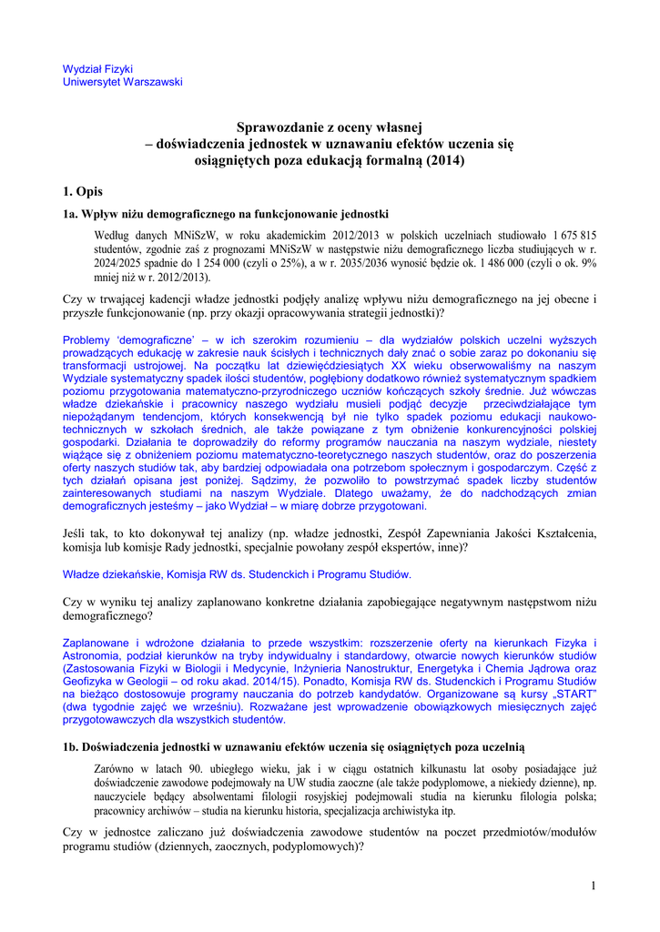Wydział Fizyki Uniwersytet Warszawski Sprawozdanie z oceny własnej – doświadczenia jednostek w uznawaniu efektów uczenia się osiągniętych poza edukacją formalną (2014) 1. Opis 1a. Wpływ niżu demograficznego na funkcjonowanie jednostki Według danych MNiSzW, w roku akademickim 2012/2013 w polskich uczelniach studiowało 1 675 815 studentów, zgodnie zaś z prognozami MNiSzW w następstwie niżu demograficznego liczba studiujących w r. 2024/2025 spadnie do 1 254 000 (czyli o 25%), a w r. 2035/2036 wynosić będzie ok. 1 486 000 (czyli o ok. 9% mniej niż w r. 2012/2013). Czy w trwającej kadencji władze jednostki podjęły analizę wpływu niżu demograficznego na jej obecne i przyszłe funkcjonowanie (np. przy okazji opracowywania strategii jednostki)? Problemy ‘demograficzne’ – w ich szerokim rozumieniu – dla wydziałów polskich uczelni wyższych prowadzących edukację w zakresie nauk ścisłych i technicznych dały znać o sobie zaraz po dokonaniu się transformacji ustrojowej. Na początku lat dziewięćdziesiątych XX wieku obserwowaliśmy na naszym Wydziale systematyczny spadek ilości studentów, pogłębiony dodatkowo również systematycznym spadkiem poziomu przygotowania matematyczno-przyrodniczego uczniów kończących szkoły średnie. Już wówczas władze dziekańskie i pracownicy naszego wydziału musieli podjąć decyzje przeciwdziałające tym niepożądanym tendencjom, których konsekwencją był nie tylko spadek poziomu edukacji naukowotechnicznych w szkołach średnich, ale także powiązane z tym obniżenie konkurencyjności polskiej gospodarki. Działania te doprowadziły do reformy programów nauczania na naszym wydziale, niestety wiążące się z obniżeniem poziomu matematyczno-teoretycznego naszych studentów, oraz do poszerzenia oferty naszych studiów tak, aby bardziej odpowiadała ona potrzebom społecznym i gospodarczym. Część z tych działań opisana jest poniżej. Sądzimy, że pozwoliło to powstrzymać spadek liczby studentów zainteresowanych studiami na naszym Wydziale. Dlatego uważamy, że do nadchodzących zmian demograficznych jesteśmy – jako Wydział – w miarę dobrze przygotowani. Jeśli tak, to kto dokonywał tej analizy (np. władze jednostki, Zespół Zapewniania Jakości Kształcenia, komisja lub komisje Rady jednostki, specjalnie powołany zespół ekspertów, inne)? Władze dziekańskie, Komisja RW ds. Studenckich i Programu Studiów. Czy w wyniku tej analizy zaplanowano konkretne działania zapobiegające negatywnym następstwom niżu demograficznego? Zaplanowane i wdrożone działania to przede wszystkim: rozszerzenie oferty na kierunkach Fizyka i Astronomia, podział kierunków na tryby indywidualny i standardowy, otwarcie nowych kierunków studiów (Zastosowania Fizyki w Biologii i Medycynie, Inżynieria Nanostruktur, Energetyka i Chemia Jądrowa oraz Geofizyka w Geologii – od roku akad. 2014/15). Ponadto, Komisja RW ds. Studenckich i Programu Studiów na bieżąco dostosowuje programy nauczania do potrzeb kandydatów. Organizowane są kursy „START” (dwa tygodnie zajęć we wrześniu). Rozważane jest wprowadzenie obowiązkowych miesięcznych zajęć przygotowawczych dla wszystkich studentów. 1b. Doświadczenia jednostki w uznawaniu efektów uczenia się osiągniętych poza uczelnią Zarówno w latach 90. ubiegłego wieku, jak i w ciągu ostatnich kilkunastu lat osoby posiadające już doświadczenie zawodowe podejmowały na UW studia zaoczne (ale także podyplomowe, a niekiedy dzienne), np. nauczyciele będący absolwentami filologii rosyjskiej podejmowali studia na kierunku filologia polska; pracownicy archiwów – studia na kierunku historia, specjalizacja archiwistyka itp. Czy w jednostce zaliczano już doświadczenia zawodowe studentów na poczet przedmiotów/modułów programu studiów (dziennych, zaocznych, podyplomowych)? 1 Dotychczas na Wydziale Fizyki dotyczyło to tylko zajęć językowych, kursów BHP i praktyk zawodowych. Jeśli tak, to prosimy o przedstawienie przeglądu dotychczasowych praktyk w tym zakresie – sięgający nawet lat 90. i uwzględniający doświadczenia prodziekanów ds. studenckich, dyrektorów ds. studenckich, kierowników studiów podyplomowych, kierowników studiów zaocznych. 2. Dobre praktyki w ocenianej dziedzinie (rozwiązania sprawdzone i godne upowszechnienia) Jakie rozwiązania (procedury) spośród odnotowanych w punkcie 1b. sprawozdania można uznać za rozwiązania sprawdzone i godne upowszechnienia? Uważamy, że godną upowszechnienia praktyką stosowaną na naszym Wydziale jest poszerzanie programów studiów oraz powiązanie ich z badaniami naukowymi u nas prowadzonymi (podkreślmy, badaniami naukowymi prowadzonymi w bardzo silnej konkurencji międzynarodowej, o czym świadczy publikowanie osiągnięć naukowych naszych pracowników i studentów w najlepszych czasopismach naukowych na świecie) oraz wdrażaniem ich w gospodarkę. Bardzo duża część pracowników jak i absolwentów Wydziału Fizyki uważa, że naszych studentów „należy sobie wychować już od najmłodszych lat”. Z tego też względu angażują się Oni w pracę z dziećmi (czasami już w przedszkolach), młodzieżą ze szkół podstawowych i średnich. Wychodzimy z założenia, że do nauk matematyczno-przyrodniczych, a szczególnie do fizyki, należy młode pokolenie Polaków zachęcać już od jak najmłodszych lat. Temu służy działalność np. prof. Bogdana Cichockiego i prof. Konrada Banaszka w „Funduszu na Rzecz Dzieci”, w ramach którego corocznie organizowane są spotkania wyjątkowo uzdolnionej młodzieży z całej Polski z pracownikami naszego Wydziału. Z satysfakcją możemy stwierdzić, że wielu naszych młodych pracowników wywodzi się z tej grupy młodzieży. Dbając również o sprawy finansowe Wydział Fizyki zabiega o pozyskiwanie grantów na działalność promocyjną wśród młodzieży. Przykładem jest Europejski Grant `PhoQuS@UW’, którego g