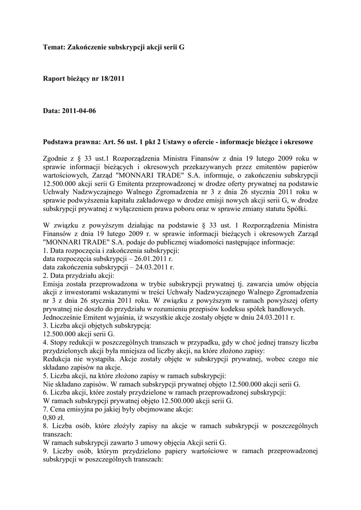 Temat: Zakończenie subskrypcji akcji serii G Raport bieŜący nr 18/2011 Data: 2011-04-06 Podstawa prawna: Art. 56 ust. 1 pkt 2 Ustawy o ofercie - informacje bieŜące i okresowe Zgodnie z § 33 ust.1 Rozporządzenia Ministra Finansów z dnia 19 lutego 2009 roku w sprawie informacji bieŜących i okresowych przekazywanych przez emitentów papierów wartościowych, Zarząd "MONNARI TRADE" S.A. informuje, o zakończeniu subskrypcji 12.500.000 akcji serii G Emitenta przeprowadzonej w drodze oferty prywatnej na podstawie Uchwały Nadzwyczajnego Walnego Zgromadzenia nr 3 z dnia 26 stycznia 2011 roku w sprawie podwyŜszenia kapitału zakładowego w drodze emisji nowych akcji serii G, w drodze subskrypcji prywatnej z wyłączeniem prawa poboru oraz w sprawie zmiany statutu Spółki. W związku z powyŜszym działając na podstawie § 33 ust. 1 Rozporządzenia Ministra Finansów z dnia 19 lutego 2009 r. w sprawie informacji bieŜących i okresowych Zarząd "MONNARI TRADE" S.A. podaje do publicznej wiadomości następujące informacje: 1. Data rozpoczęcia i zakończenia subskrypcji: data rozpoczęcia subskrypcji – 26.01.2011 r. data zakończenia subskrypcji – 24.03.2011 r. 2. Data przydziału akcji: Emisja została przeprowadzona w trybie subskrypcji prywatnej tj. zawarcia umów objęcia akcji z inwestorami wskazanymi w treści Uchwały Nadzwyczajnego Walnego Zgromadzenia nr 3 z dnia 26 stycznia 2011 roku. W związku z powyŜszym w ramach powyŜszej oferty prywatnej nie doszło do przydziału w rozumieniu przepisów kodeksu spółek handlowych. Jednocześnie Emitent wyjaśnia, iŜ wszystkie akcje zostały objęte w dniu 24.03.2011 r. 3. Liczba akcji objętych subskrypcją: 12.500.000 akcji serii G. 4. Stopy redukcji w poszczególnych transzach w przypadku, gdy w choć jednej transzy liczba przydzielonych akcji była mniejsza od liczby akcji, na które złoŜono zapisy: Redukcja nie wystąpiła. Akcje zostały objęte w subskrypcji prywatnej, wobec czego nie składano zapisów na akcje. 5. Liczba akcji, na które złoŜono zapisy w ramach subskrypcji: Nie składano zapisów. W ramach subskrypcji prywatnej objęto 12.500.000 akcji serii G. 6. Liczba akcji, które zostały przydzielone w ramach przeprowadzonej subskrypcji: W ramach subskrypcji prywatnej objęto 12.500.000 akcji serii G. 7. Cena emisyjna po jakiej były obejmowane akcje: 0,80 zł. 8. Liczba osób, które złoŜyły zapisy na akcje w ramach subskrypcji w poszczególnych transzach: W ramach subskrypcji zawarto 3 umowy objęcia Akcji serii G. 9. Liczby osób, którym przydzielono papiery wartościowe w ramach przeprowadzonej subskrypcji w poszczególnych transzach: W ramach subskrypcji zawarto 3 umowy objęcia Akcji serii G. 10. Nazwy (firmy) subemitentów, którzy objęli akcje w ramach wykonywania umów o subemisję, z określeniem liczby akcji, które objęli wraz z faktyczną ceną jednej akcji (tj. ceną emisyjną lub sprzedaŜy po odliczeniu wynagrodzenia za objęcie akcji w wykonaniu umowy subemisji, nabytej przez subemitenta): Emitent nie zawarł umowy o submisję. 11. Wartość przeprowadzonej subskrypcji (stanowiąca iloczyn akcji stanowiących przedmiot subskrypcji i ceny emisyjnej jednej akcji): 10.000.000 zł 12. Łączna wysokość kosztów poniesionych i przewidzianych do poniesienia, które zostaną zaliczone do kosztów emisji wynosi: 102.780,65 zł z czego: a) koszty przygotowania i przeprowadzenia oferty – 1.875,00 zł b) koszty wynagrodzenia subemitentów – 0,00 zł, c) koszty sporządzenia prospektu emisyjnego z uwzględnieniem kosztów doradztwa – 88.560,65 zł, d) koszty promocji oferty – 0,00 zł e) pozostałe koszty emisji (opłaty ewidencyjne, skarbowe, notarialne) wyniosły – 12.345,00 zł. Metoda rozliczenia w księgach i sposób ujęcia w sprawozdaniu finansowym: Koszty emisji akcji ujmowane są w księgach rachunkowych jako zmniejszenie kapitału zapasowego - do wysokości nadwyŜki wartości emisyjnej akcji nad ich wartością nominalną, odniesioną na ten kapitał i tak zostaną zaprezentowane w sprawozdaniach finansowych tj. zestawieniu zmian w kapitale własnym oraz sprawozdaniu z pozycji finansowej (pasywa – kapitały własne). Wydatki z tego tytułu pomniejszają wpływy z wydania akcji w sprawozdaniu z przepływów pienięŜnych (prezentacja wpływów netto). 13. Średni koszt przeprowadzenia subskrypcji przypadający na jedną Akcję serii G objętą subskrypcją wynosi poniŜej 0,01 zł.